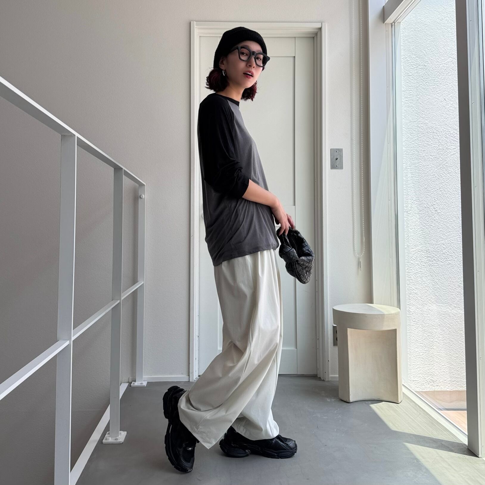 シンプルなラグランデザインに女性らしいシアー感をプラスしたルーズtee。袖丈もあえて長くデザインされており1枚でも様になるトップスです。ゆとりのあるサイズ感なのでリラックスした着心地もポイント。着回し力バツグンなのでデニムやフレアスカートなどボトムを選ばないデザインです。