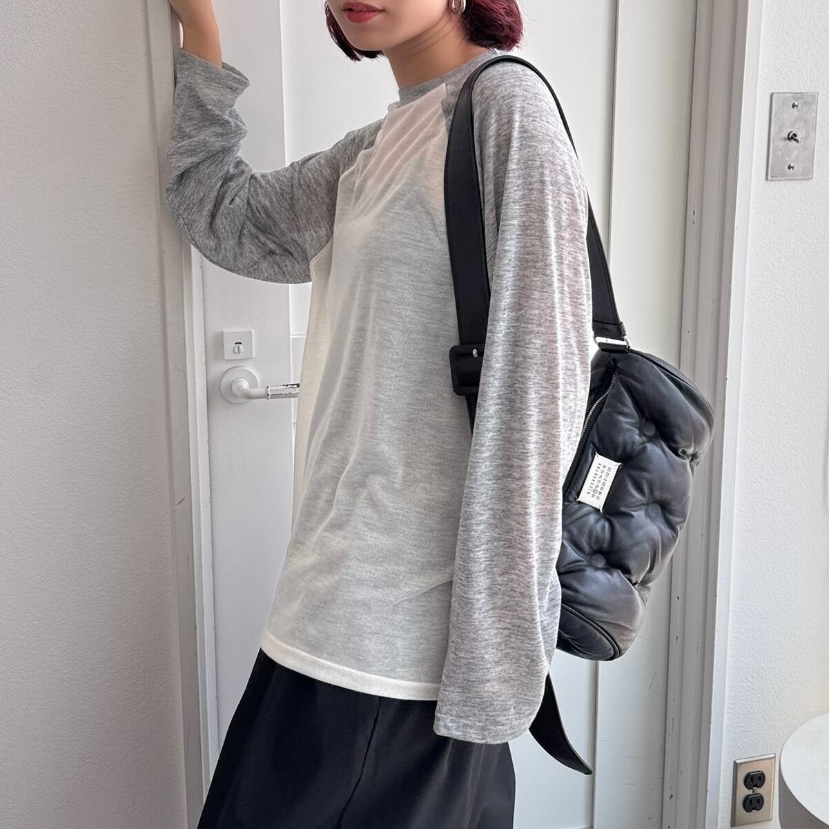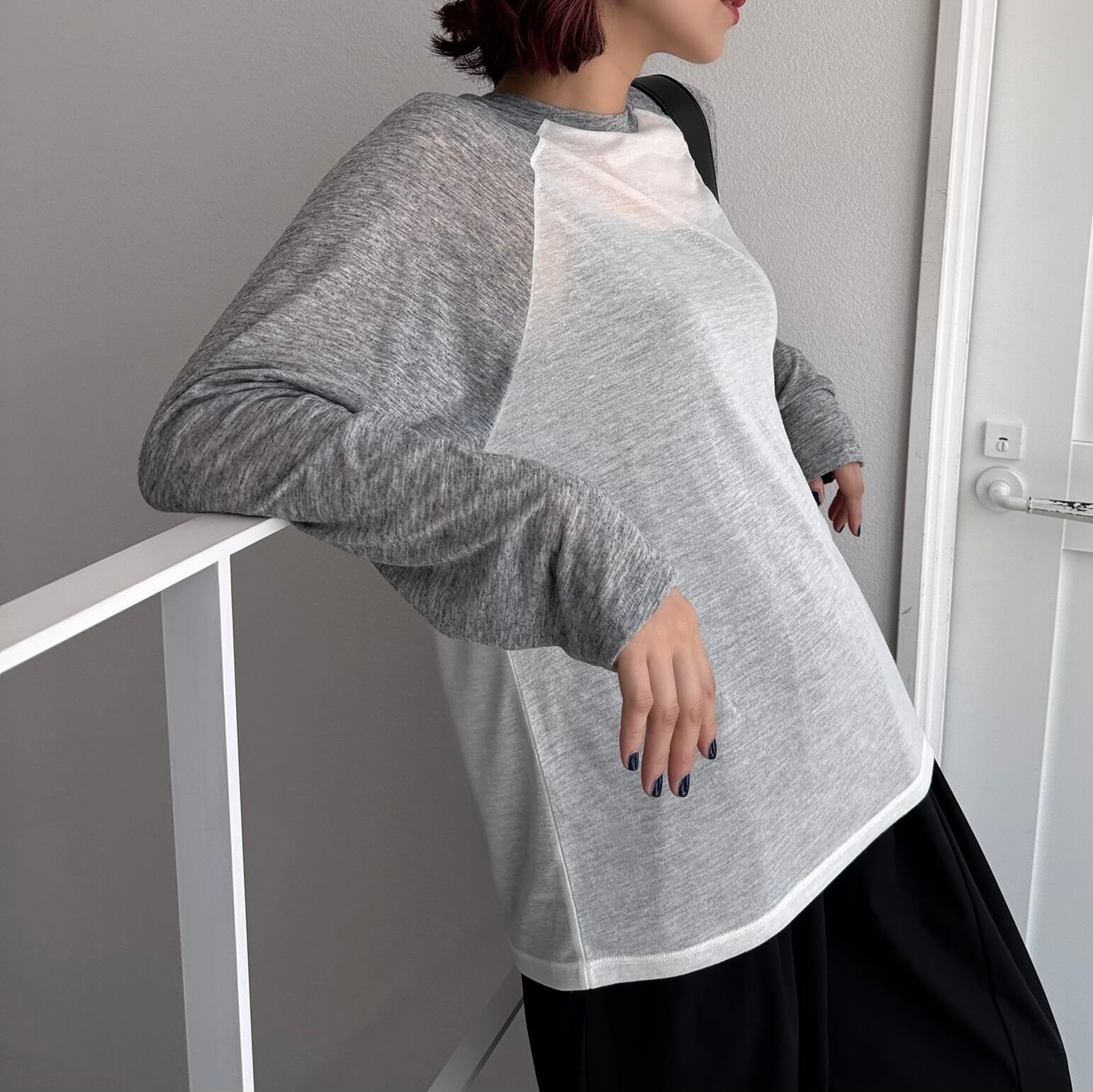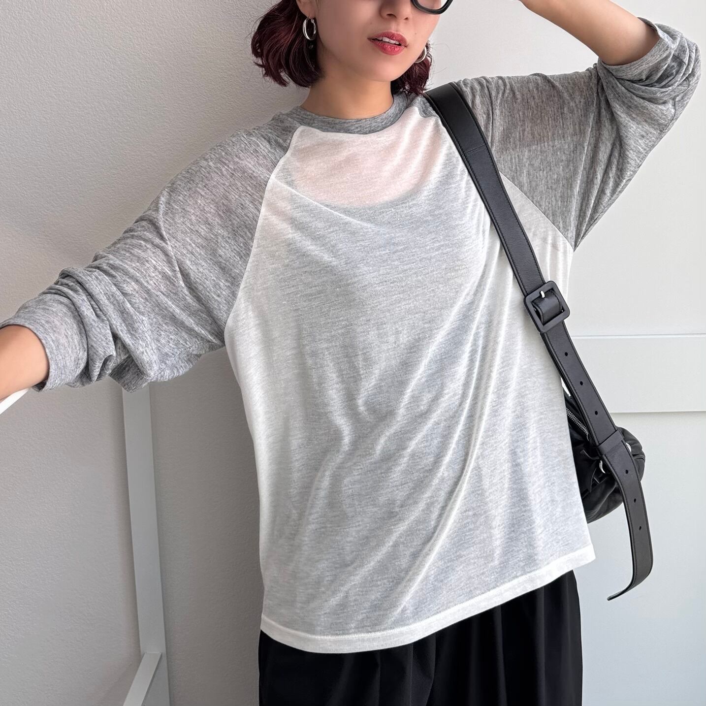 シンプルなラグランデザインに女性らしいシアー感をプラスしたルーズtee。袖丈もあえて長くデザインされており1枚でも様になるトップスです。ゆとりのあるサイズ感なのでリラックスした着心地もポイント。着回し力バツグンなのでデニムやフレアスカートなどボトムを選ばないデザインです。