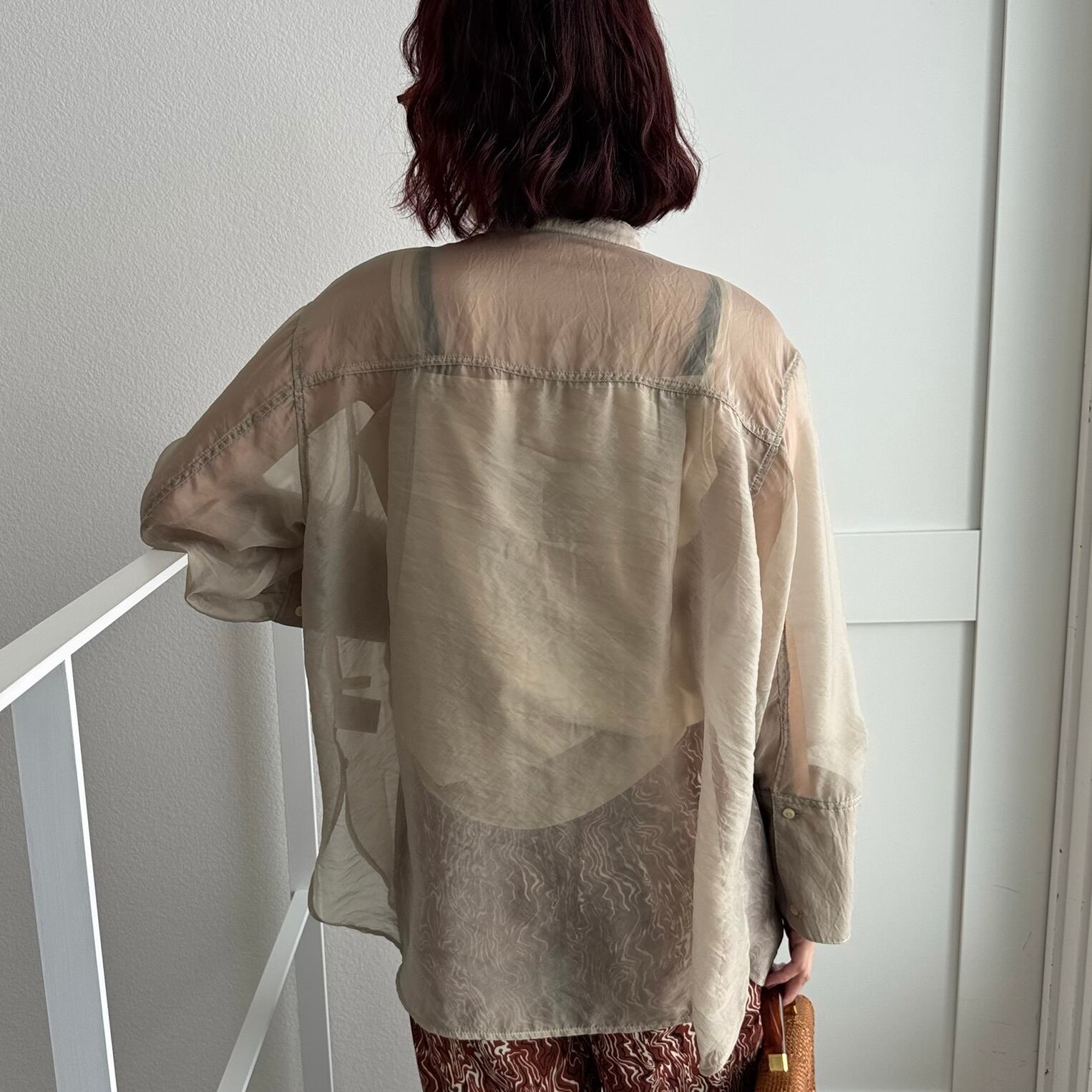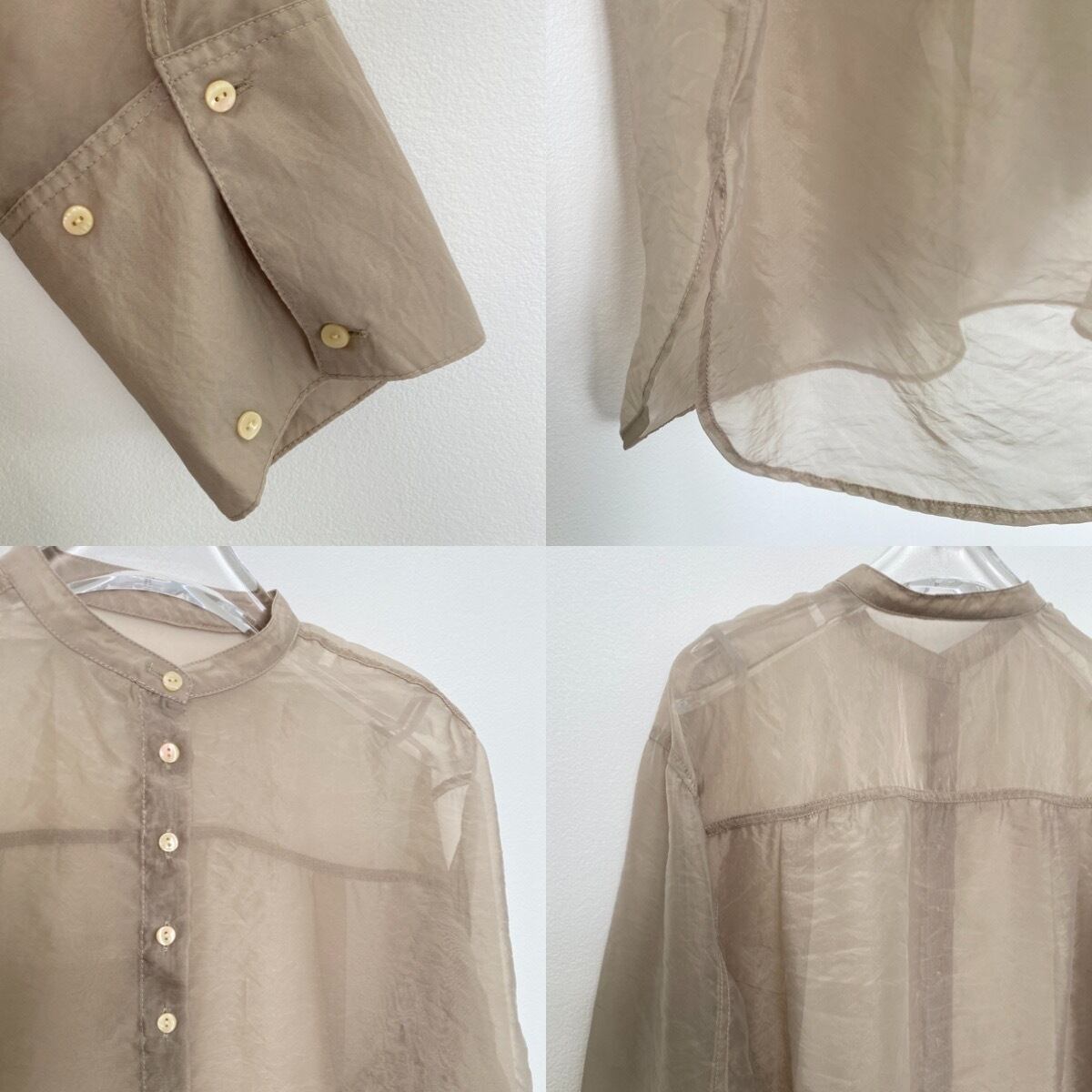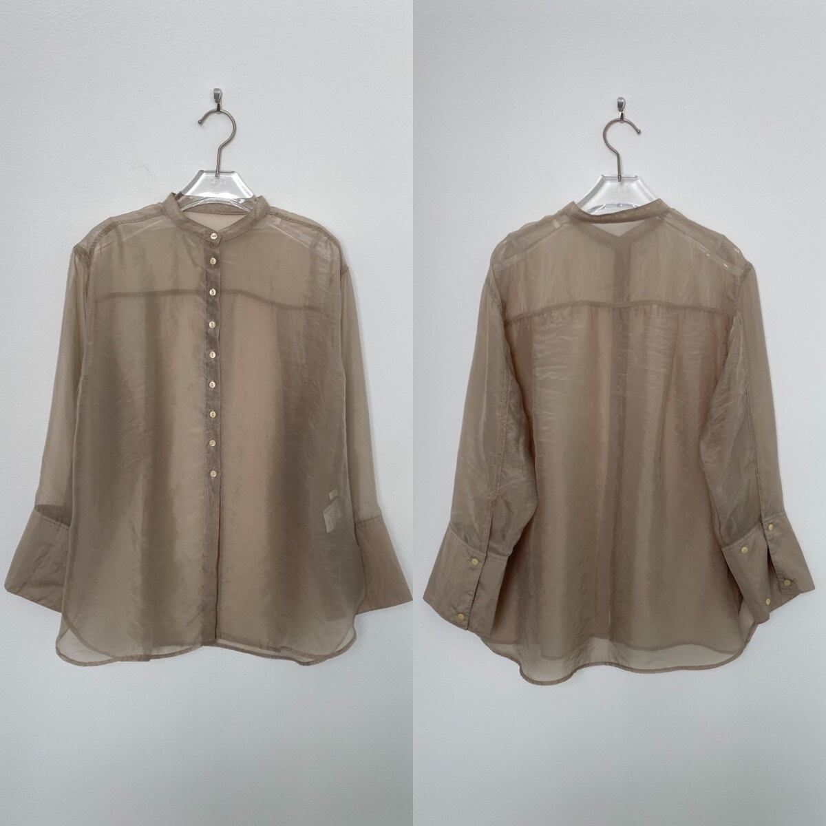 程よい光沢感のあるシャツ。やや長めなワイド袖口がポイントです。2段階で袖幅が調節できるようカフスのボタンがあしらわれています。首元はスッキリとしたノーカラータイプ。タンクやキャミソールはもちろん、肌寒い季節は薄手のタートルを合わせてレイヤードスタイルも楽しめる1枚。