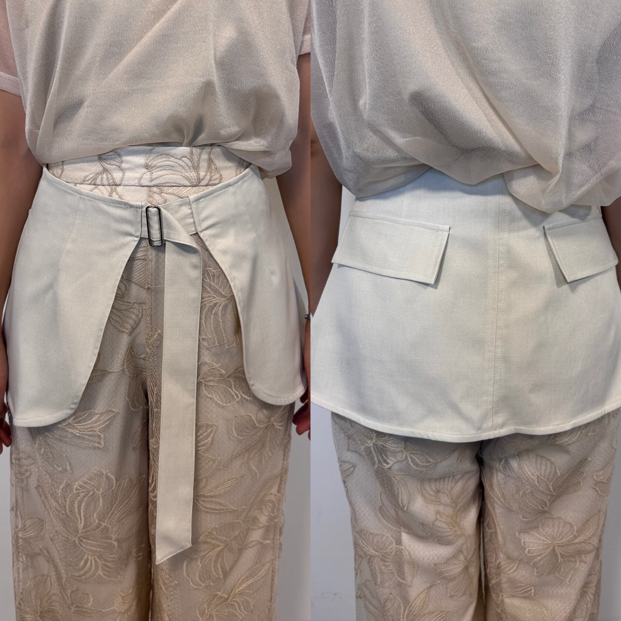 スタイリングのプラスワンアイテムとして取り入れていただきたいラップベルト。ボトムの上に重ねてポイントになるよう、レイヤードスカート風に。フロントのベルト位置でウエスト調節できます。シンプルなロングスカートやスラックスパンツと合わせることで新鮮なスタイリングに仕上がります。ワンピースのウエストマークとして合わせていただくのもオススメ。