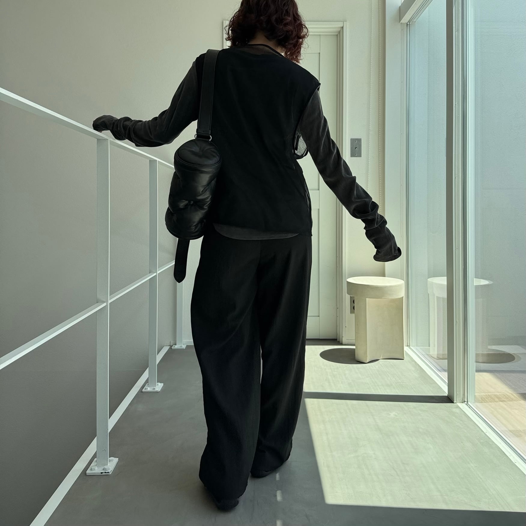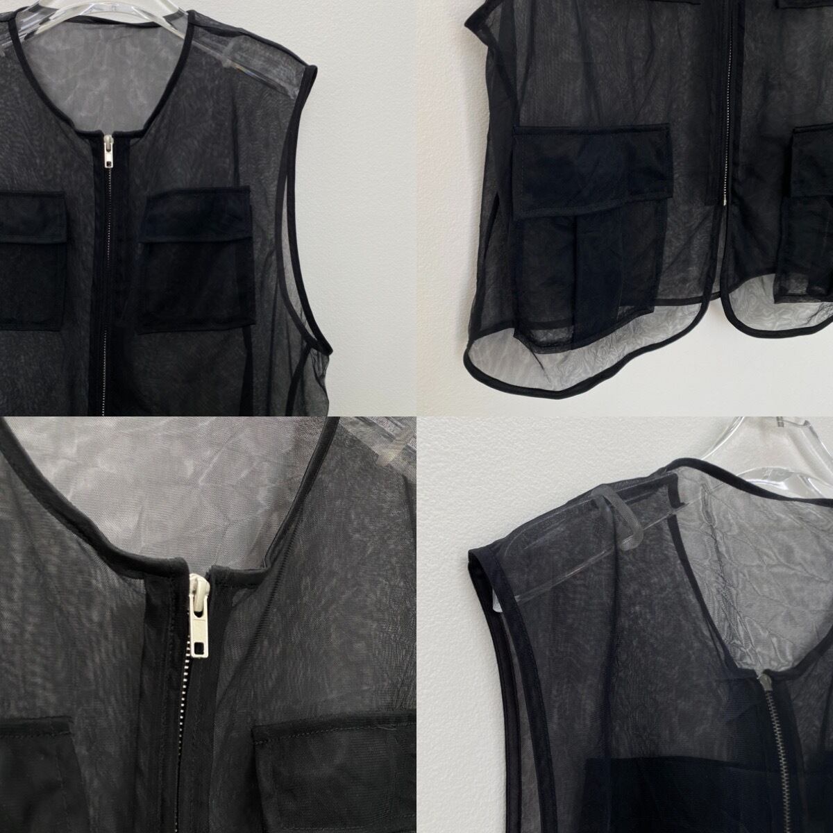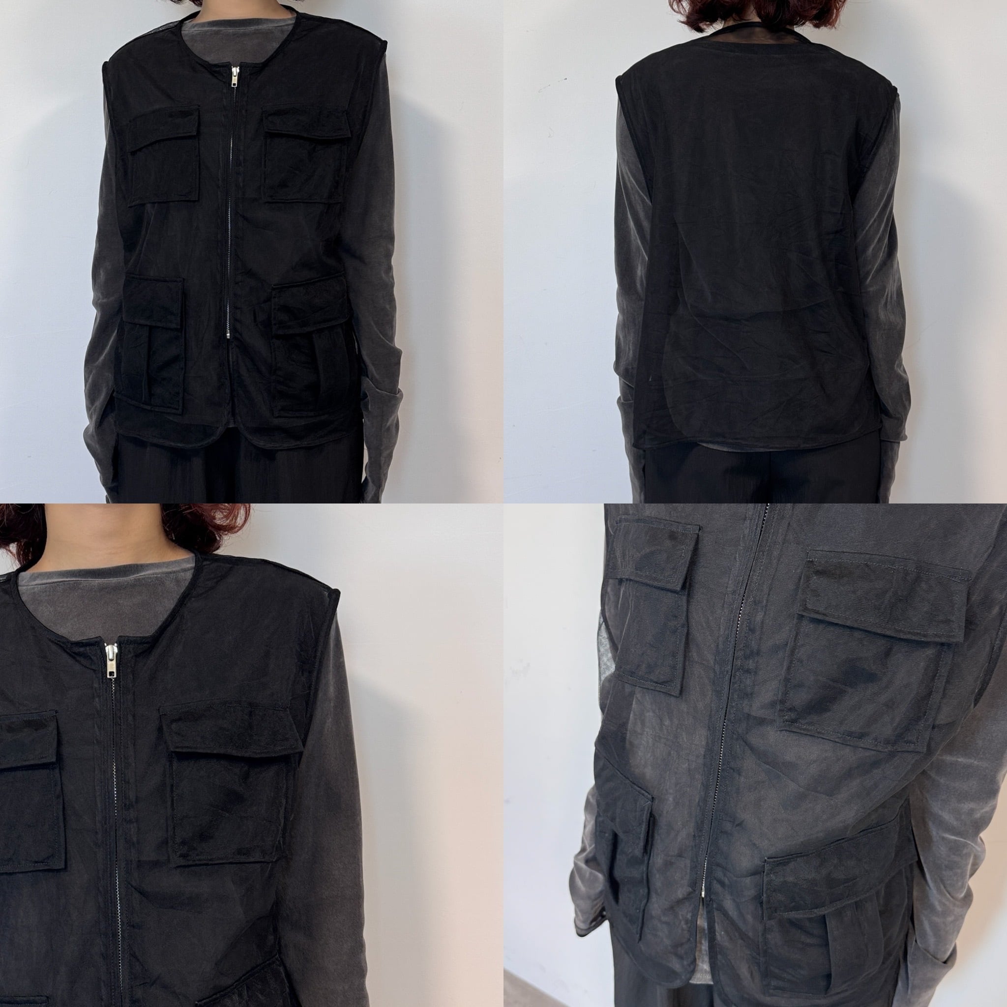 トレンドのチュール素材のミリタリーベスト。メンズライクなイメージのあるミリタリーデザインも生地をチュール素材にする事により甘さをプラス。涼し気な生地なので暑い時期でも可愛くレイヤードできます。寒くなるとタイトめなニットとレイヤードして異素材コーデもおすすめ。長くご使用いただけます。