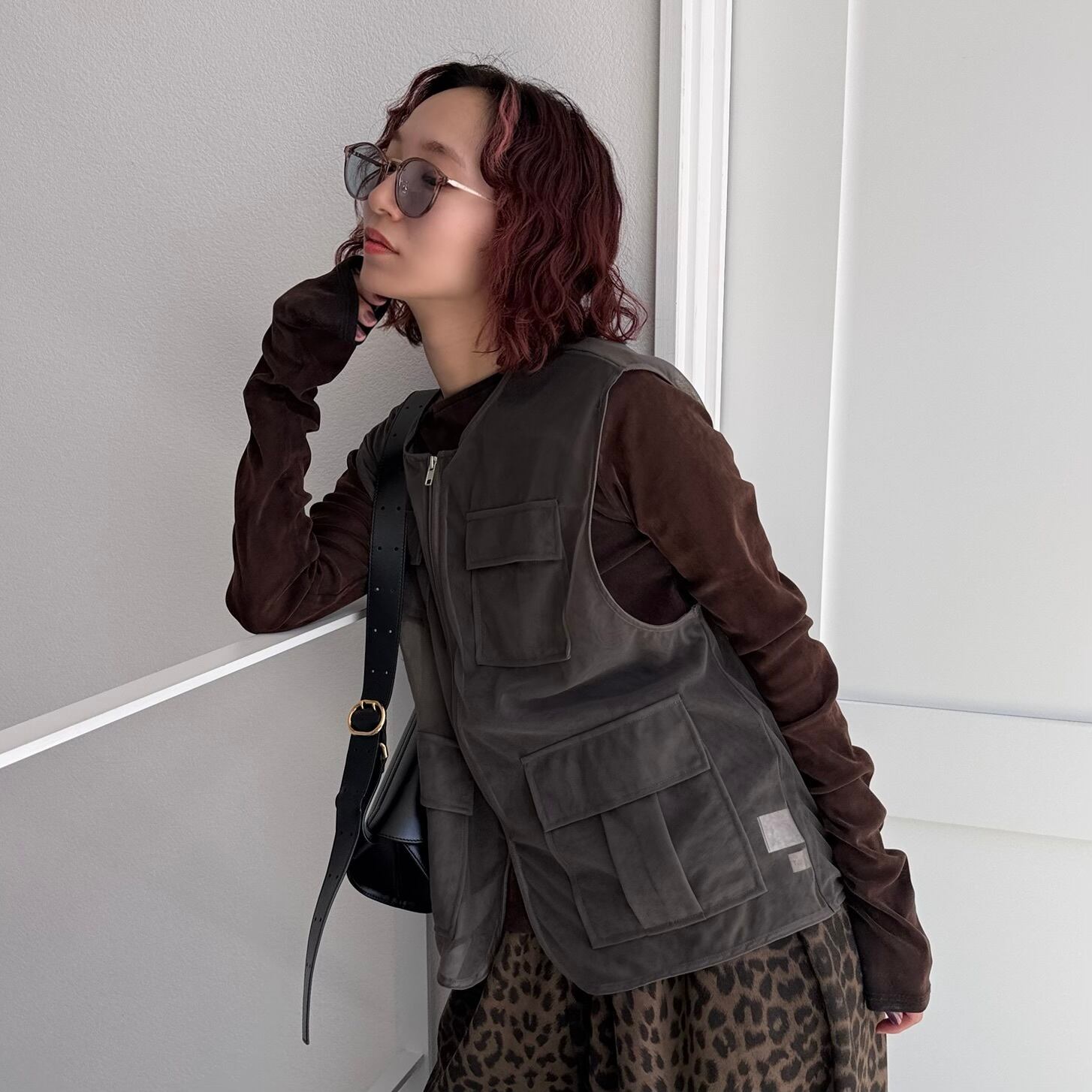 トレンドのチュール素材のミリタリーベスト。メンズライクなイメージのあるミリタリーデザインも生地をチュール素材にする事により甘さをプラス。涼し気な生地なので暑い時期でも可愛くレイヤードできます。寒くなるとタイトめなニットとレイヤードして異素材コーデもおすすめ。長くご使用いただけます。