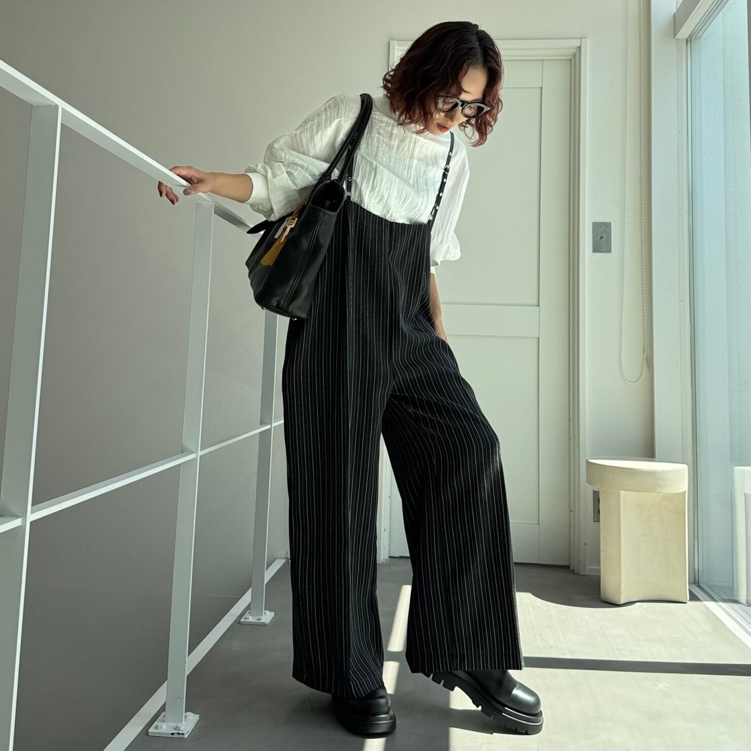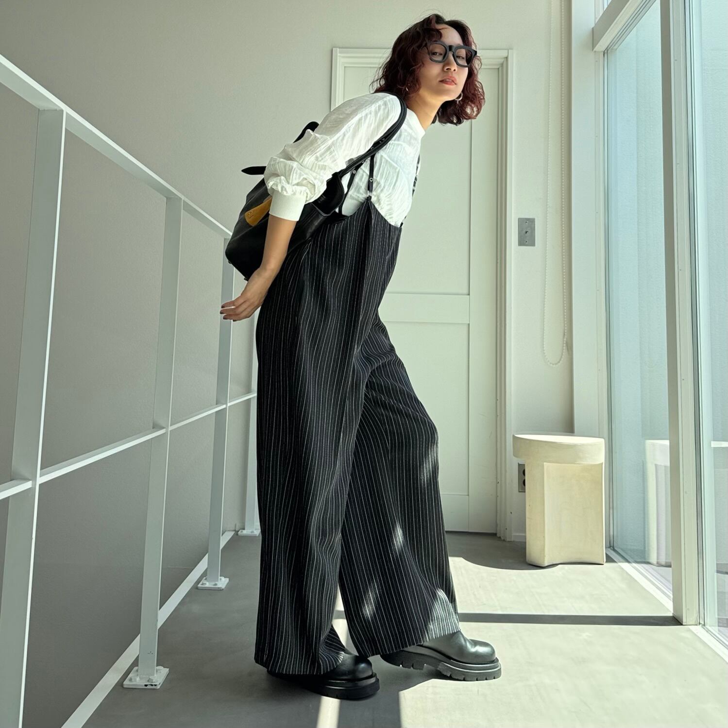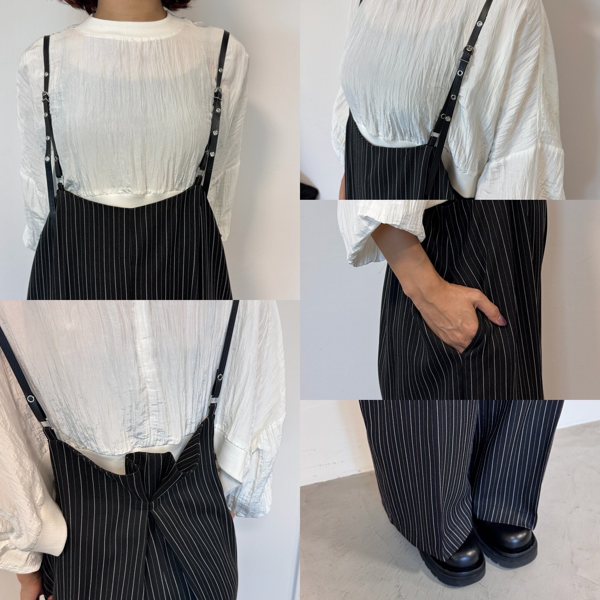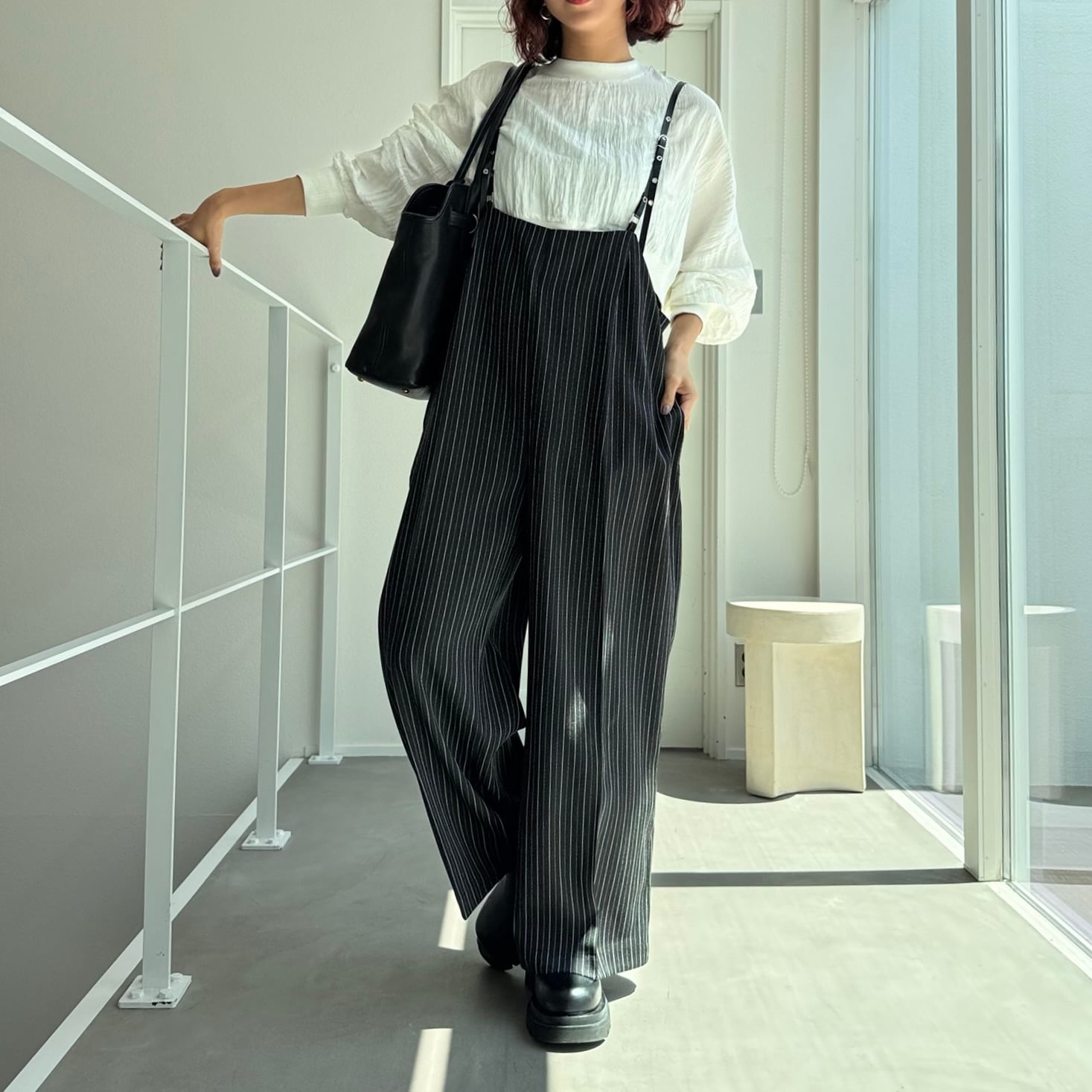 細めの品の良いストライプが大人っぽいサスペンダーパンツ。腰回りにタックが入っているので体型カバーしてくれます。細い異素材のストラップの組み合わせも可愛く軽めのトップスを合わせるのはもちろん秋冬はニットやスウェット合わせなども可能です。5段階で長さ調節できるのも嬉しいポイント。