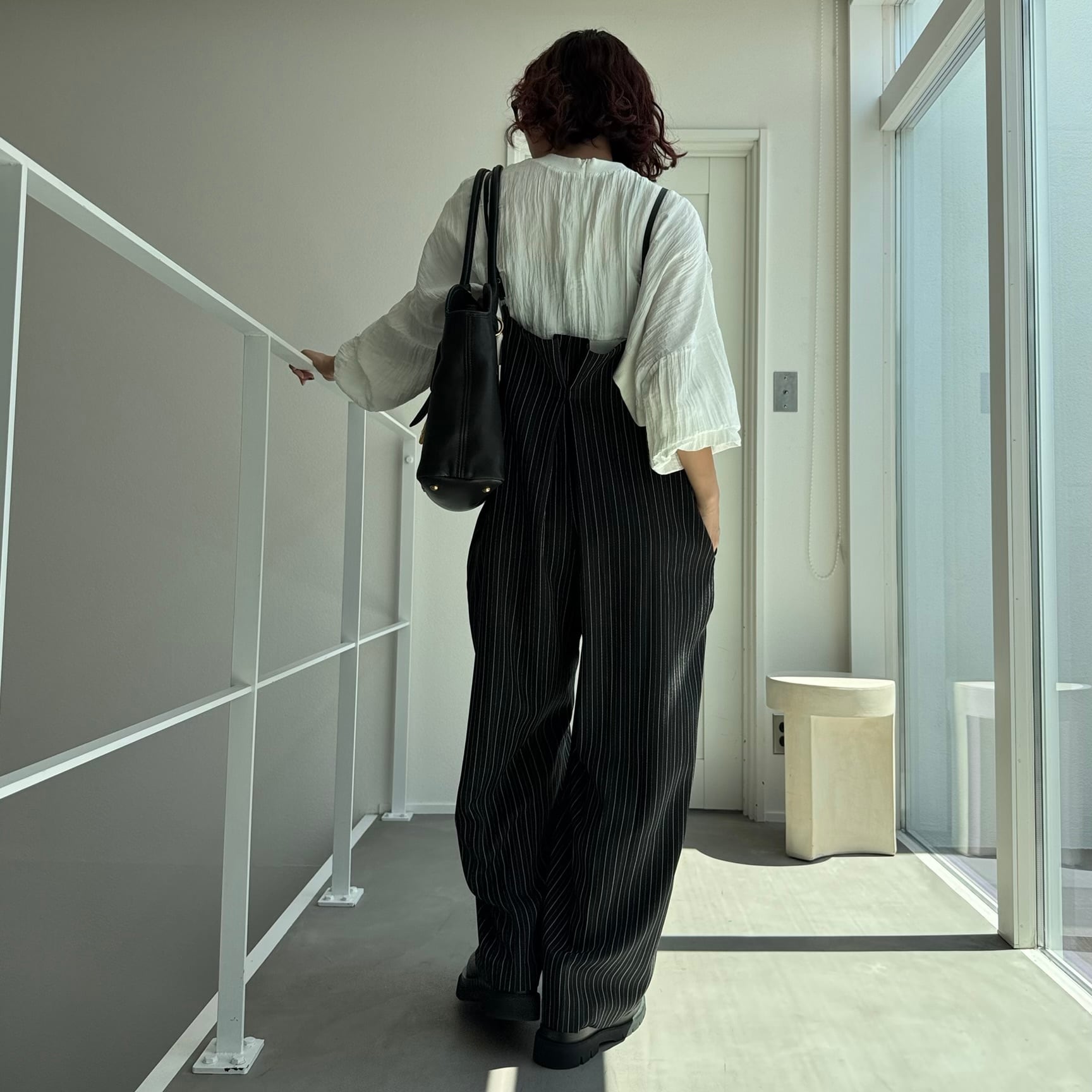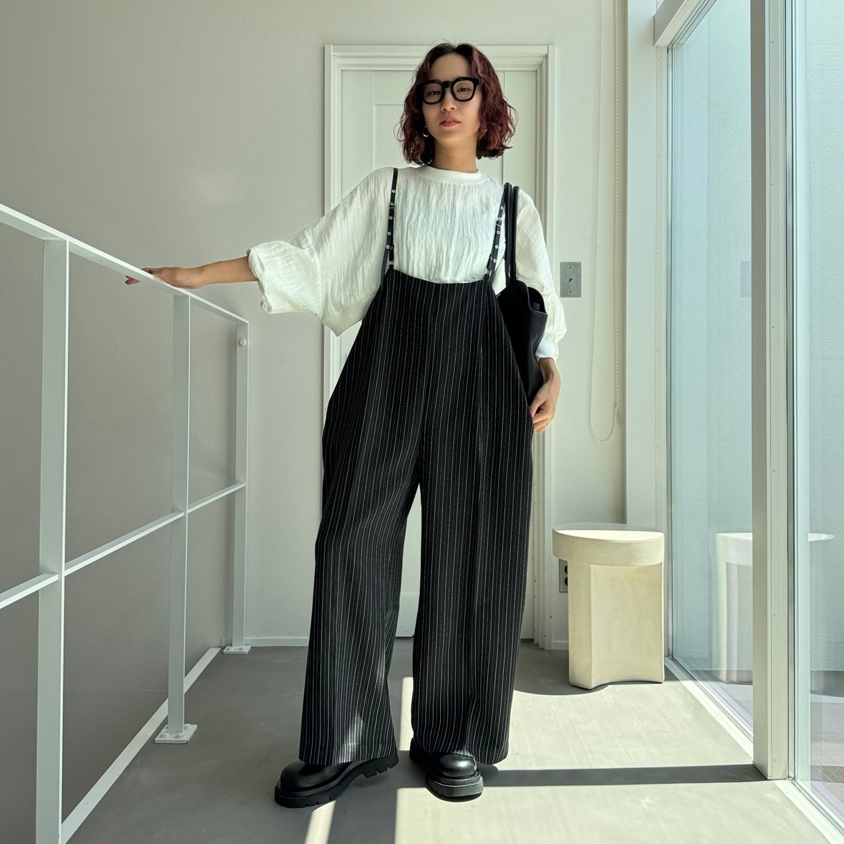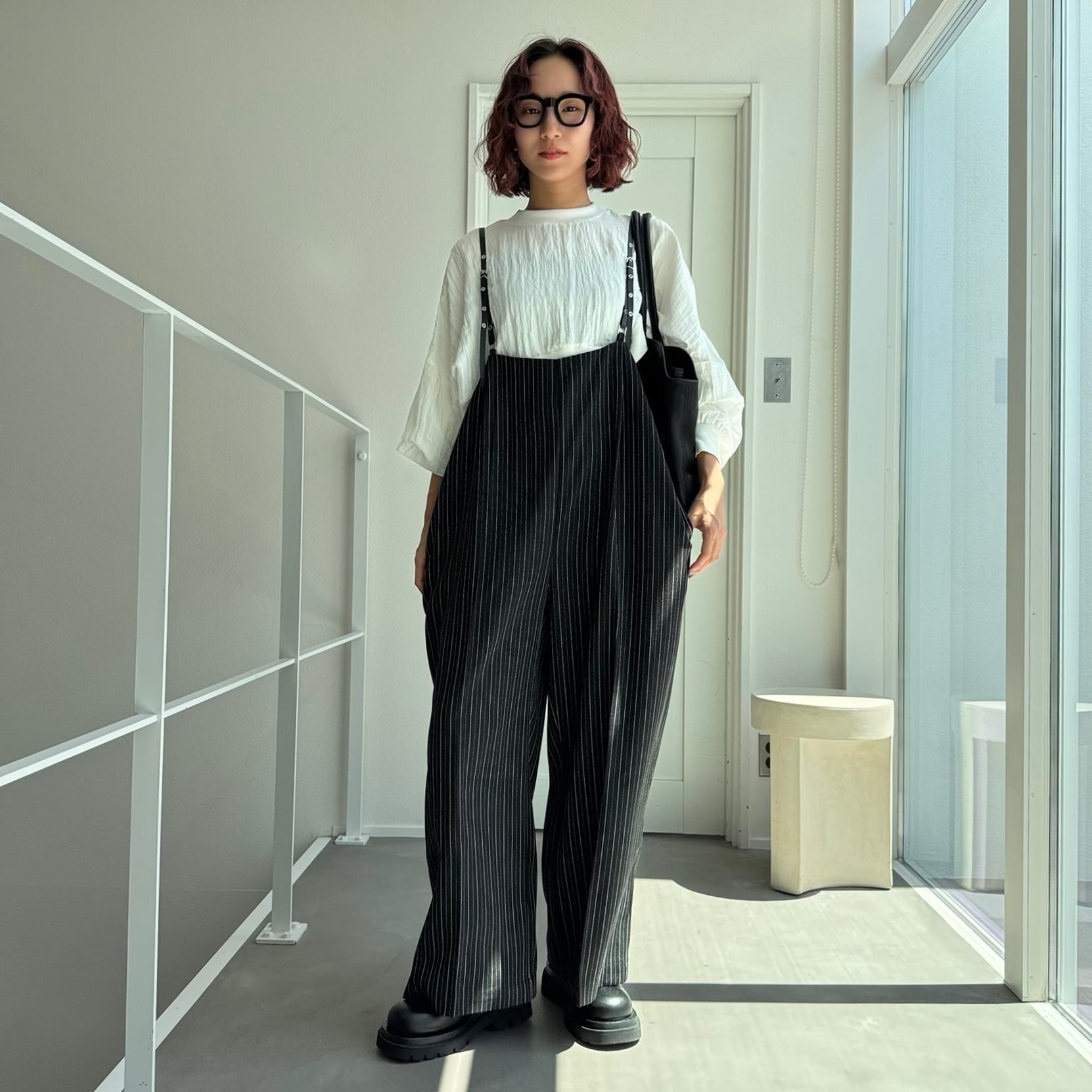 細めの品の良いストライプが大人っぽいサスペンダーパンツ。腰回りにタックが入っているので体型カバーしてくれます。細い異素材のストラップの組み合わせも可愛く軽めのトップスを合わせるのはもちろん秋冬はニットやスウェット合わせなども可能です。5段階で長さ調節できるのも嬉しいポイント。