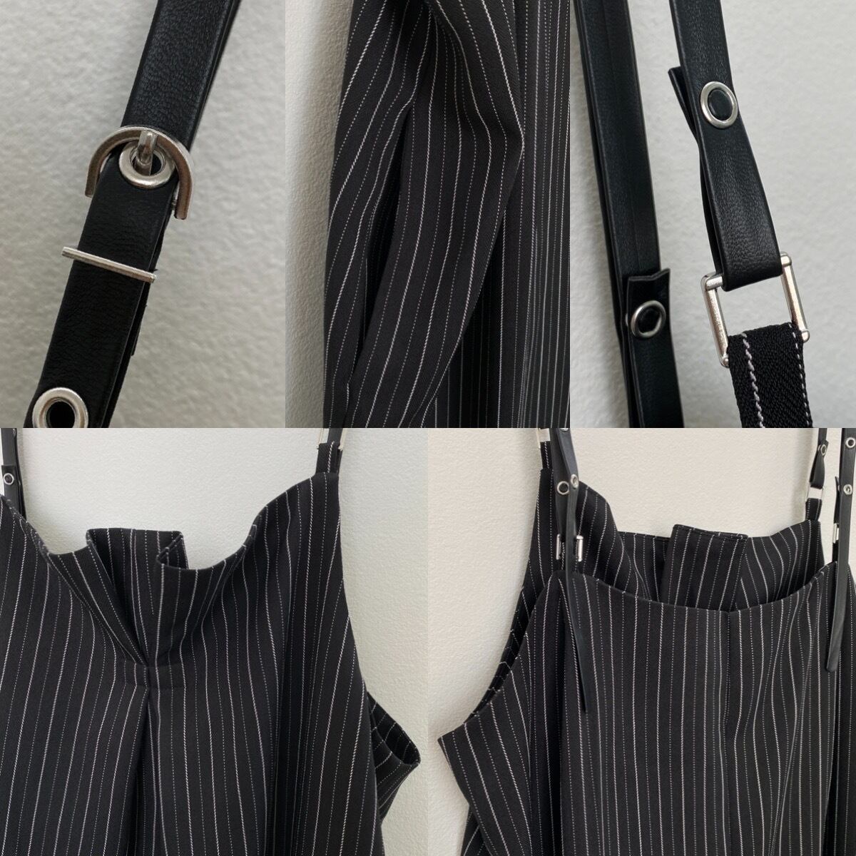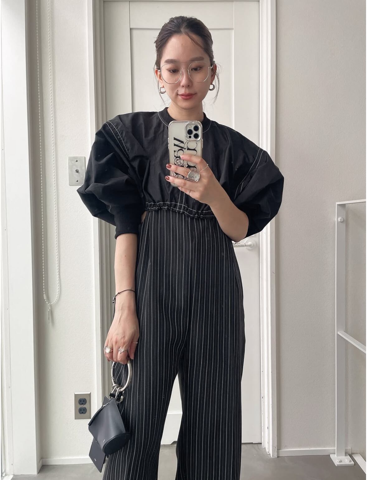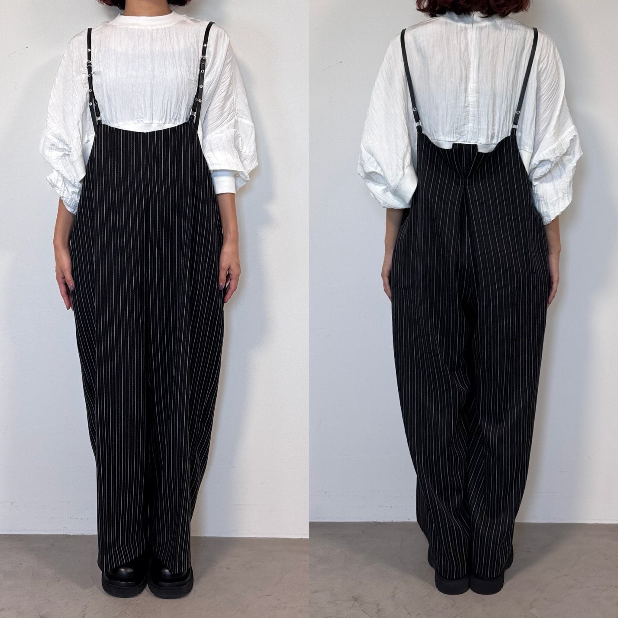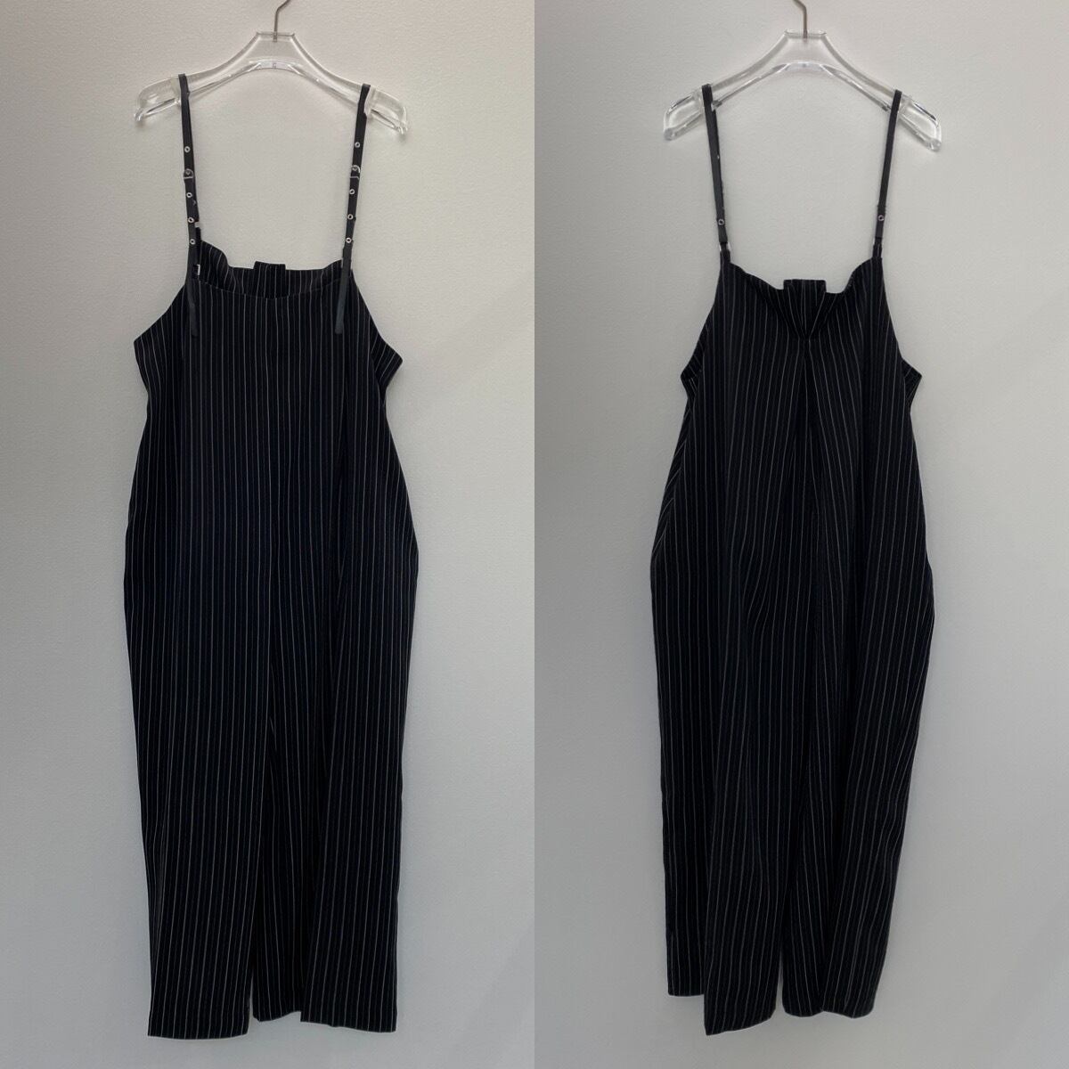 細めの品の良いストライプが大人っぽいサスペンダーパンツ。腰回りにタックが入っているので体型カバーしてくれます。細い異素材のストラップの組み合わせも可愛く軽めのトップスを合わせるのはもちろん秋冬はニットやスウェット合わせなども可能です。5段階で長さ調節できるのも嬉しいポイント。