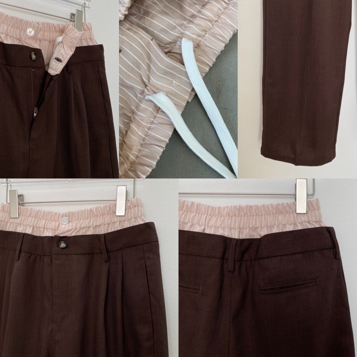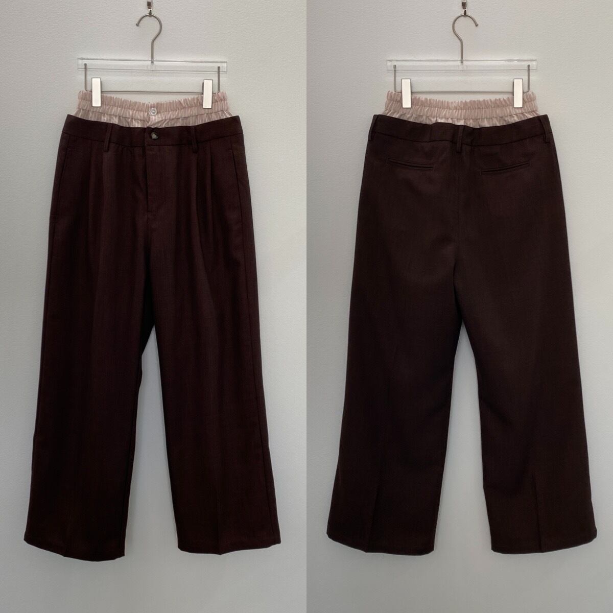 一気におしゃれ度がアップするダブルウエストパンツ。トランクスを履いているようなレイヤード風なデザインでドッキング仕様になっています。キレイなストレートラインのスラックス生地を使用しているのできちんと感もプラス。トレンドのデザインですが取り入れやすい1枚です。同生地の[ハーフスリーブテーラードJK]とのSET UPコーデもおすすめです。