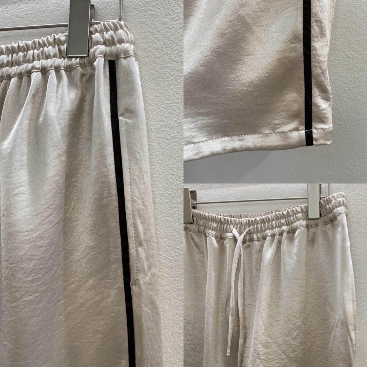 サイドラインの配色がポイントのサテンパンツ。スッキリとしたストレートラインなのでトップスのデザインは悩まず着用頂けます。ウエストは総ゴムの着脱の楽々なリラックスパンツでありながら、滑らかなサテン生地がカジュアルになりすぎず洗練されたモードな印象を与えます。