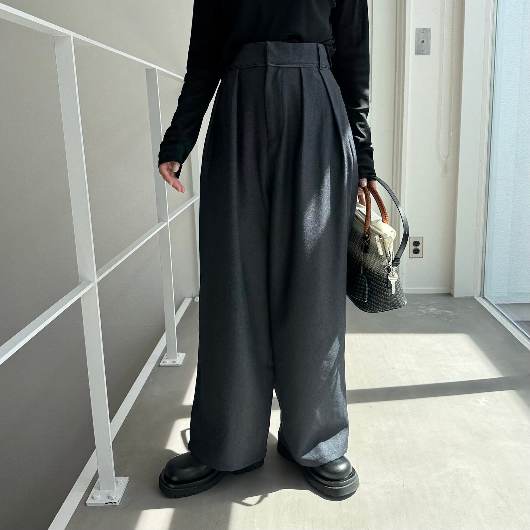 脚長効果バツグンのタックパンツ。ほどよいハイウエストとフロントにタックデザインが入り、腰回りが膨らまないようなすっきりとしたシルエット。またウエスト部分にパイピングをプラスしてコーデのポイントに。ハイウエストデザインなのでショート丈との相性も抜群です。