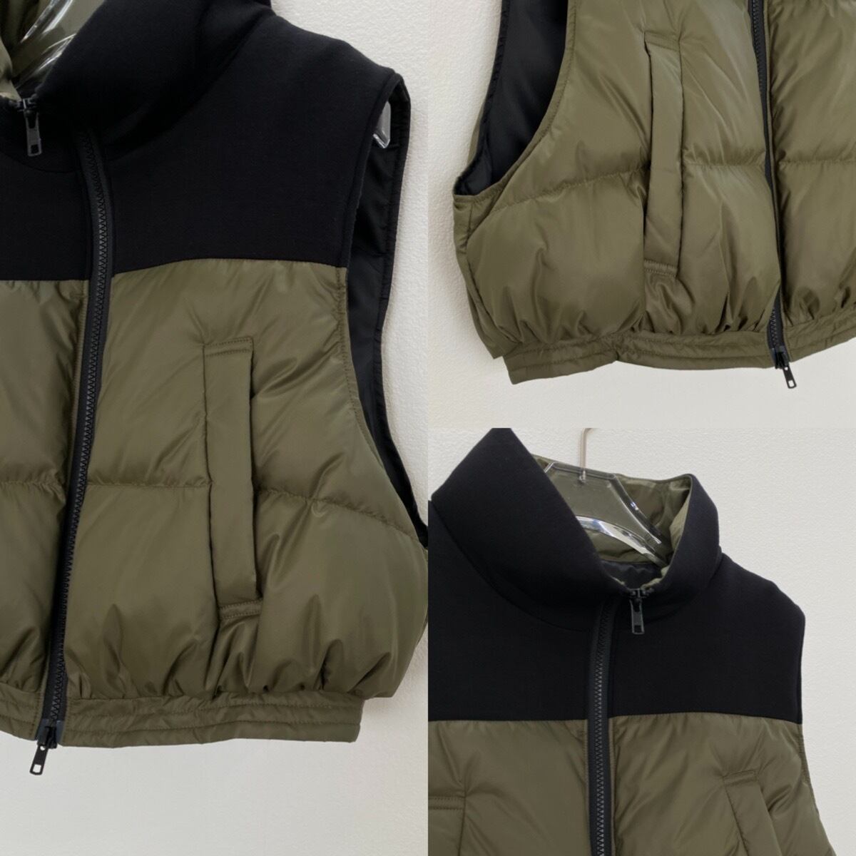 トレンド感満載のショート丈ベスト。もちもちのダンボールニットと艶やかなタフタのコンビネーションは高級感も兼ね備えています。ジップは上下どちらからも調節できるダブルジップになっているので抜け感のあるコーデが可能。ボリュームがあるのですが切替デザインなので着ぶくれせず着用頂けます。中綿は機能中綿を使用しているので防寒としてもおすすめ。