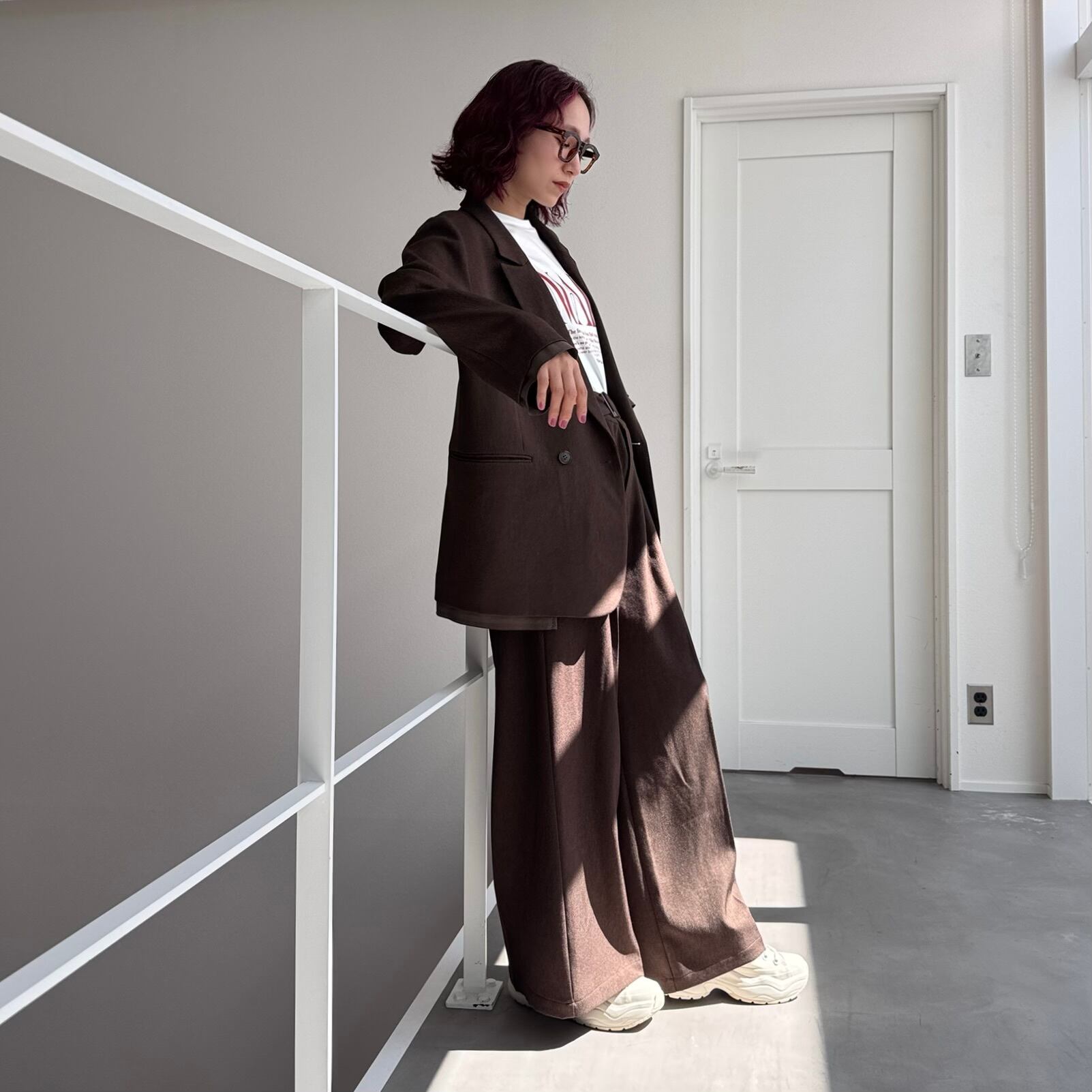 トラッドな雰囲気も出しつつカジュアルなコーデにもピッタリのジャケット。裾や袖口から別生地がレイヤードされておりこなれ感をプラス。お尻もすっぽり隠れる丈感ですが、ダボッとしすぎない洗練されたデザインです。デニムやTシャツの上から羽織るだけ様になります。普段のコーデにプラスするだけで完成する万能ジャケットです。同生地の[ベルト付タックワイドPT]とのSET UPコーデもおすすめ。
