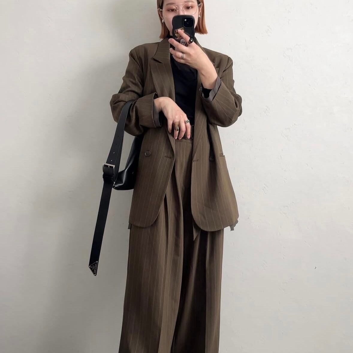 程よいワイドラインが美脚効果のあるワイドパンツ。ベルトがドッキングされたデザインでコーデのポイントに。柔らかいスラックス生地を使用しているので履き心地も抜群。タックが入っているので腰回りをカバーしつつ足のラインも拾わないデザインなのも嬉しいポイント。同生地の[レイヤードオーバーダブルJK]とのSET UPコーデもおすすめです。