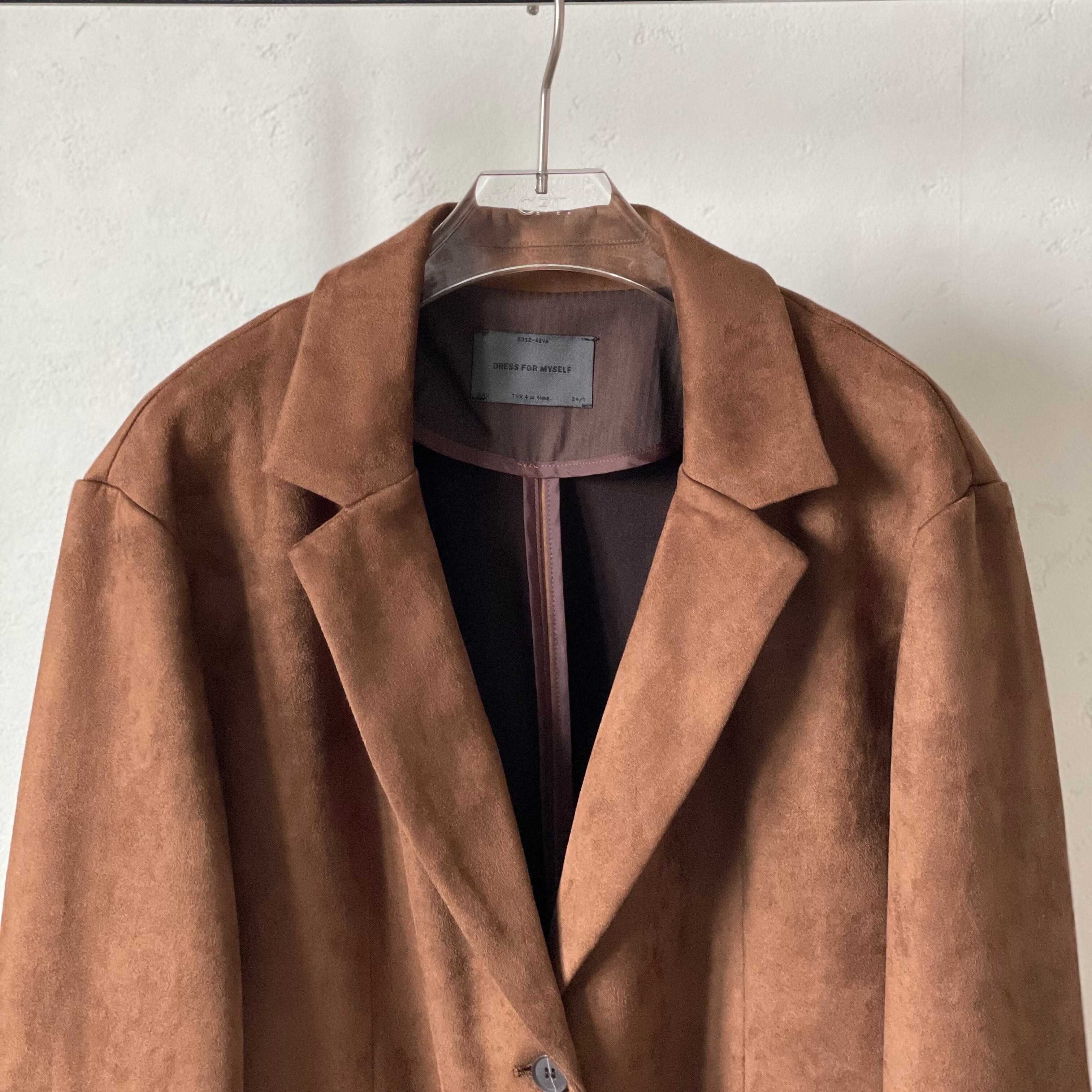 今季大注目のトレンドのフェイクスウェード素材のテーラードジャケット。オーバーサイズなシルエットと、衿の止まり位置を少し高くすることでかっちりしたジャケットよりも、ラフに普段使いしやすいように仕上がっています。ストレッチ入りでしっとりとした手触りで厚みがありハリ感と柔らかさを兼ね備えたアイテム。いつもの同じになりがちなシンプルコーデにさっと羽織るだけで洗練された印象に。