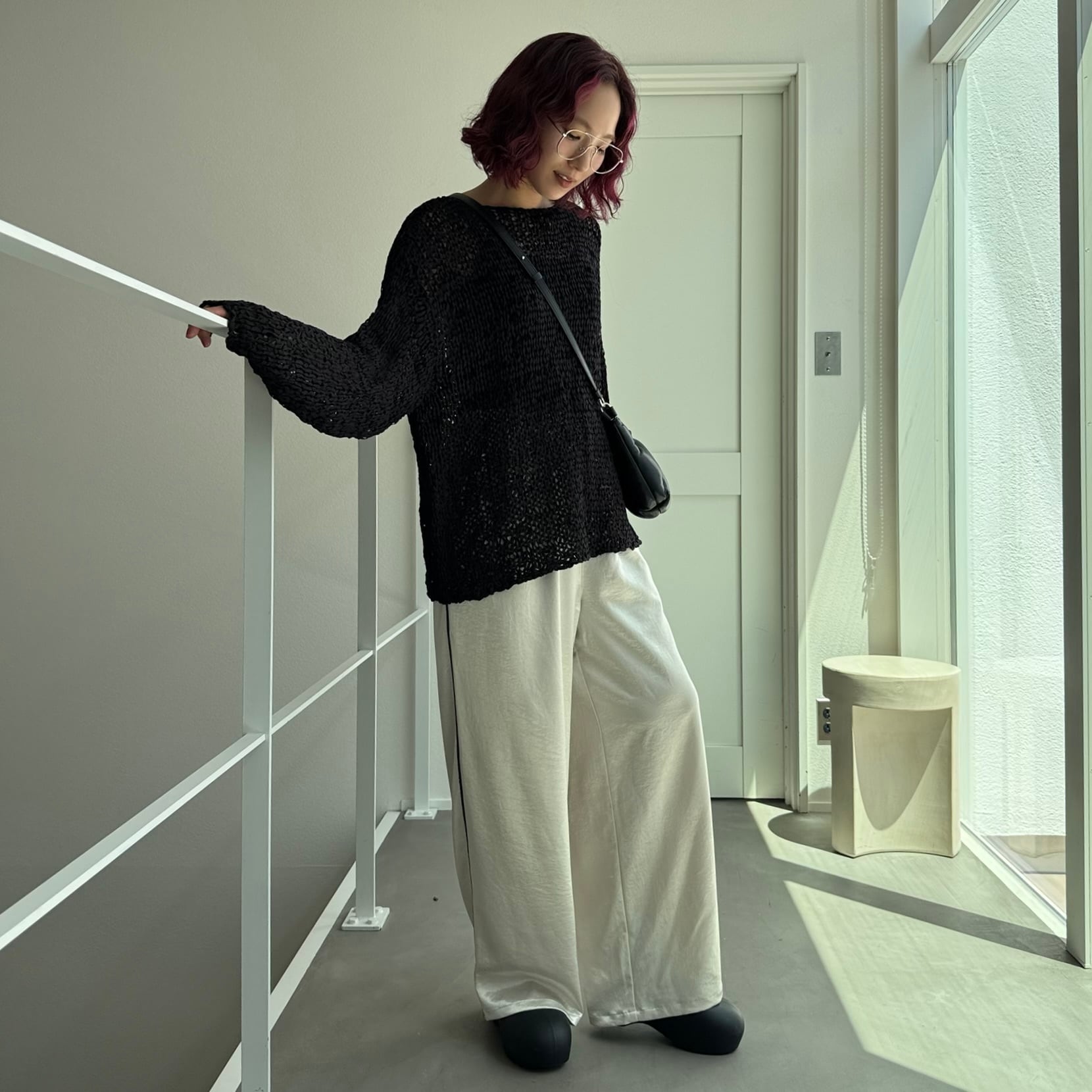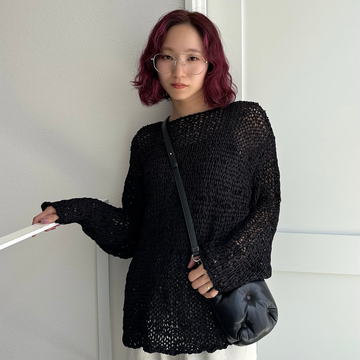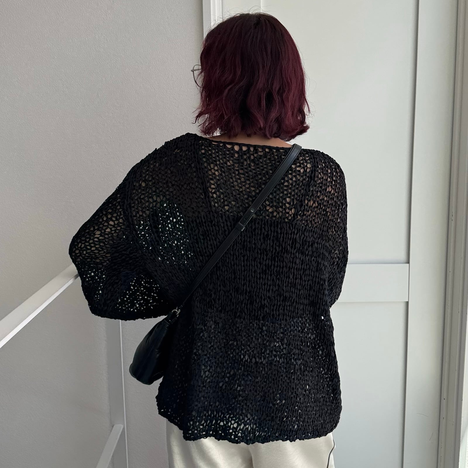 ざっくりと編まれた透け感を楽しめるペーパーヤーン編みプルオーバー。平たいテープのような太めの糸で編まれています。柔らかくサラリとしているので肌にも優しい着心地。広めにとられたネックラインは首元をきれいにみせてくれます。インナーによって雰囲気を変えられるのも嬉しいポイント。