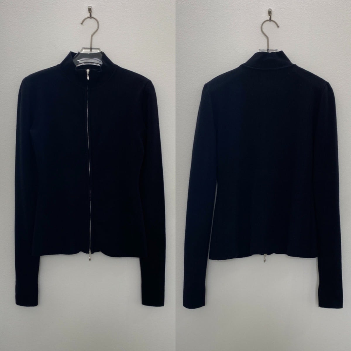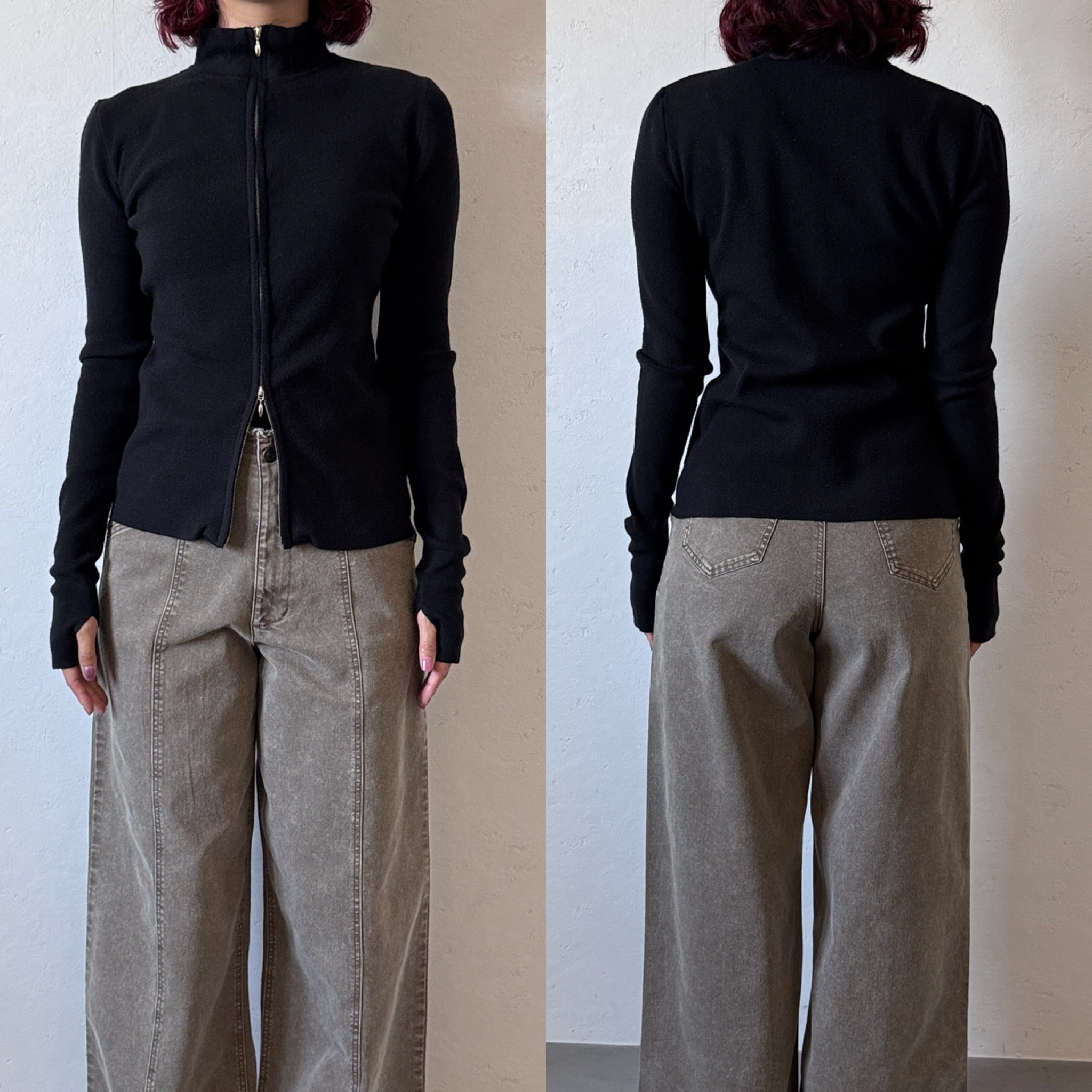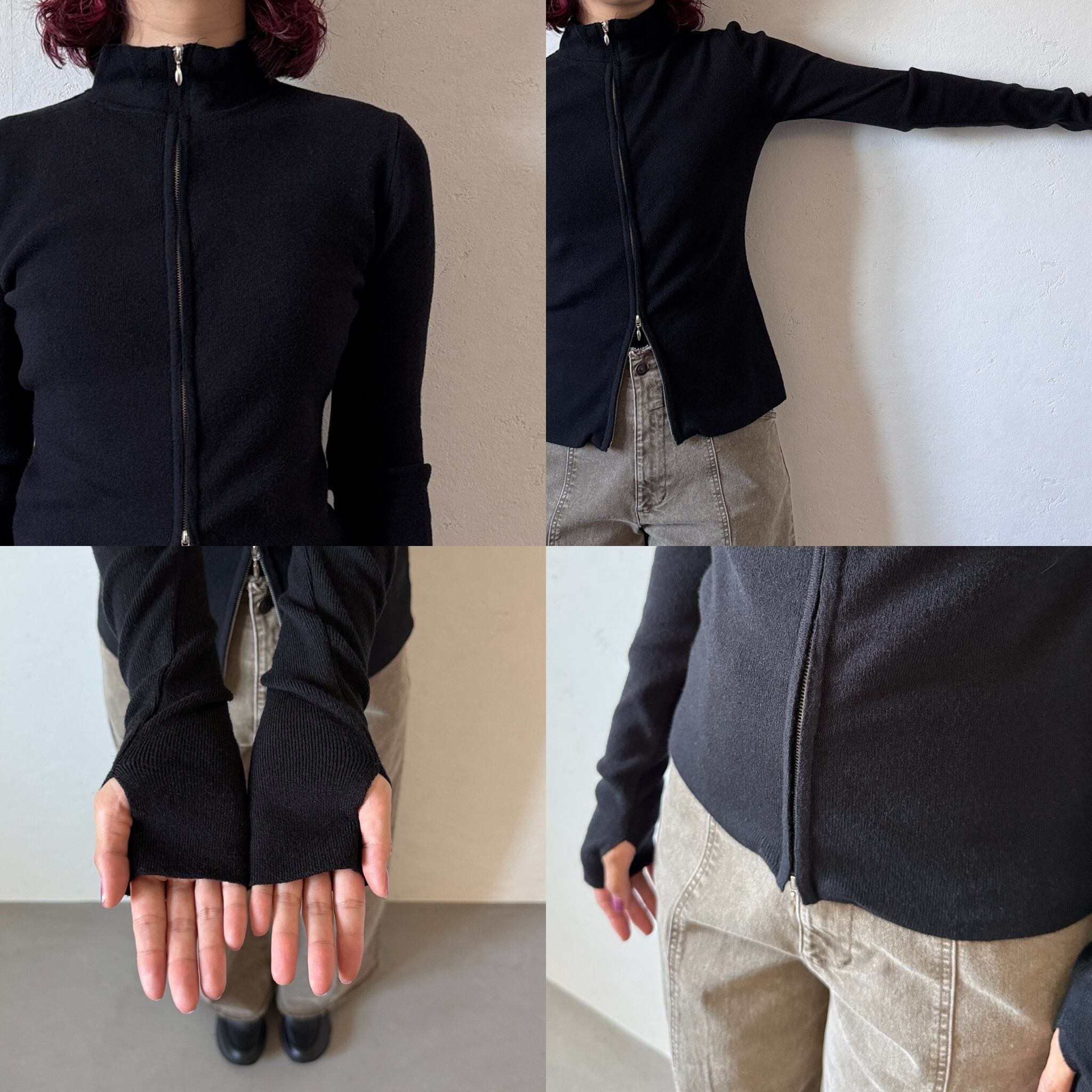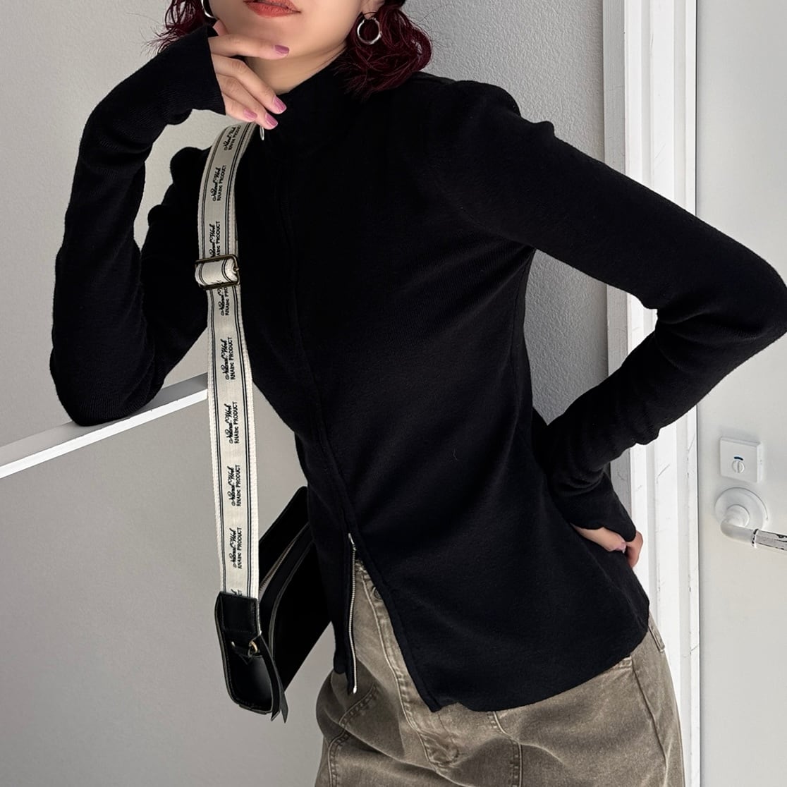 モード感あふれるダブルジップニットトップス。程よい高さのハイネック・長めの袖丈がモードな印象を演出してくれます。ダブルジップデザインかつプルオーバーとしてもカーディガンとしても着用可能◎ジップの開き具合でシルエットや肌見せ具合を楽しむことができます。胸元の小さなファスナーがさりげないポイントに。