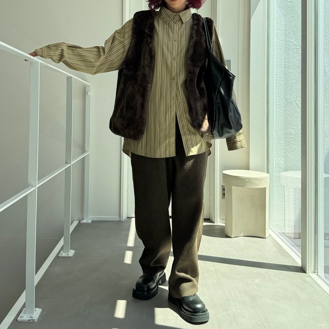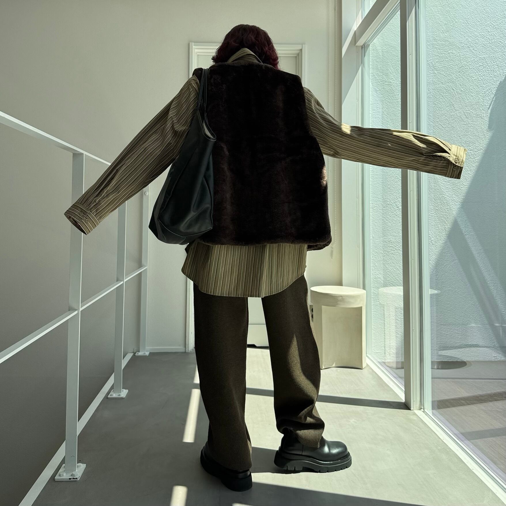肌触りの良い光沢感のある毛並みのエコファーベスト。ファスナー付きのポケットの中にも同生地のファーを使用。ポケットのジップ部分はフェイクレザーをプラスしており細かいところまで抜かりなくデザインされています。長すぎず短すぎない使いやすい丈感なのでいつものコーデのプラスしやすいところも嬉しいポイント。