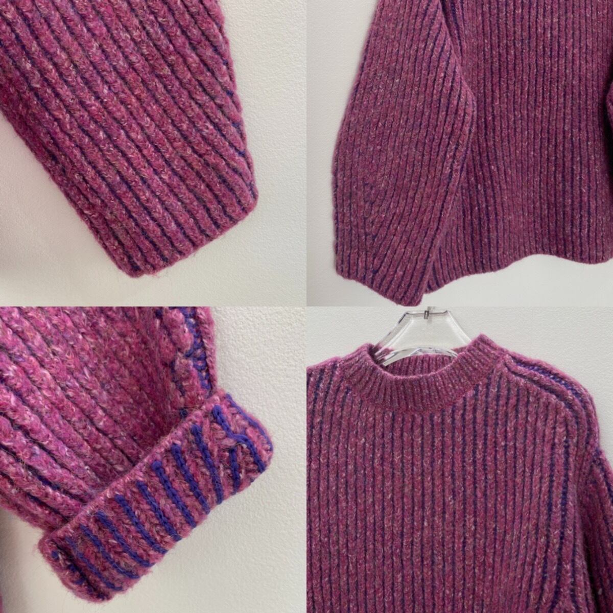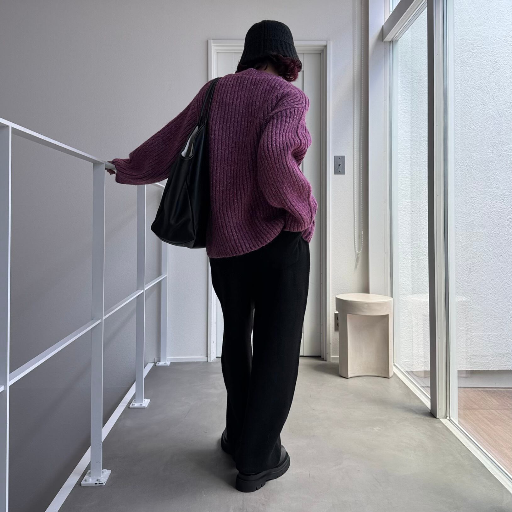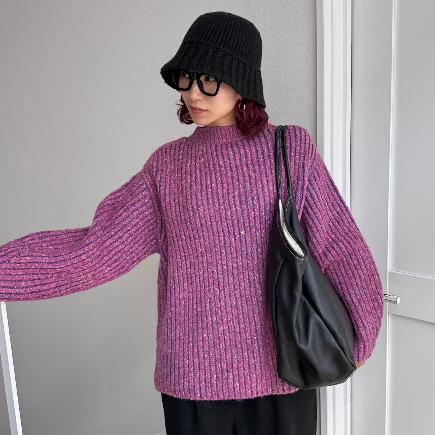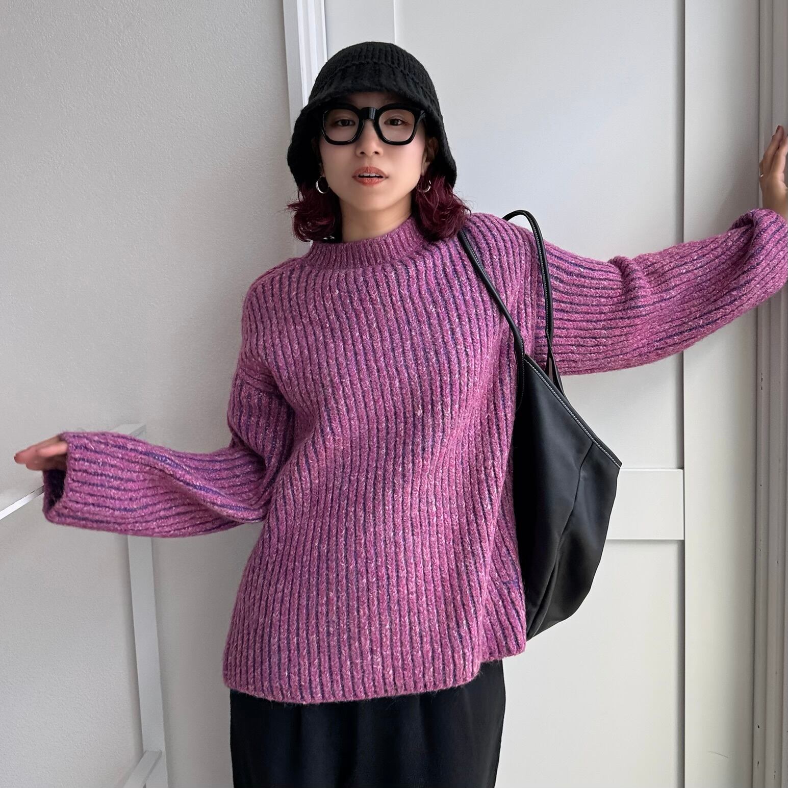 カラーの組み合わせが可愛く、立体感のある編み目がポイントのオーバーニット。袖にボリュームがでるようにラウンドしたシルエットなのでタポ袖になっています。ざっくりとしたリラックス感のあるニットなのでスッキリとしたボトムはもちろん、あえてボリュームのあるボトムと合わせたコーデもおススメです。