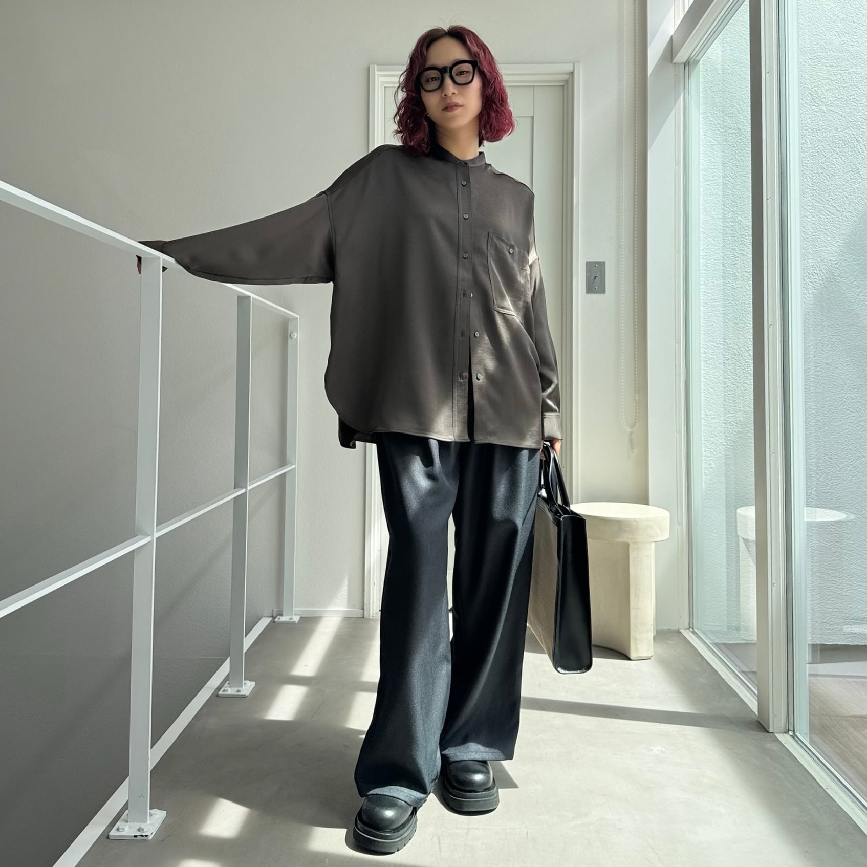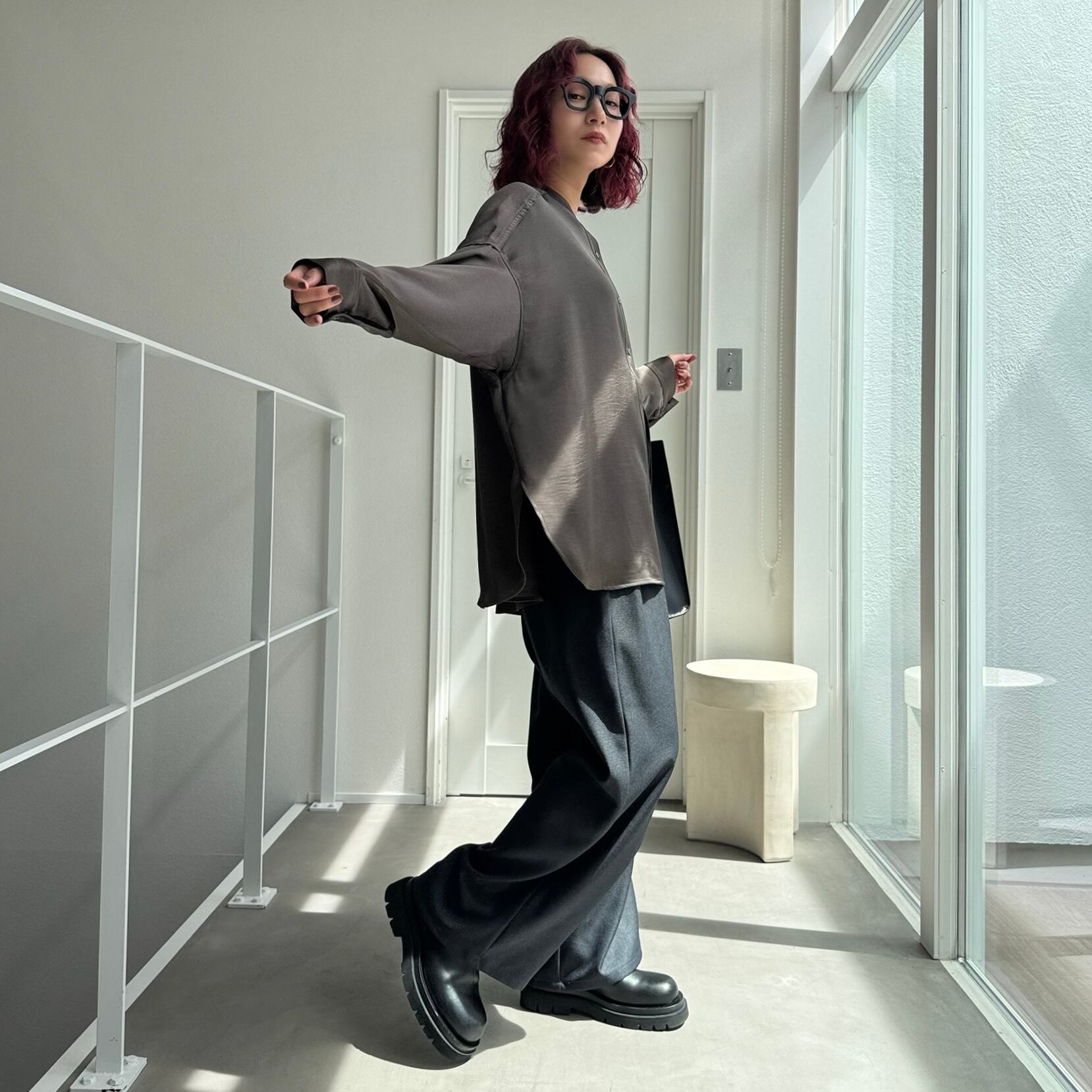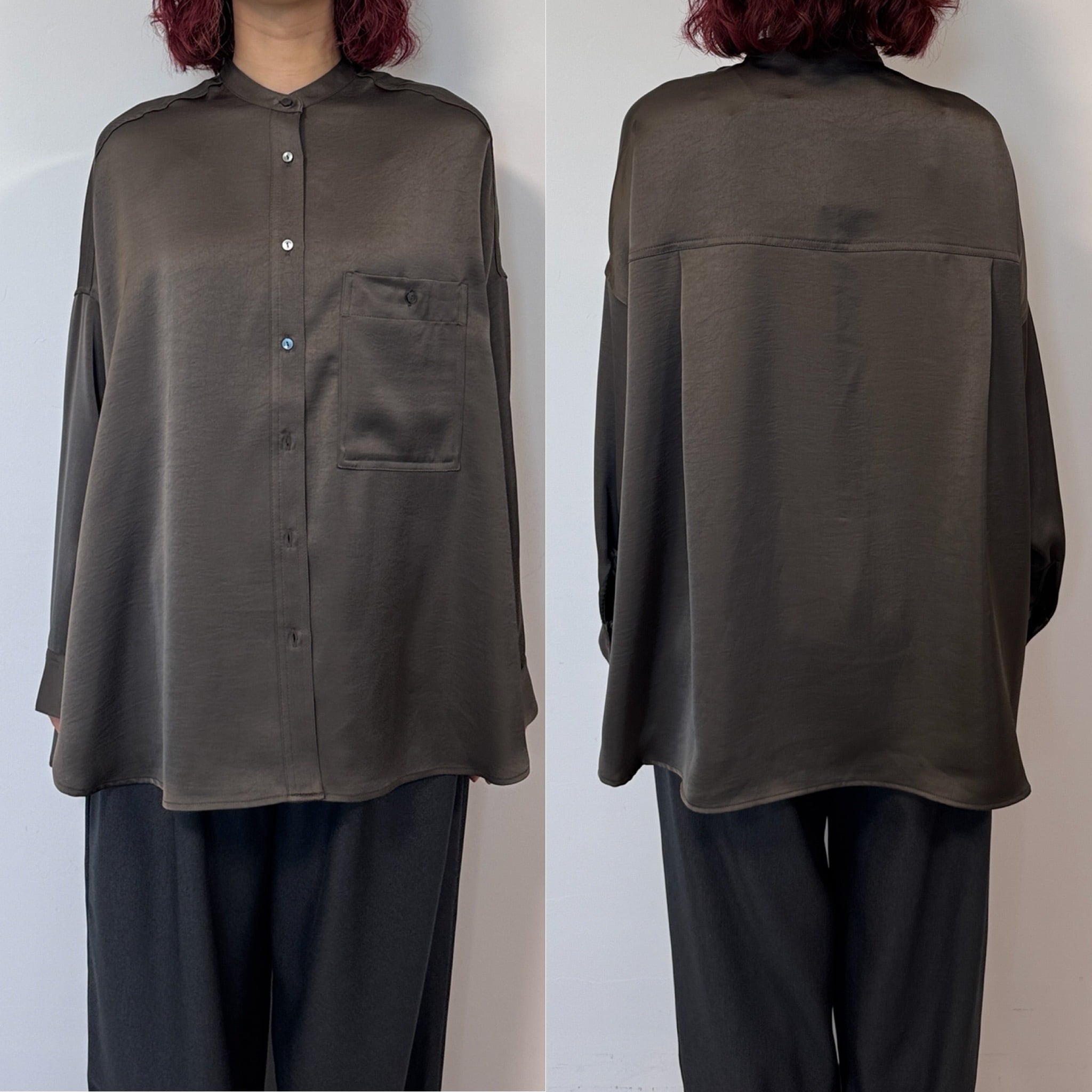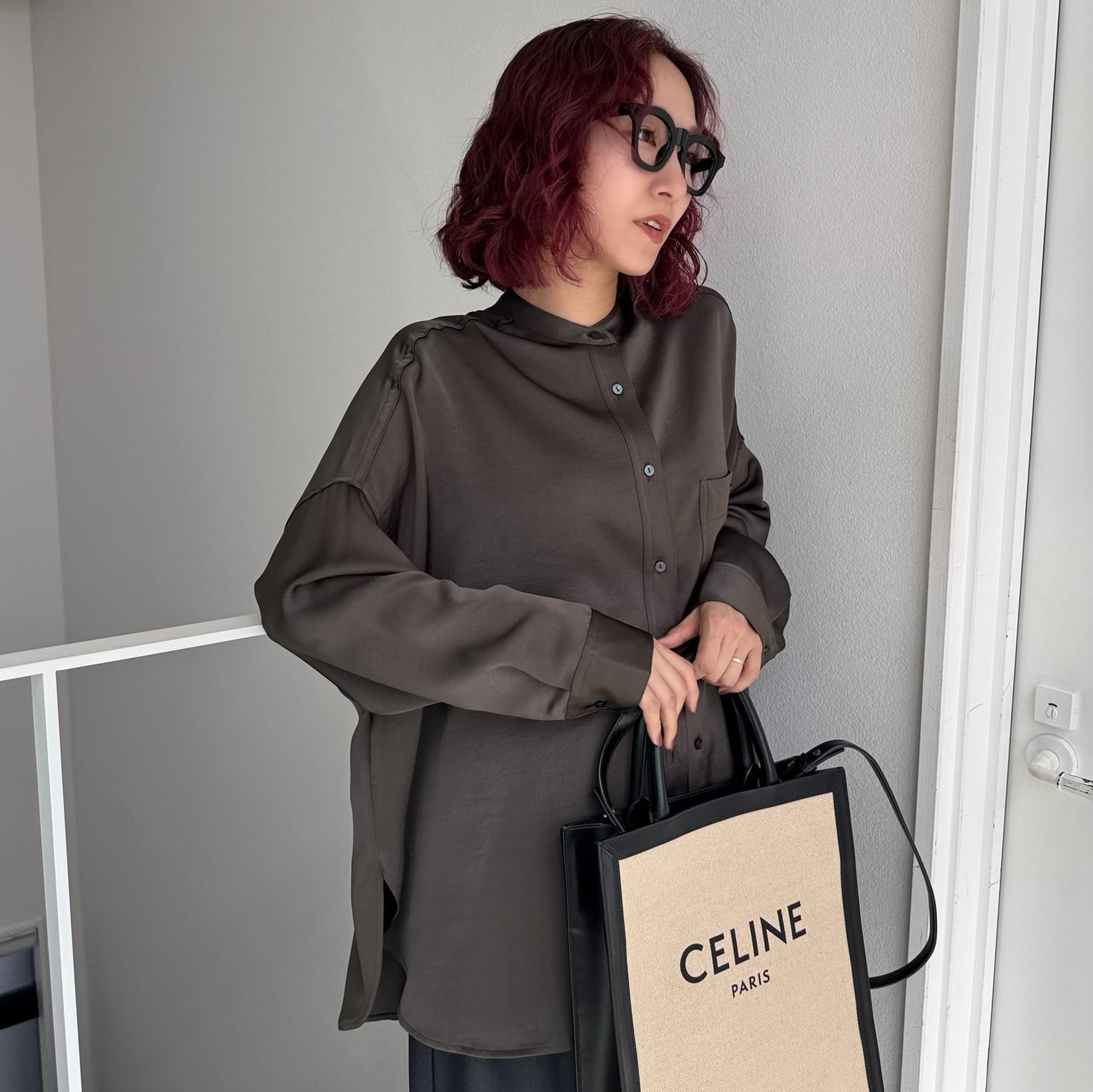 マットな光沢感の上品さに、ゆるっと落ち感のあるルーズシャツ。光沢感に加えて表面はワッシャー加工しているので表情のある生地感を使用しております。ゆったりとリラクシーに着用でき1枚でサラリとコーデに取り入れても一気にこなれ感がアップします。オーバーサイズなので腰回りもすっぽり隠れるのも嬉しいポイント。