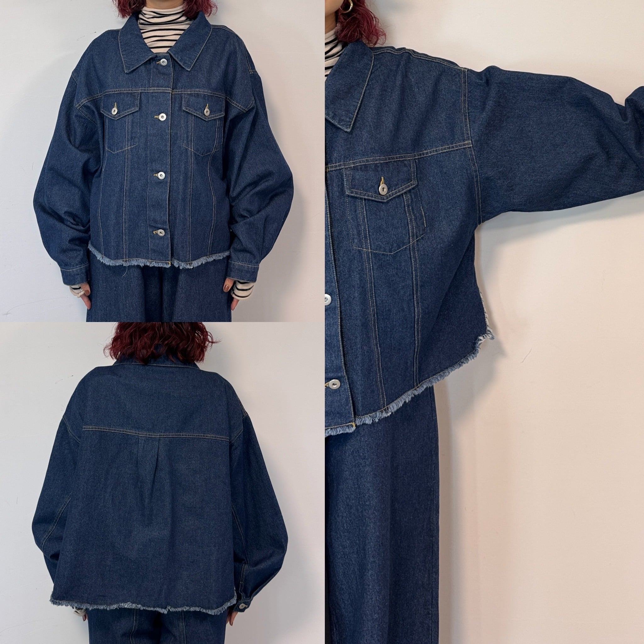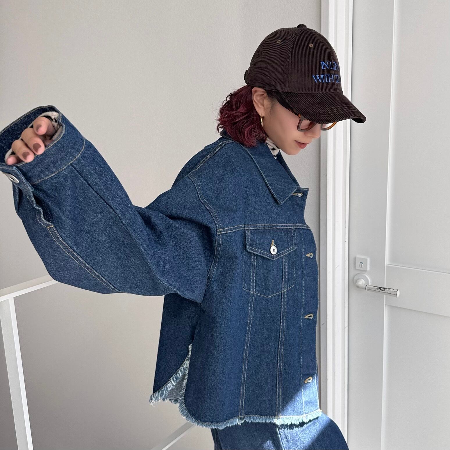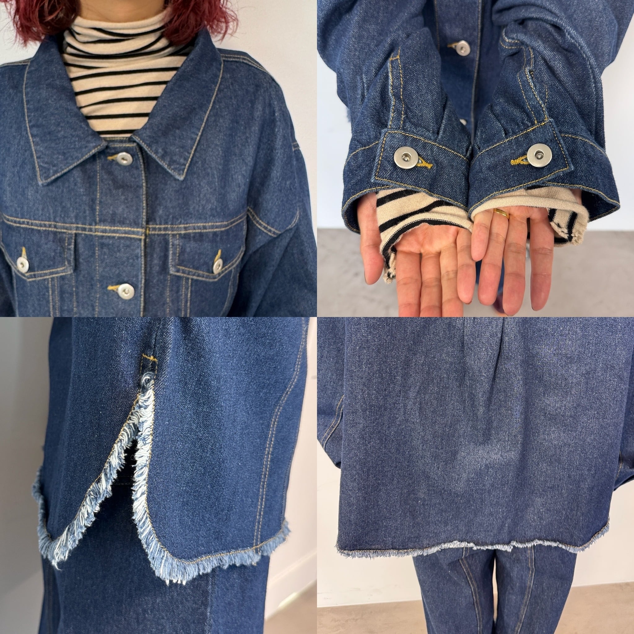 裾のフリンジデザインがポイントのデニムジャケット。身幅をたっぷりとる事によって厚手のニットなども着用いただけます。立体感のあるデザインで袖のボリュームも可愛く羽織としても重宝します。前後差やサイドスリットで抜け感のあるコーデに。