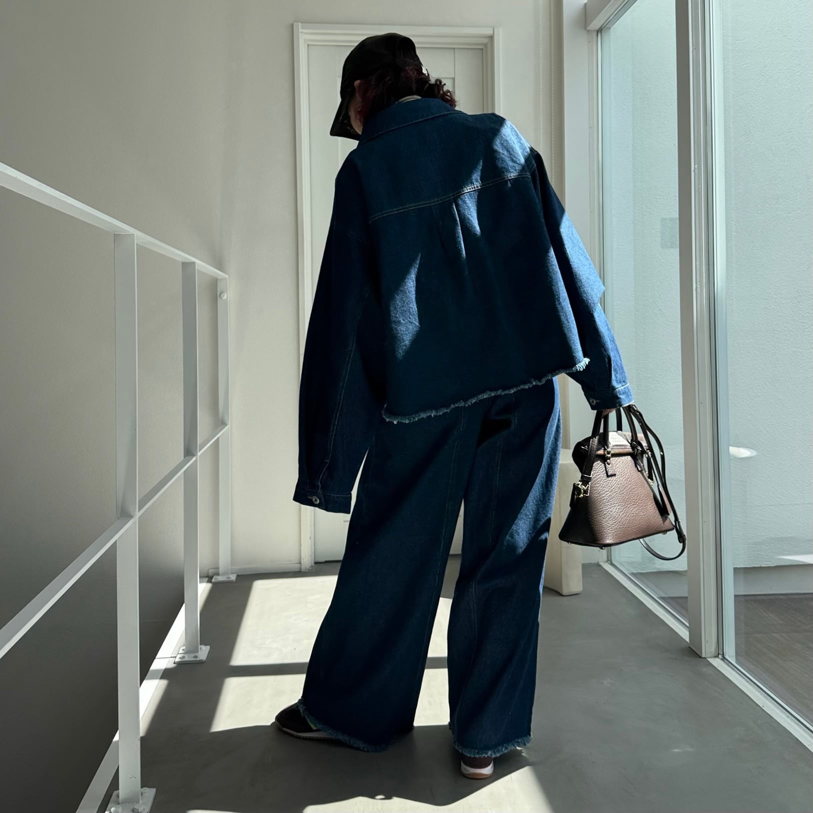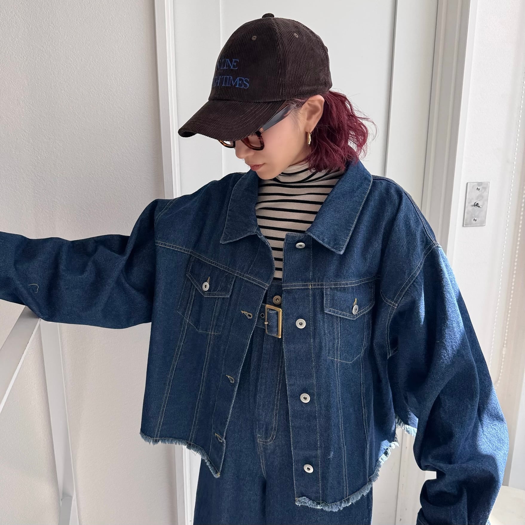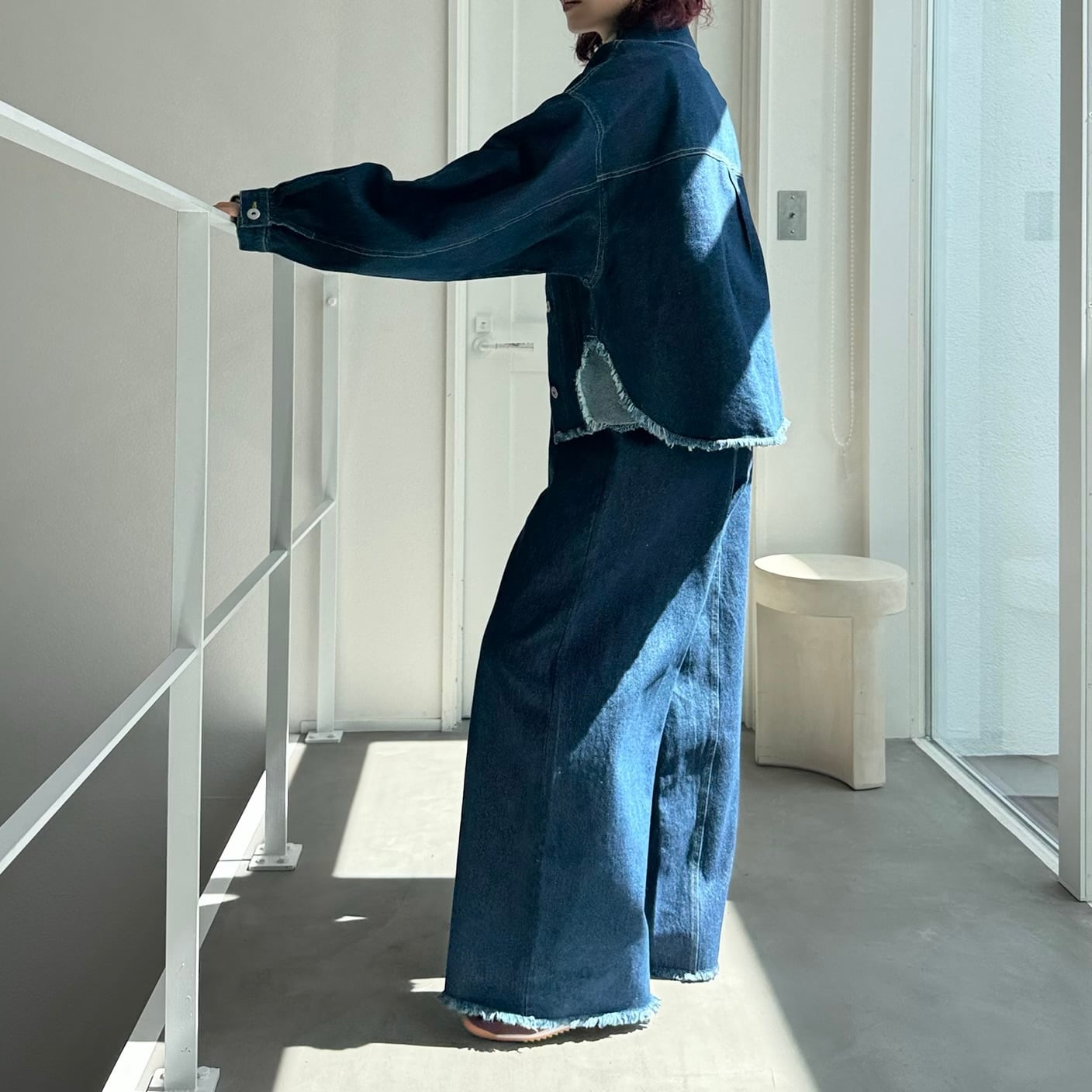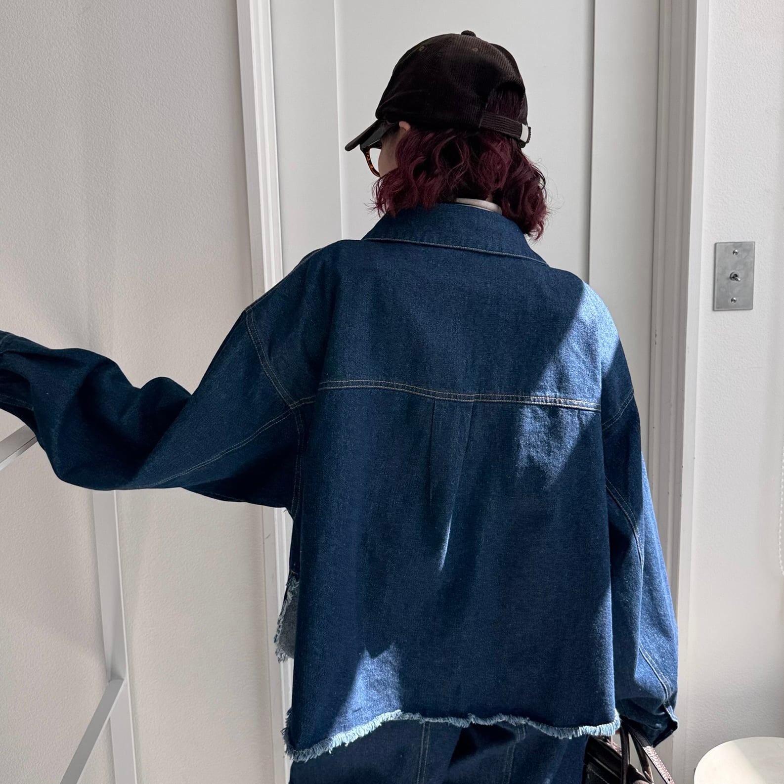 裾のフリンジデザインがポイントのデニムジャケット。身幅をたっぷりとる事によって厚手のニットなども着用いただけます。立体感のあるデザインで袖のボリュームも可愛く羽織としても重宝します。前後差やサイドスリットで抜け感のあるコーデに。