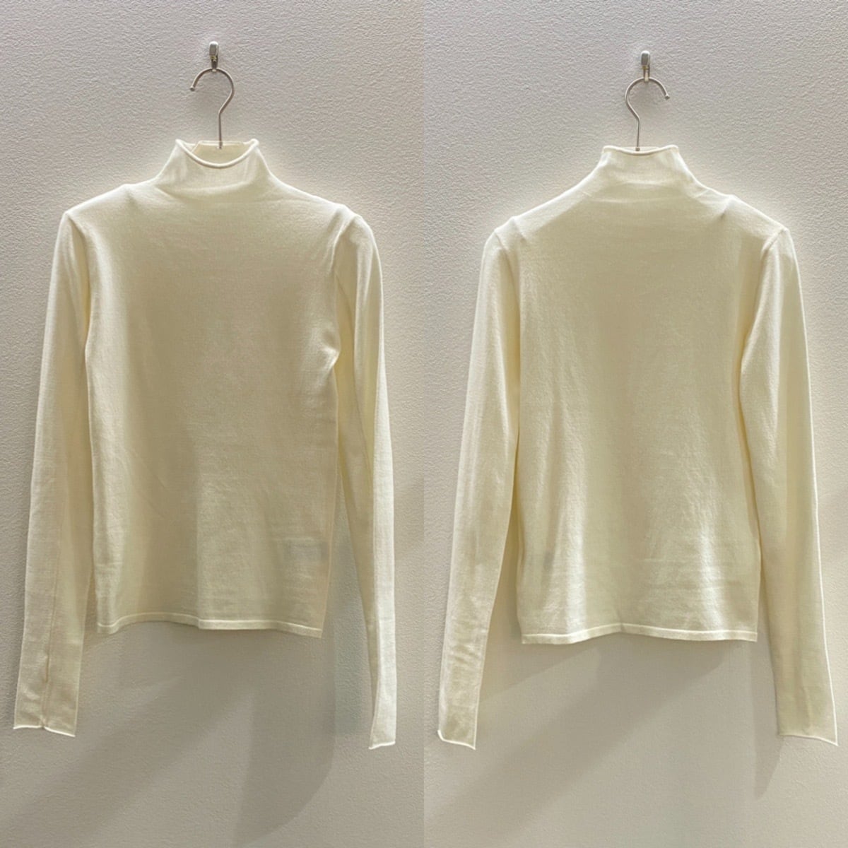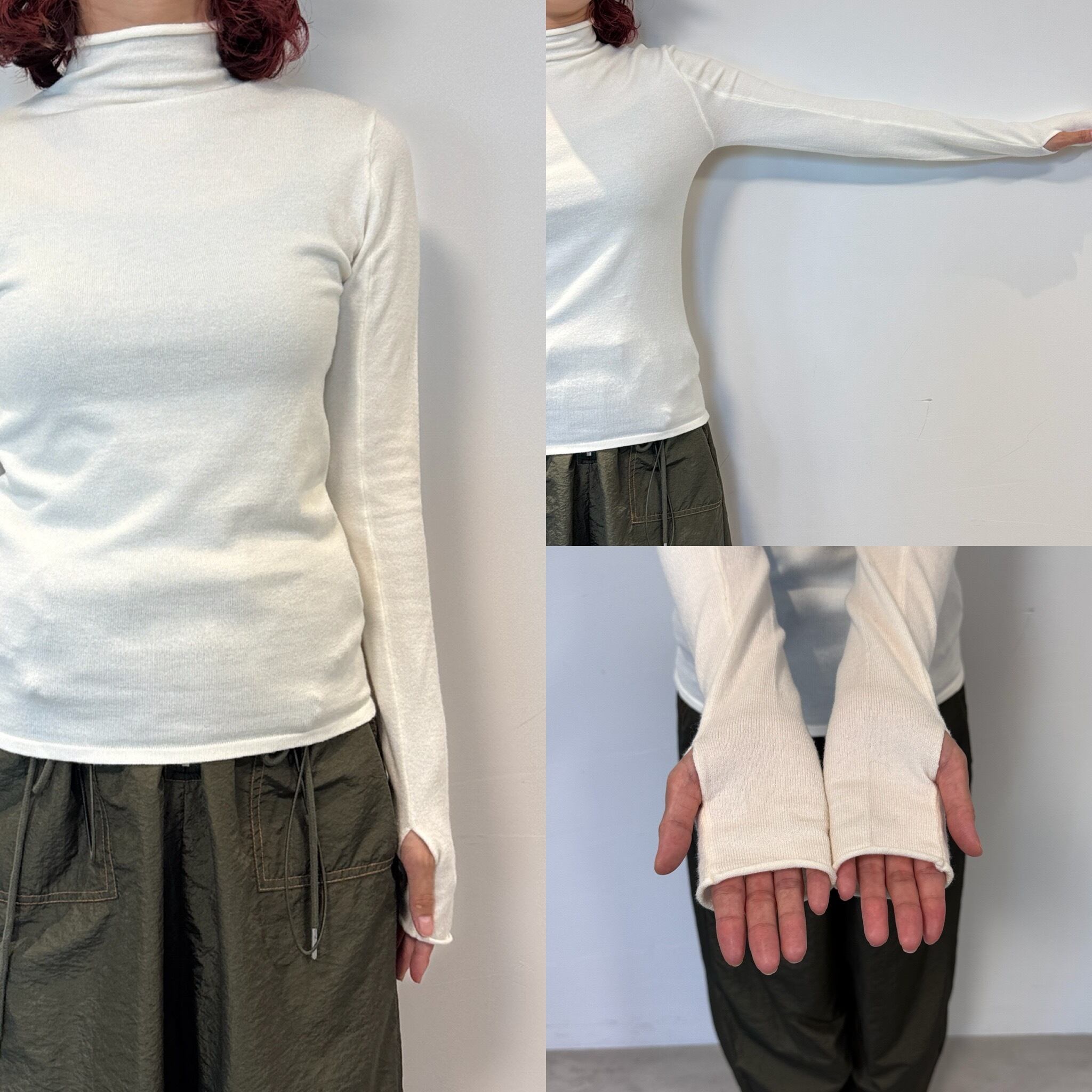 毎年大人気のくしゅモック指穴ニット。首元は、ほどよい高さのモックネック。締めつけが少なく絶妙なフィット感が魅力なポイントです。レーヨン混のモチモチとした生地感が気持ちよく、ストレスフリーな着心地。ニットベストやVネックのトップスのインナーとしても使いやすい万能な一着です。