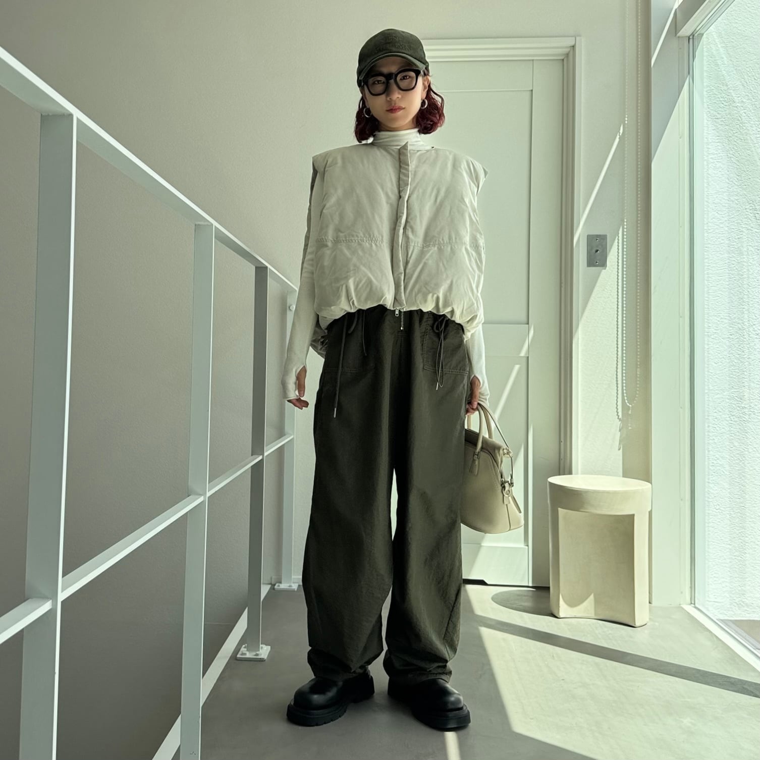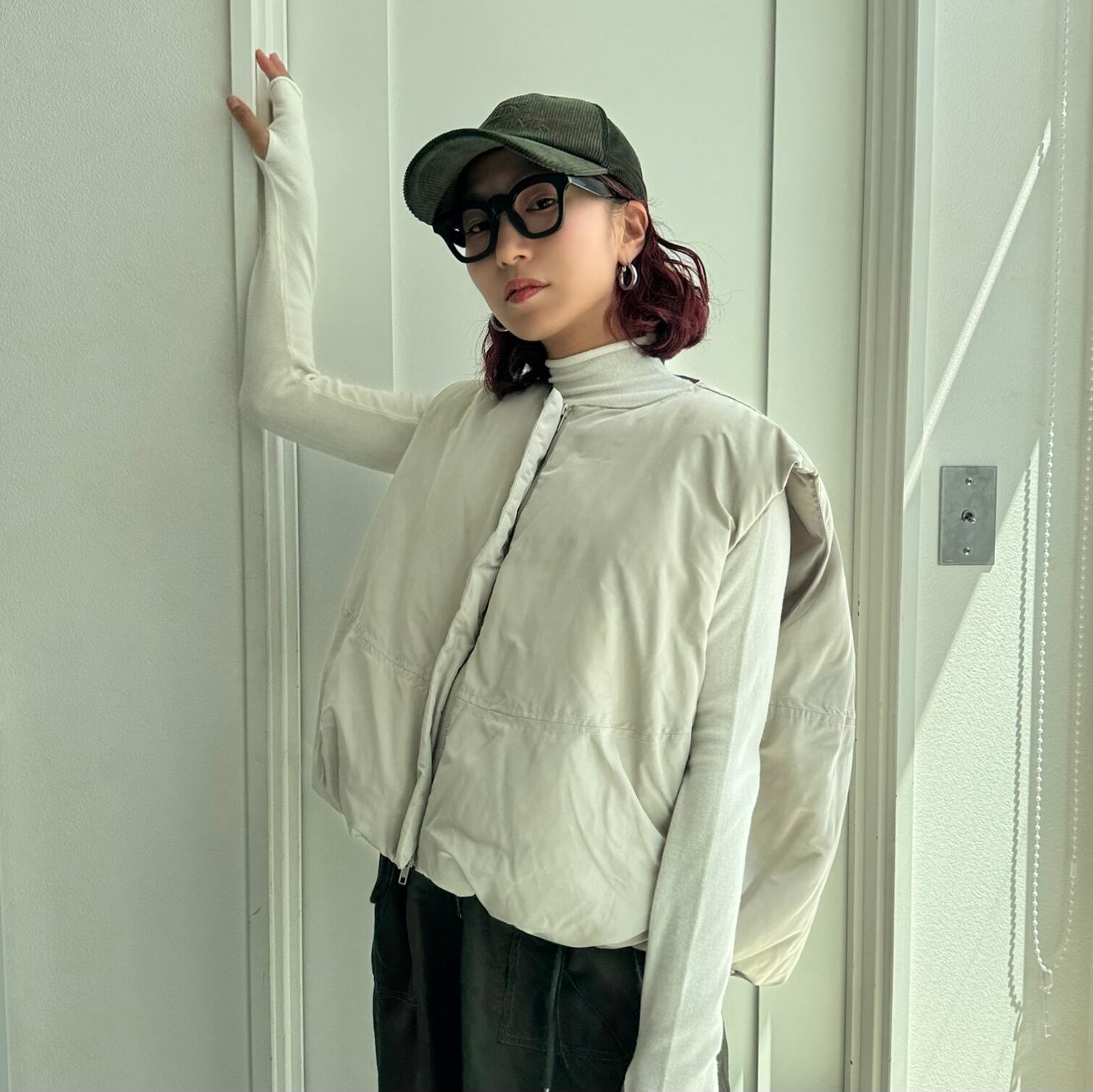 vest:ノーカラーマットファイバーダウンvest/グレージュ