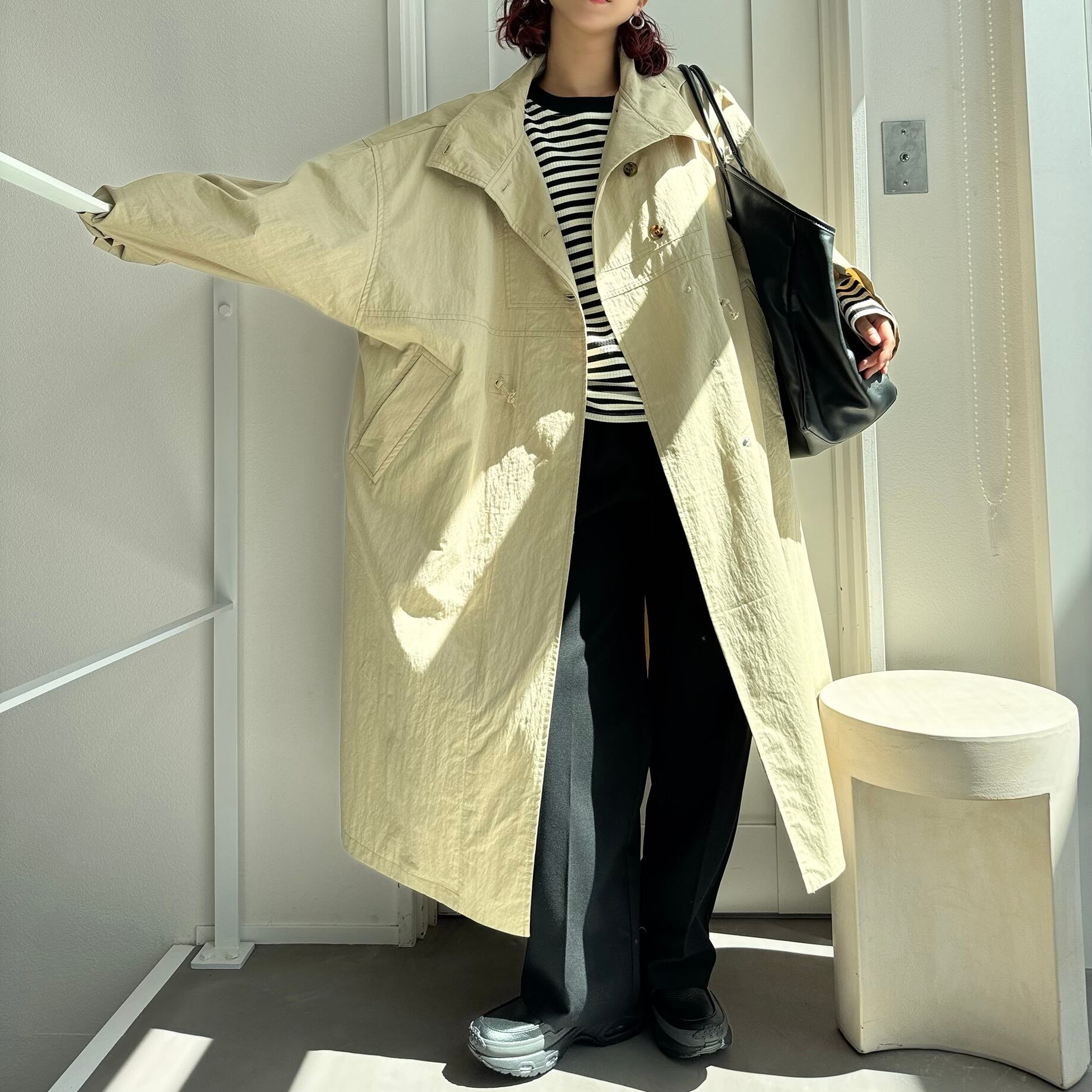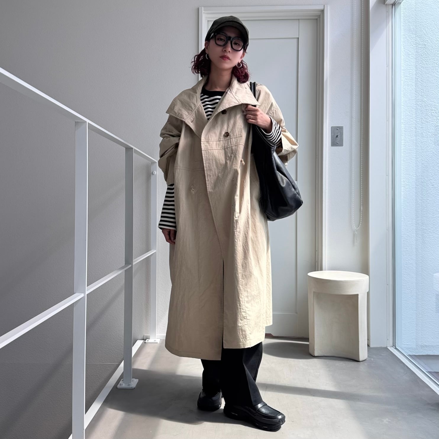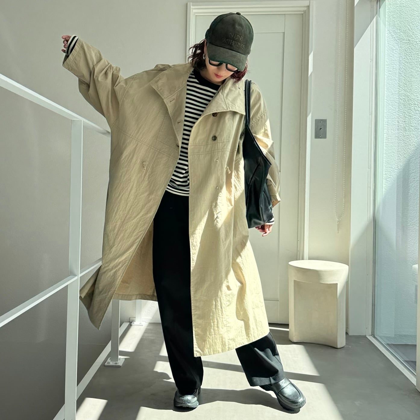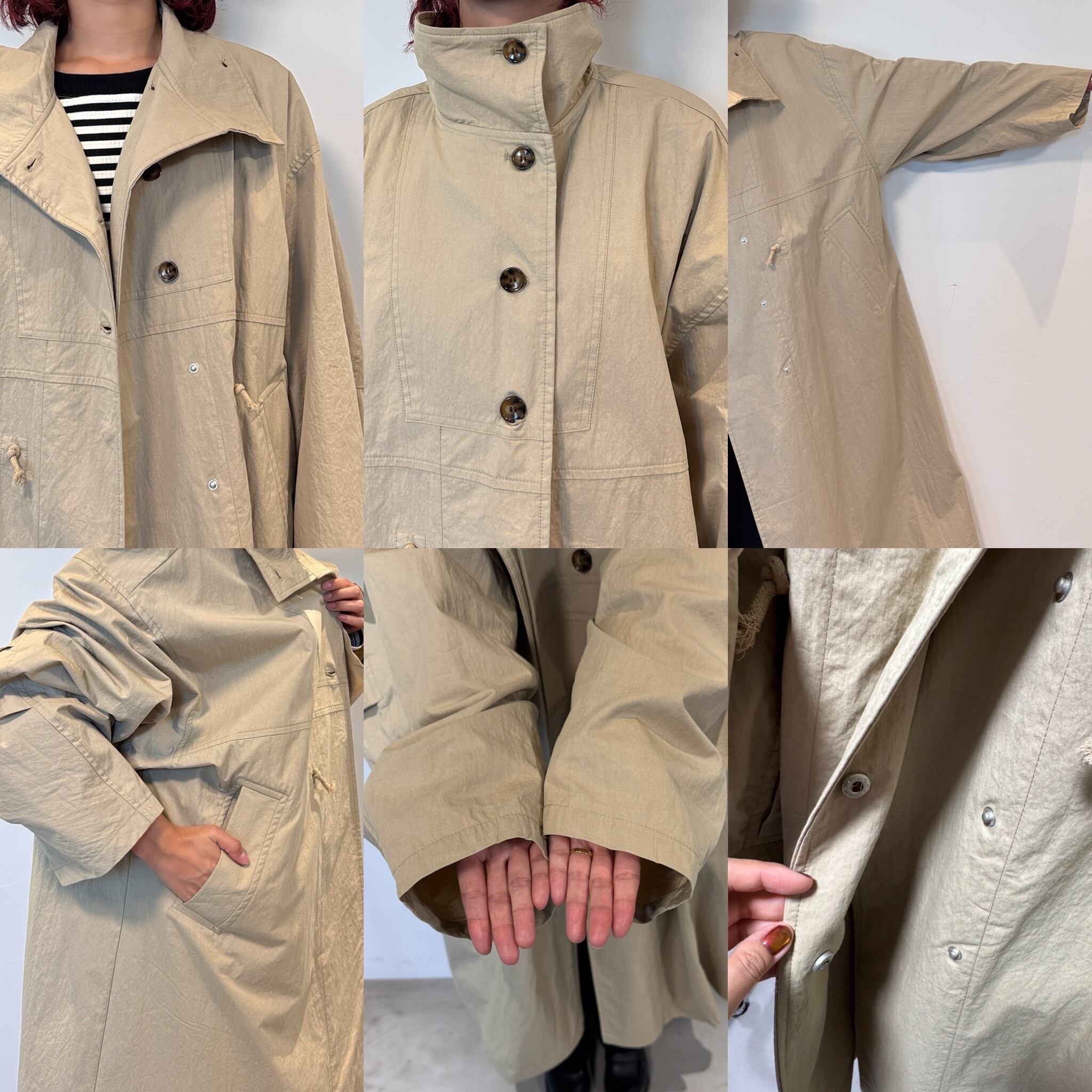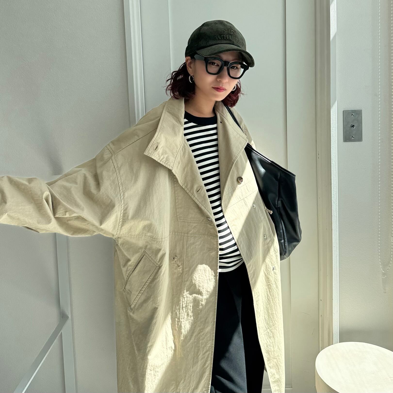 トレンドのオーバーサイズミリタリーコートです。程よくルーズなシルエットでドロップショルダーとスタンドカラーでこなれた印象の軽アウター。シャリ感のある軽量なコットン混で、ぱさっと羽織れるゆるい雰囲気が今っぽさ◎