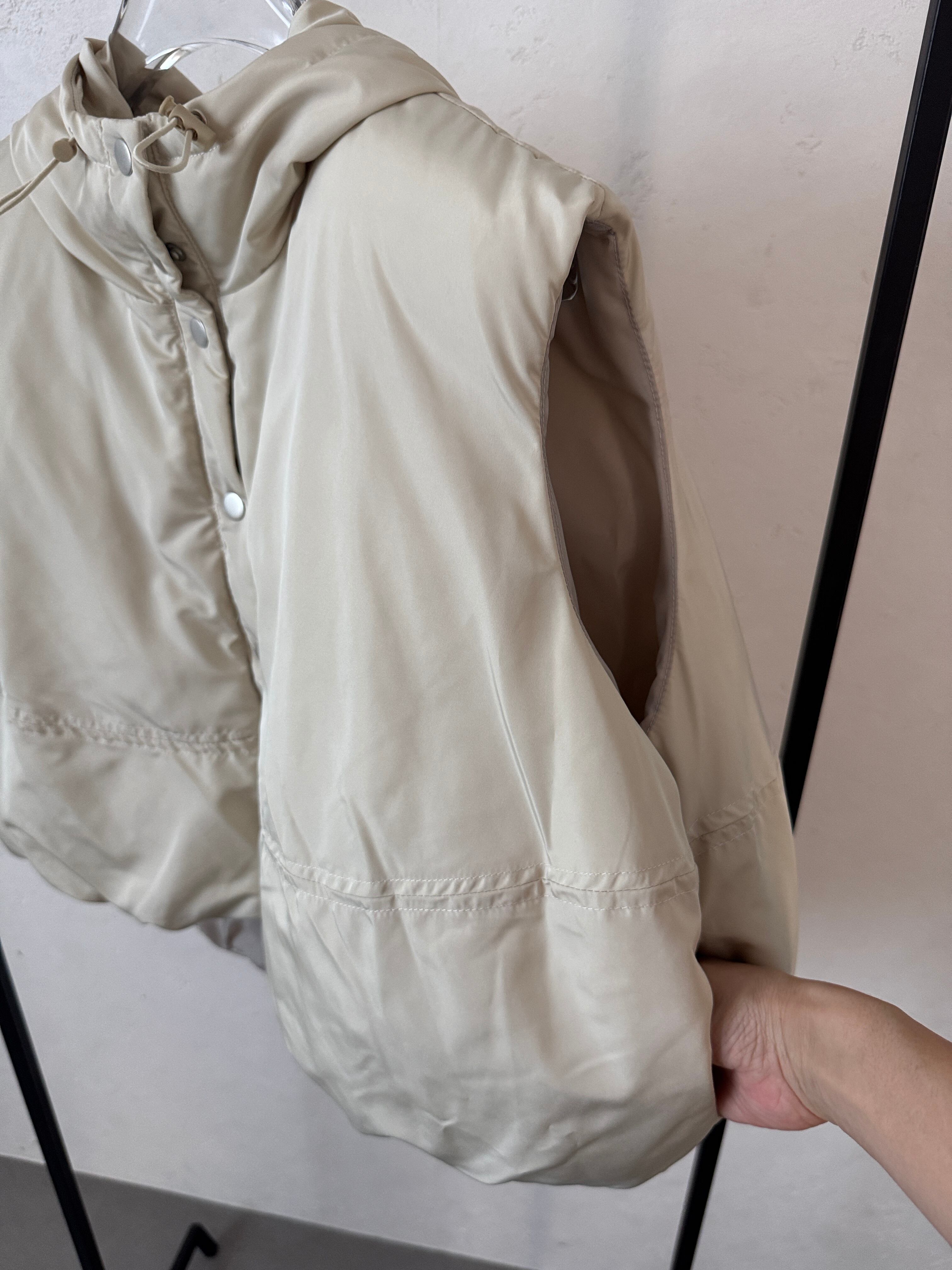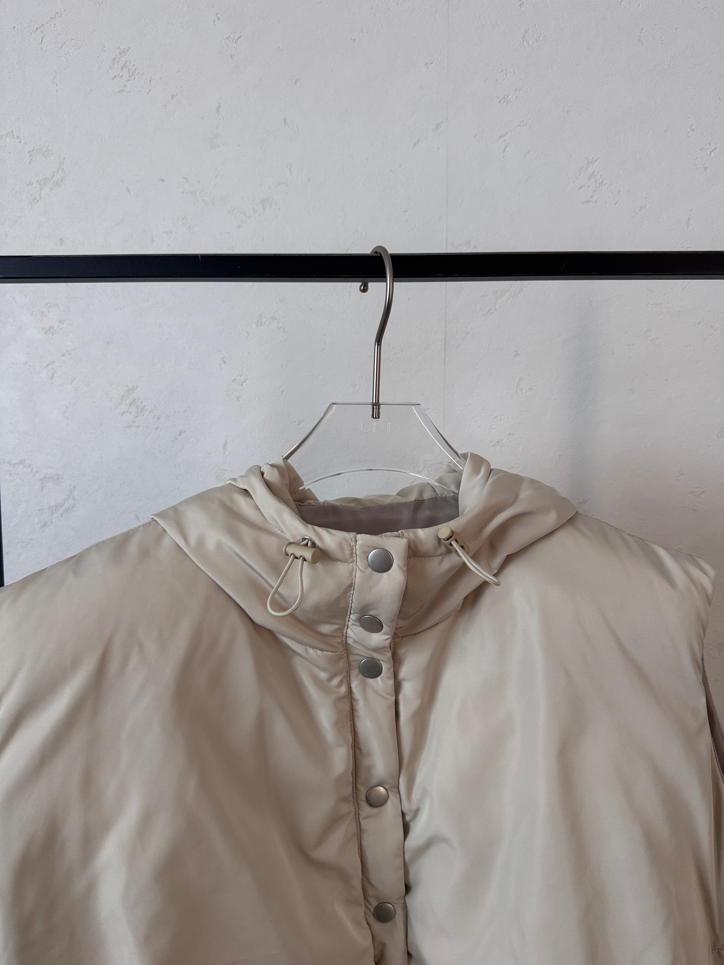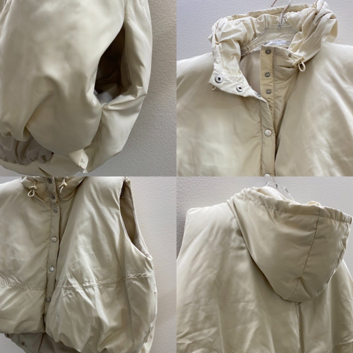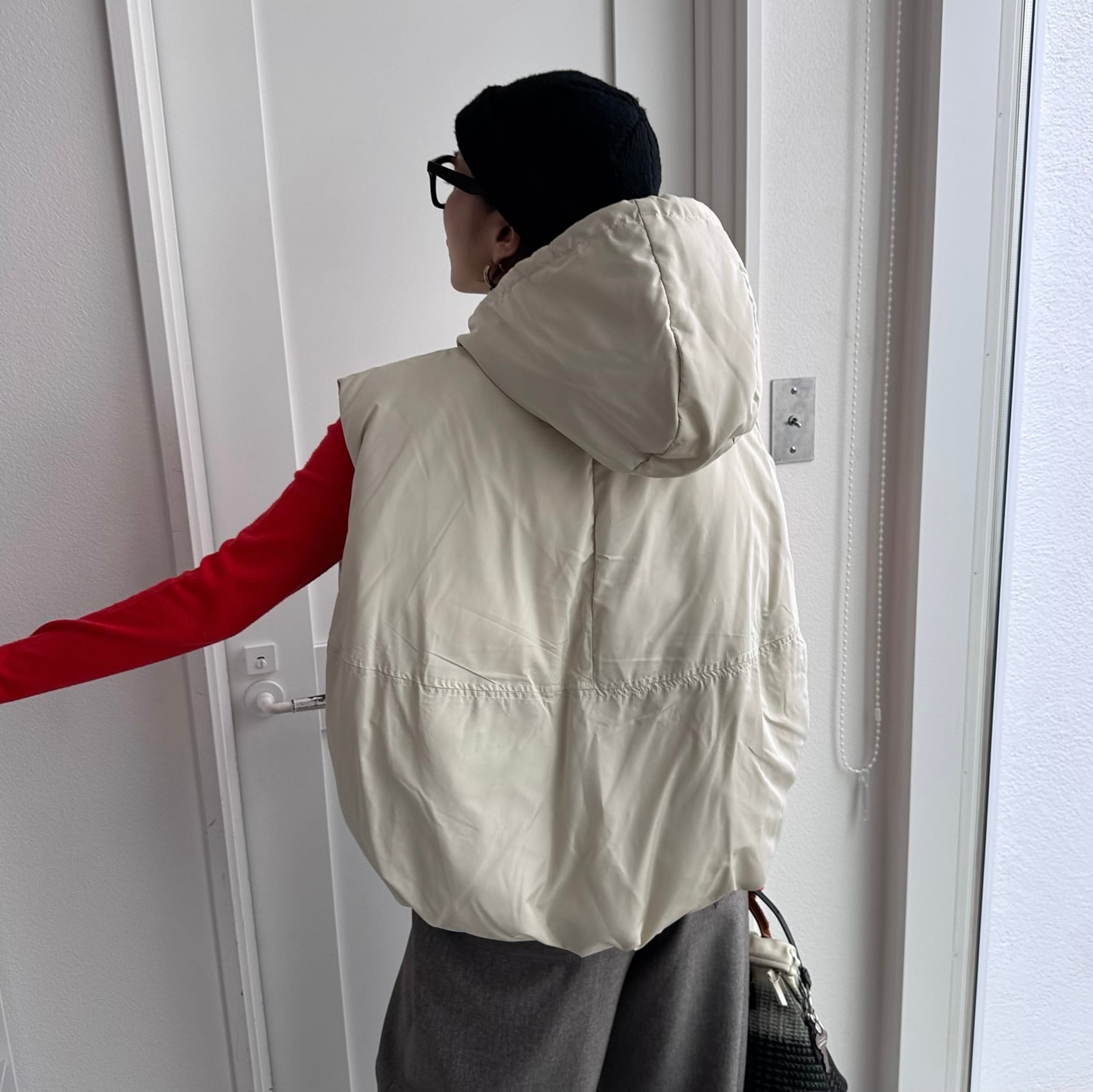 ダウンのような温かさのあるファイバーダウンを使用したフード付きベスト。フード部分にも中綿が施されておりフードの立ち上がりも良く防寒性にも優れています。裾がバルーンになっており、コロンとしたフォルムが可愛く前後差のあるデザインなのでこなれ感もプラスされています。