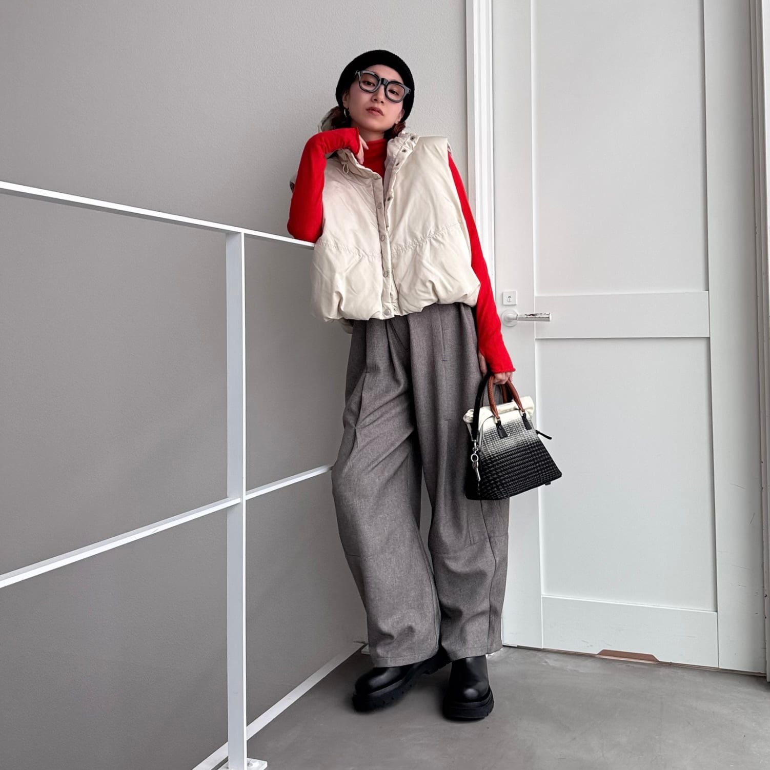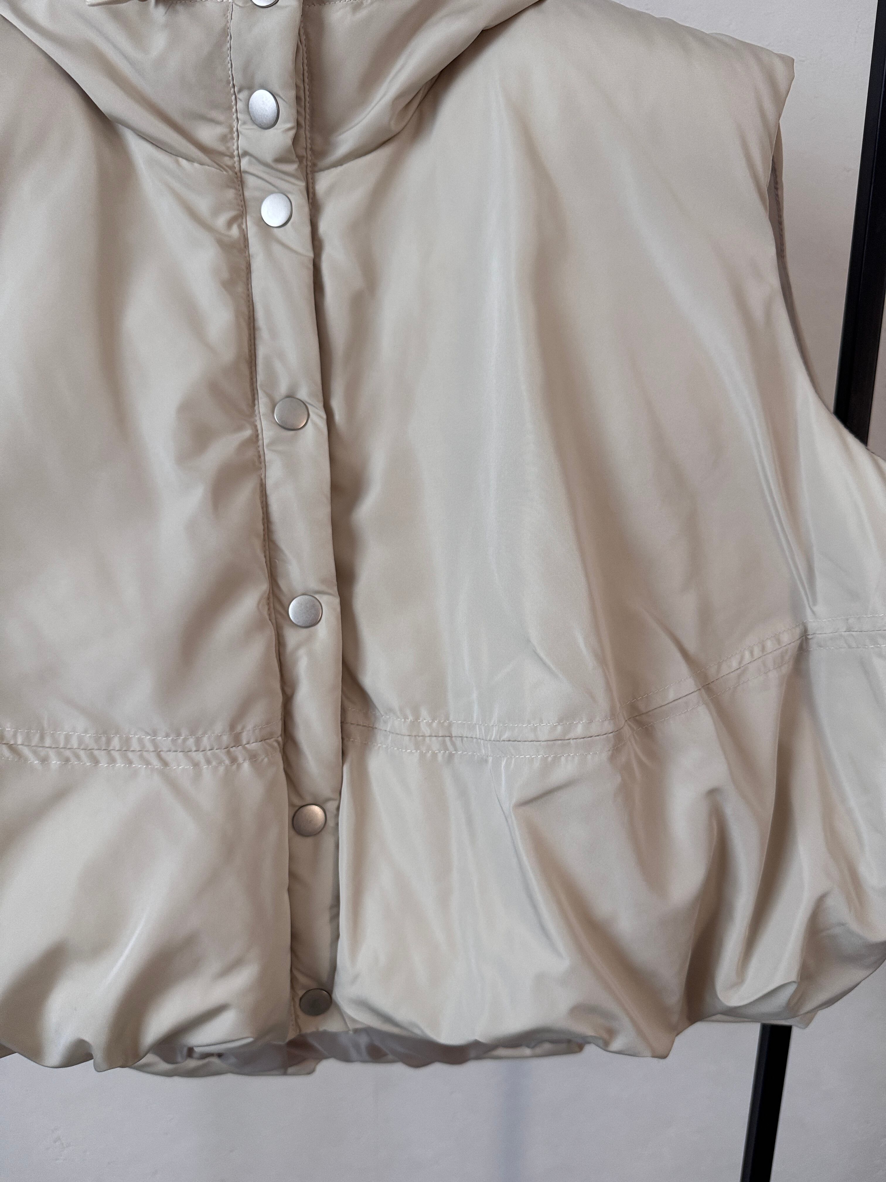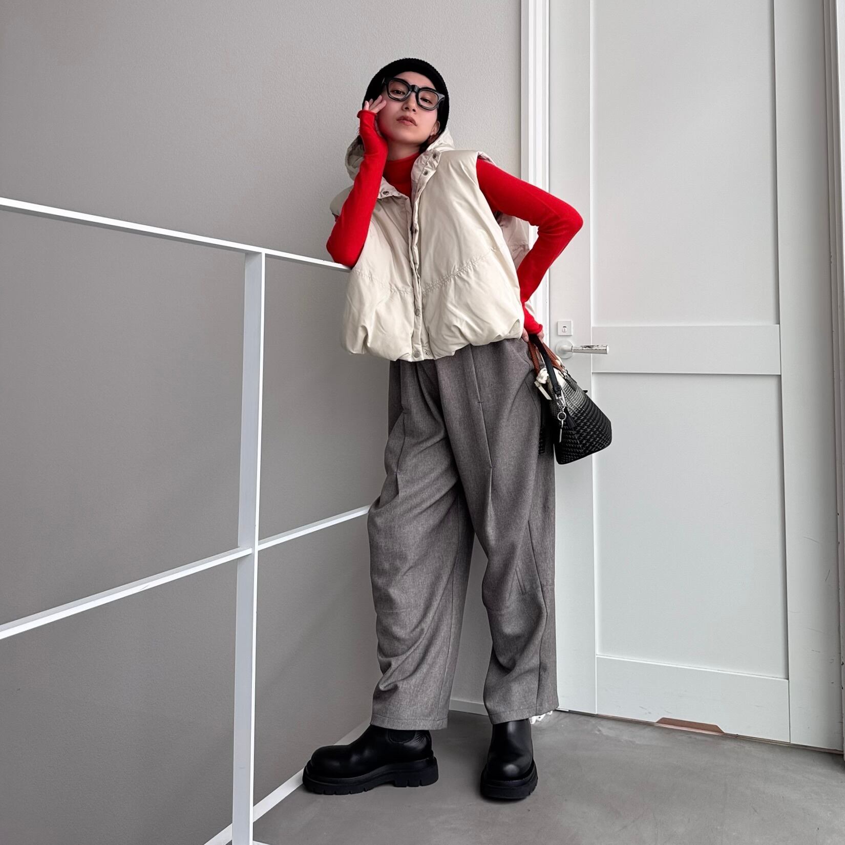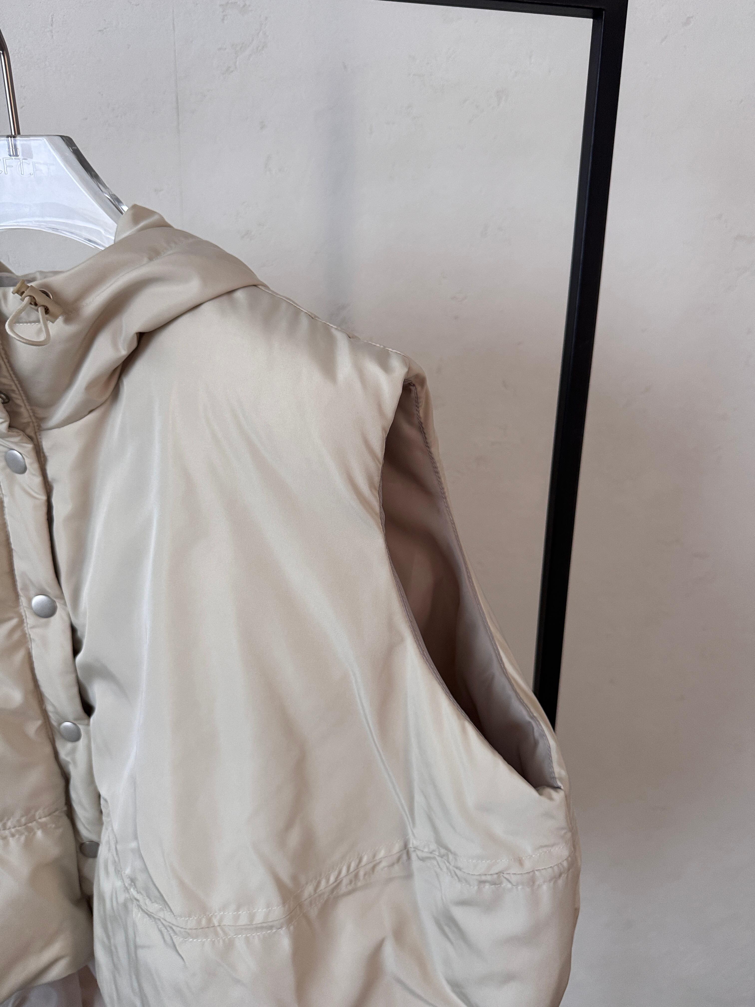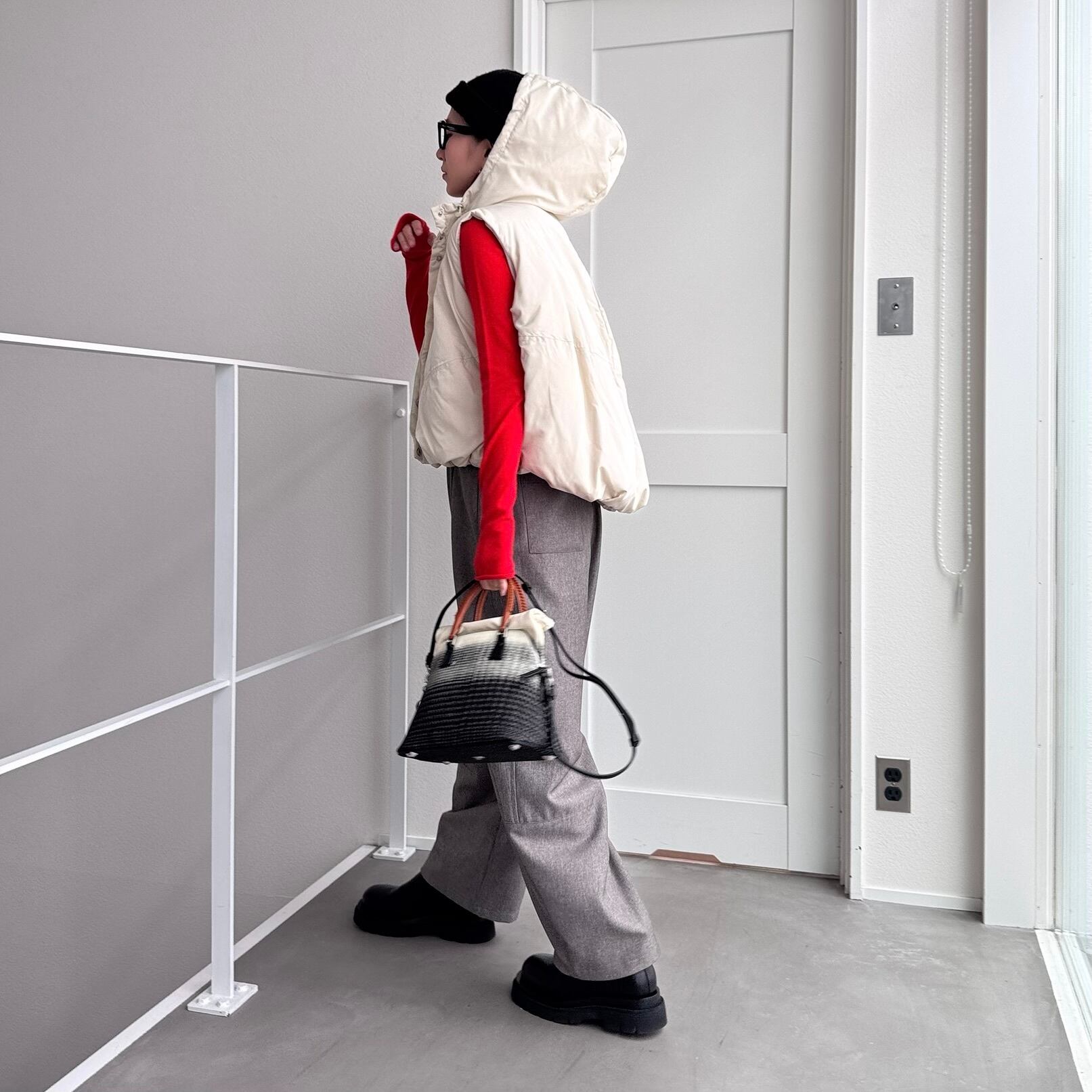ダウンのような温かさのあるファイバーダウンを使用したフード付きベスト。フード部分にも中綿が施されておりフードの立ち上がりも良く防寒性にも優れています。裾がバルーンになっており、コロンとしたフォルムが可愛く前後差のあるデザインなのでこなれ感もプラスされています。