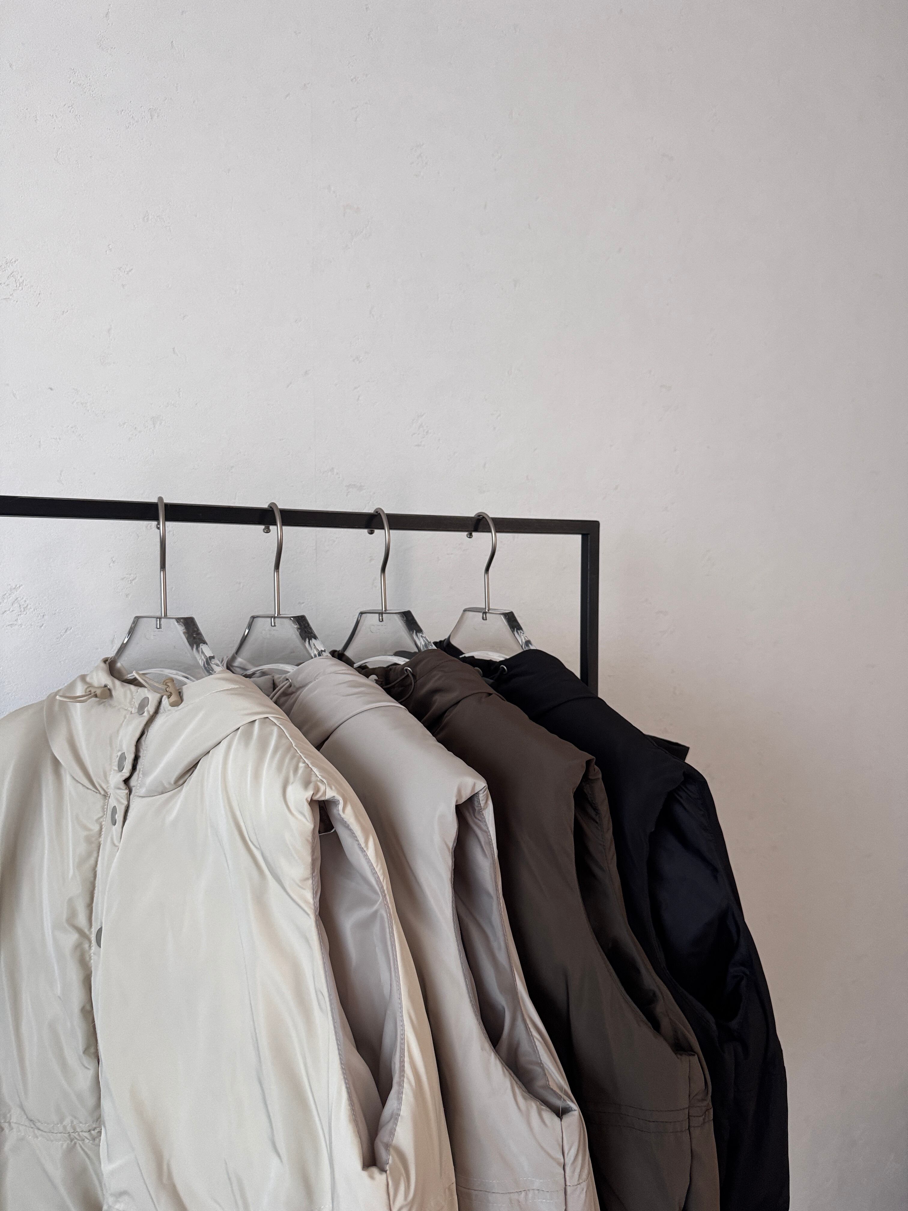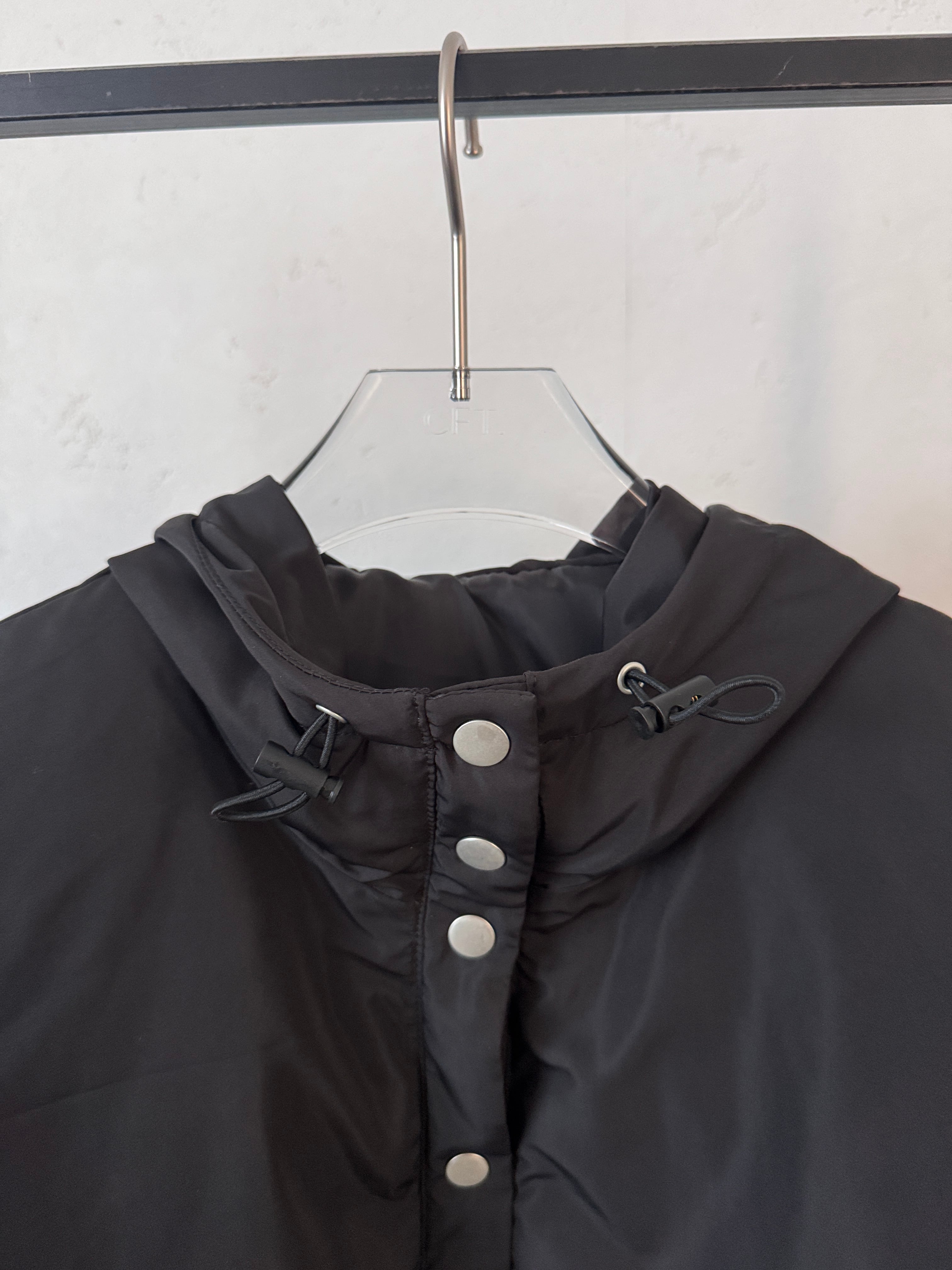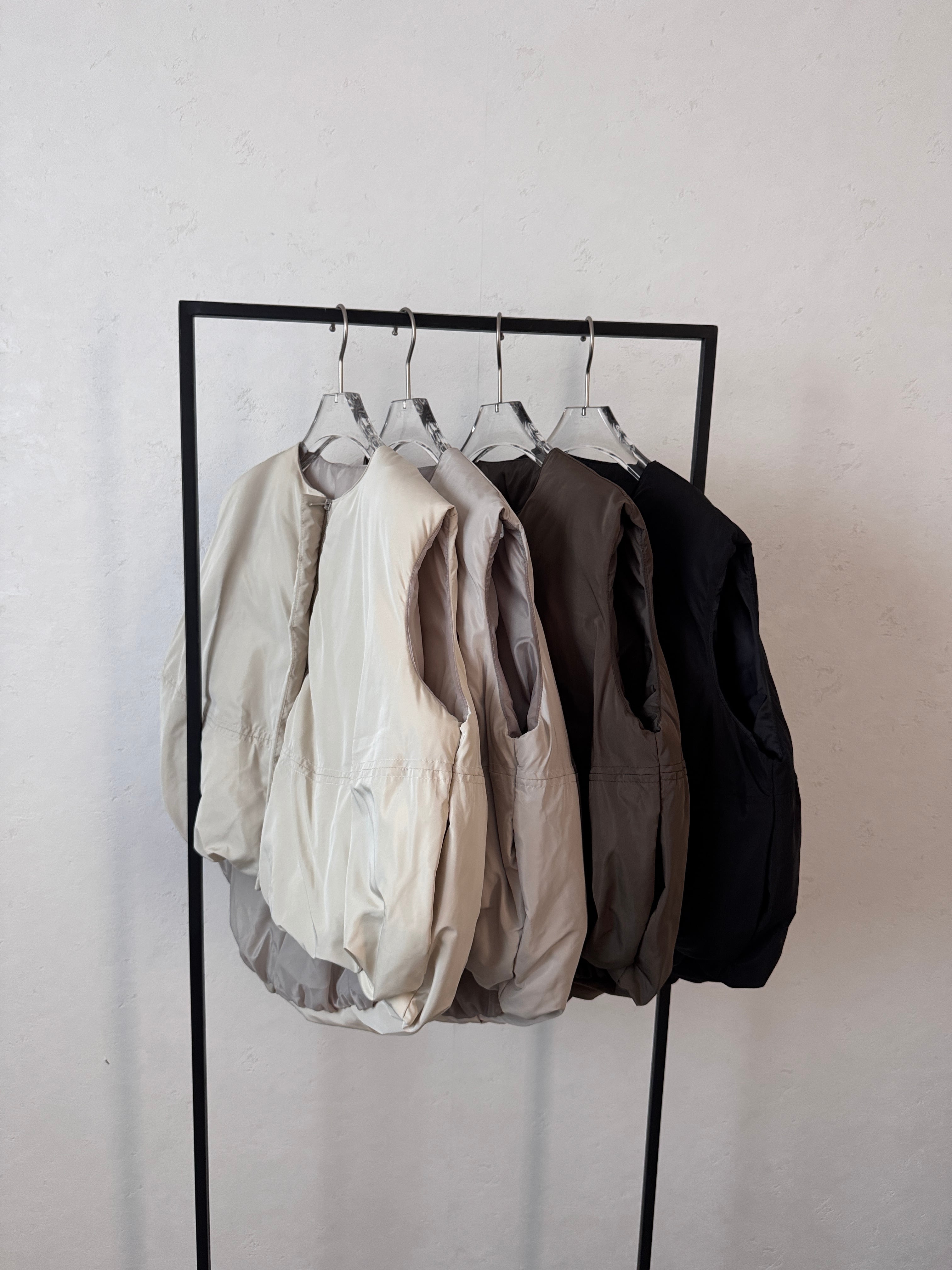 ダウンのような温かさのあるファイバーダウンを使用したフード付きベスト。フード部分にも中綿が施されておりフードの立ち上がりも良く防寒性にも優れています。裾がバルーンになっており、コロンとしたフォルムが可愛く前後差のあるデザインなのでこなれ感もプラスされています。