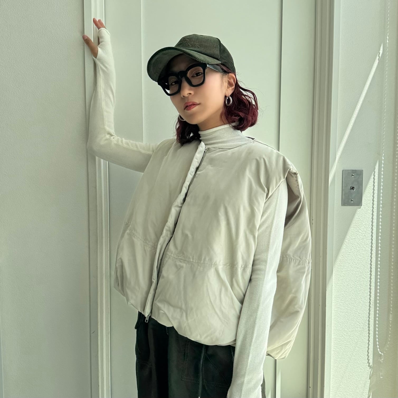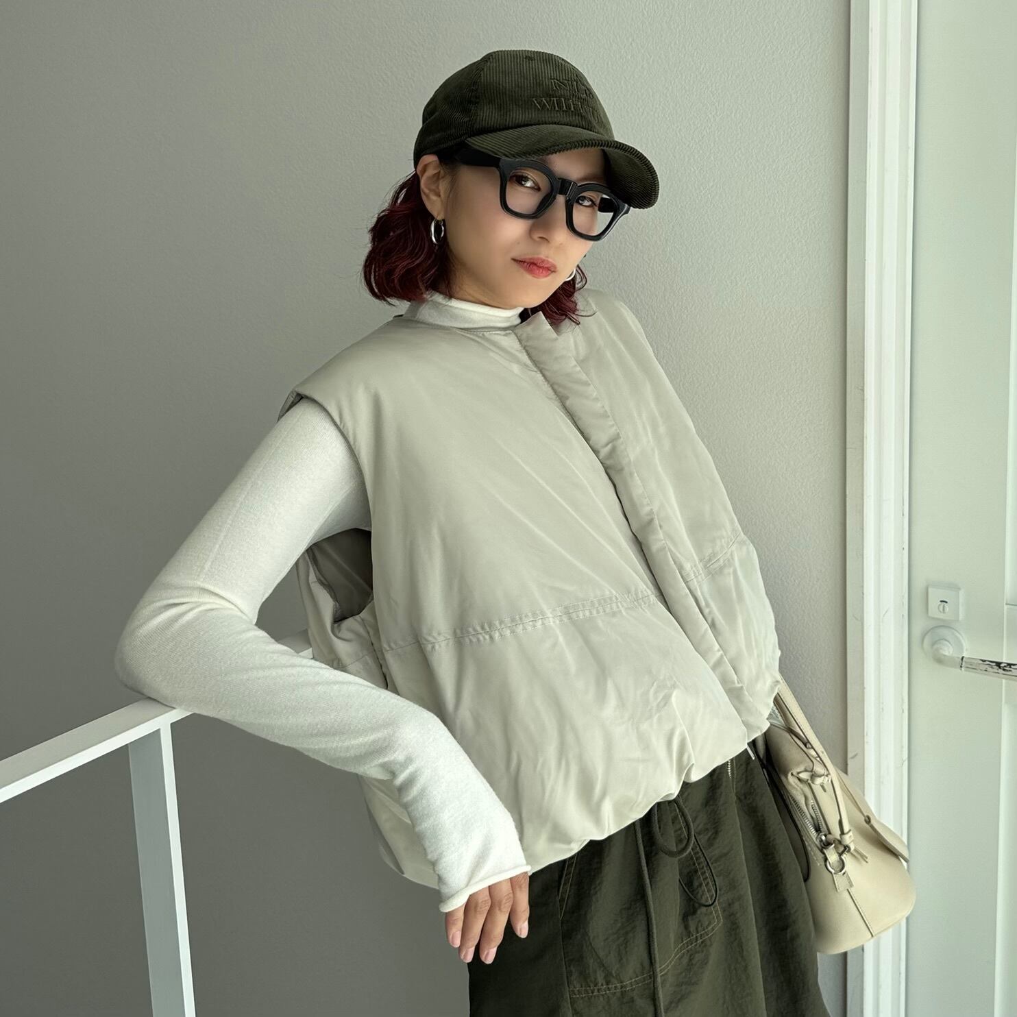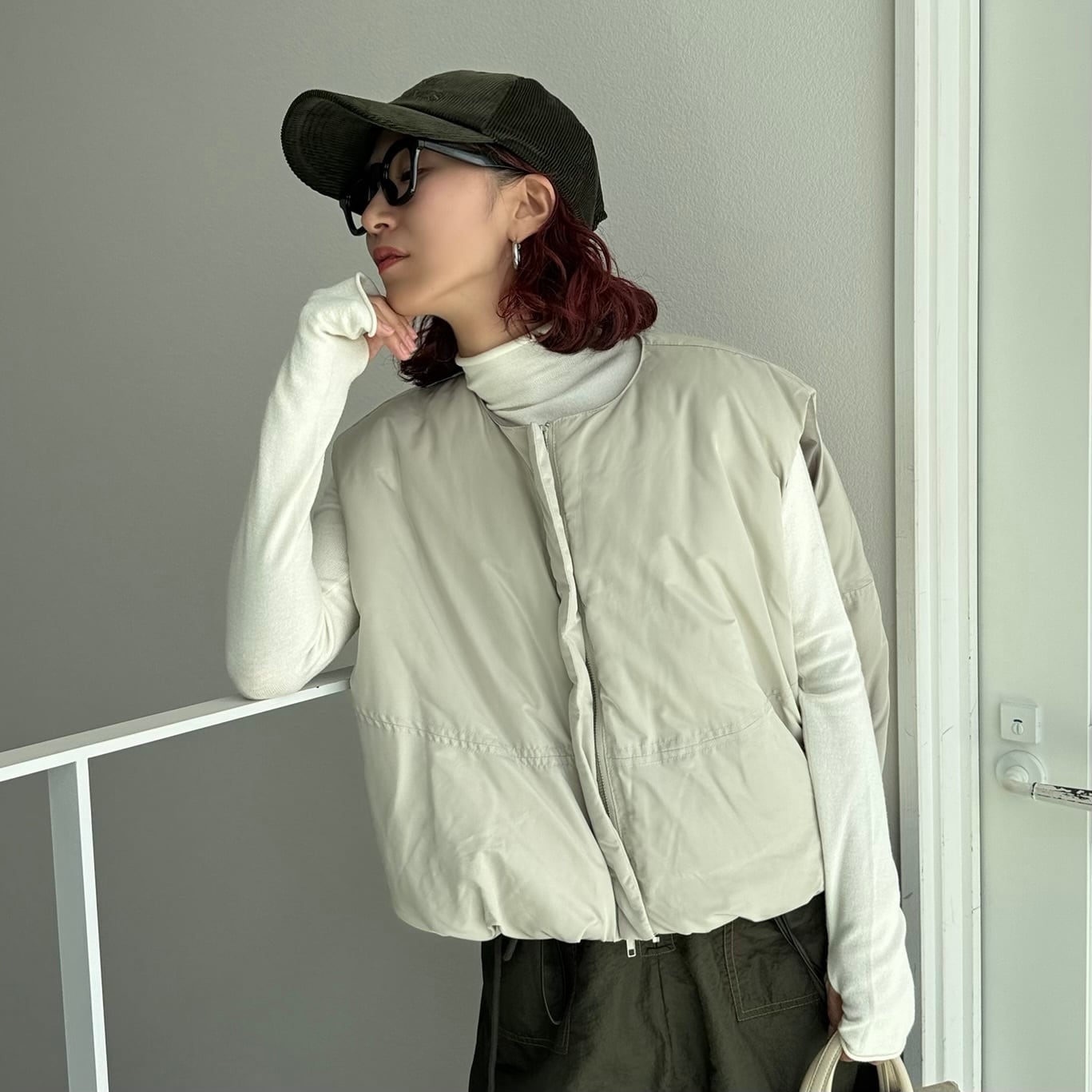 ダウンのような温かさのあるファイバーダウンを使用したノーカラーベスト。すっきりとしたノーカラーデザインでパーカーやハイネックのインナーとも相性抜群。非常に高い保温性もある為防寒としてもピッタリ。裾がバルーンになっており、コロンとしたフォルムが可愛く前後差のあるデザインなのでこなれ感もプラスされています。