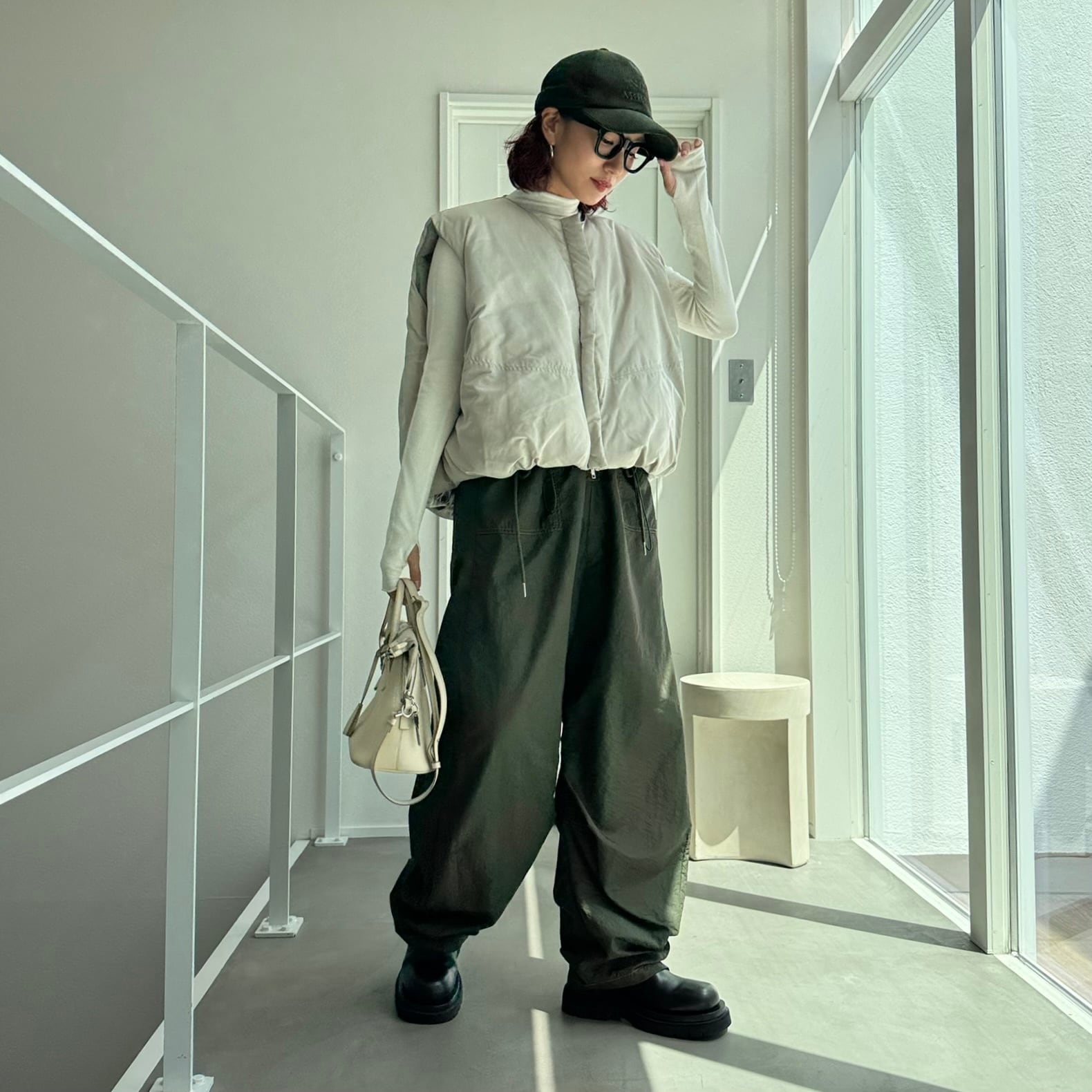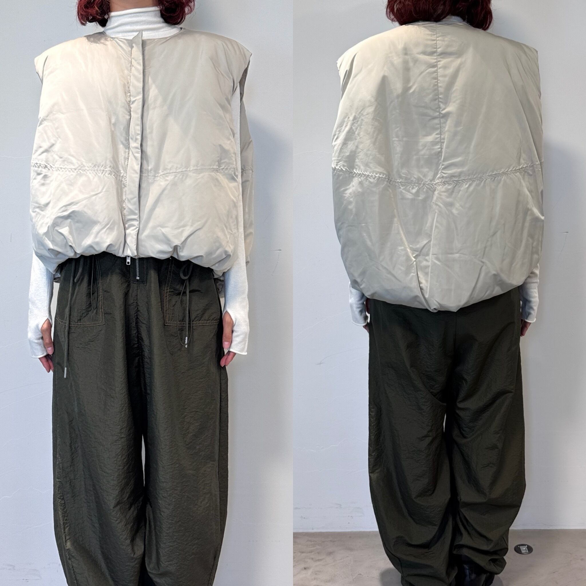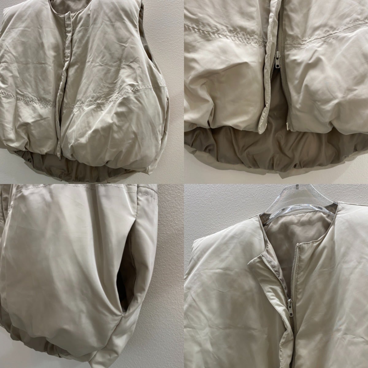 ダウンのような温かさのあるファイバーダウンを使用したノーカラーベスト。すっきりとしたノーカラーデザインでパーカーやハイネックのインナーとも相性抜群。非常に高い保温性もある為防寒としてもピッタリ。裾がバルーンになっており、コロンとしたフォルムが可愛く前後差のあるデザインなのでこなれ感もプラスされています。