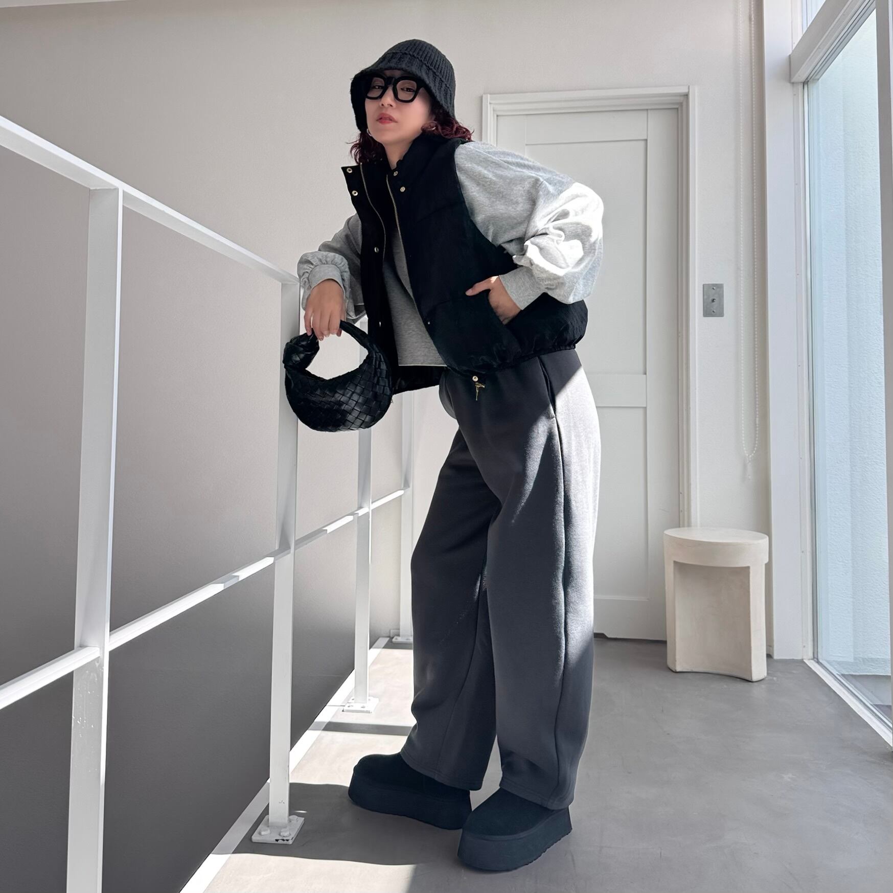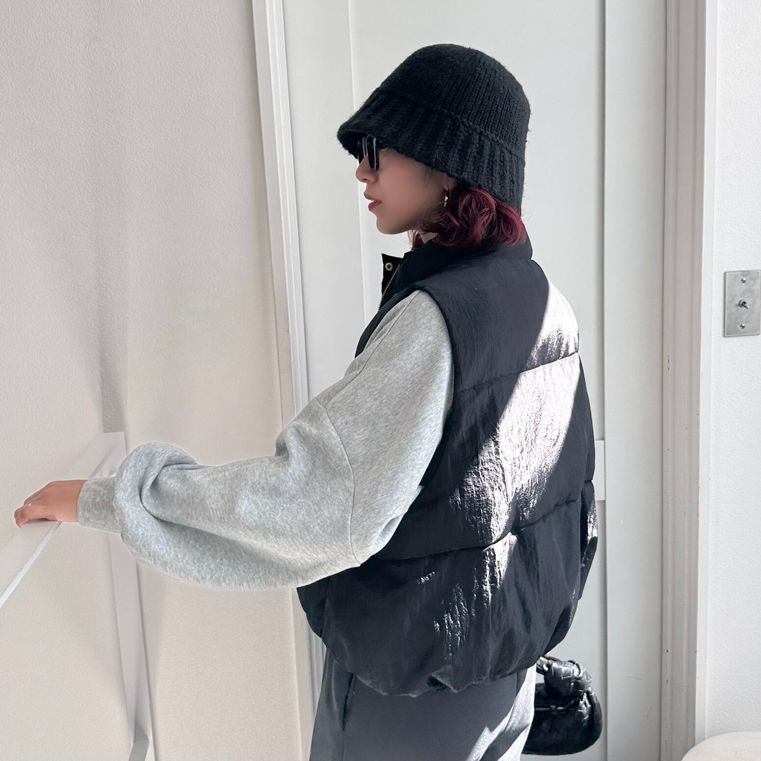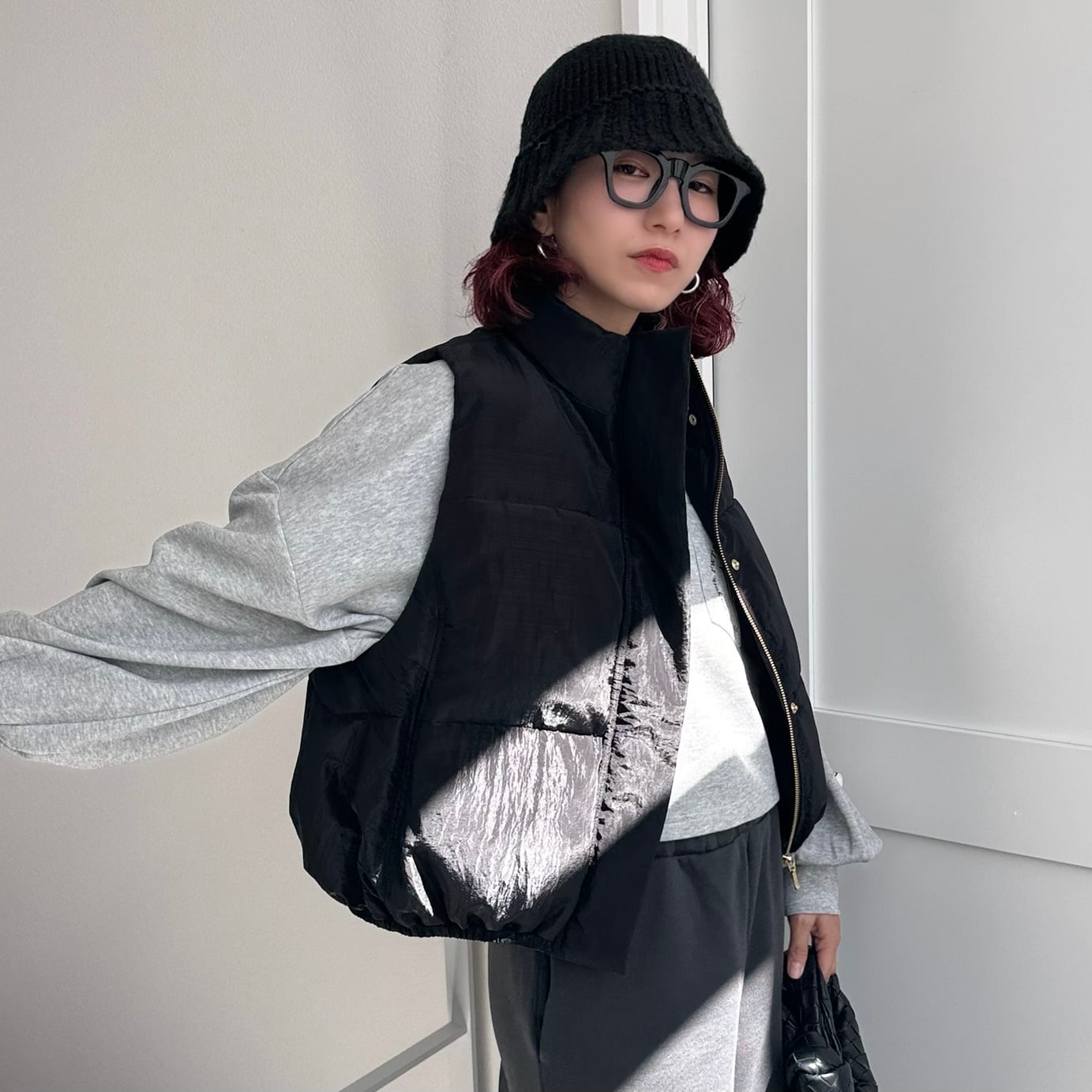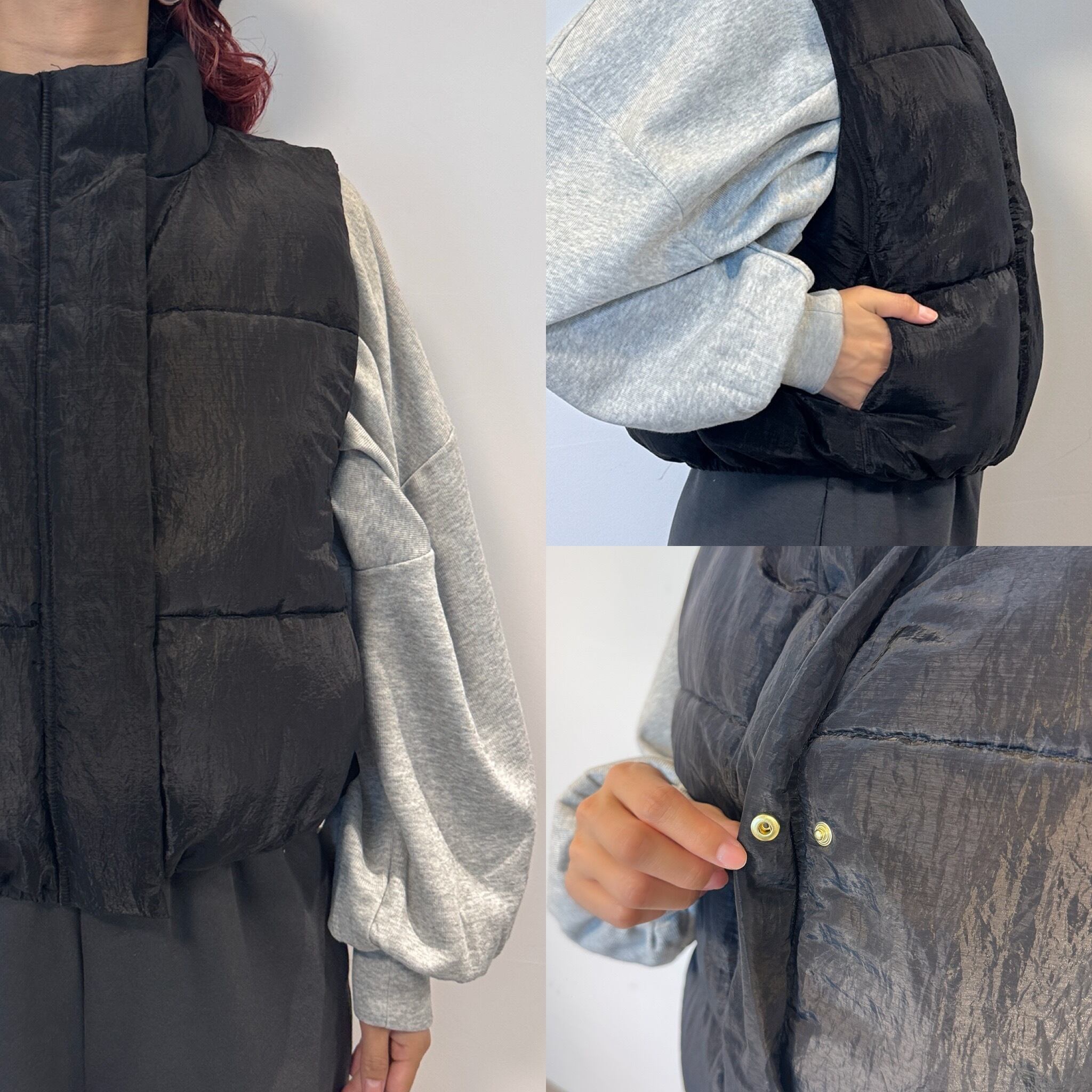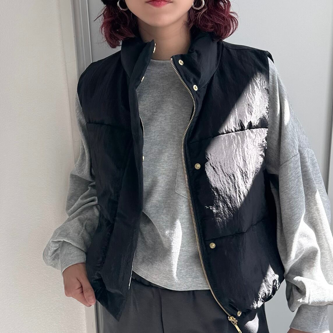 光沢のあるナイロンの中綿ベスト。着丈は程よいショート加減さ◎ 裾は少しバルーンシルエットに仕上っています。金具は全色ゴールドで大人っぽく。ネックも高すぎず、アームホール広めなので、どんなインナーにも合わせやすく重宝するアイテムです。ポケット袋布は、あたたかなフリース素材。ニットやスウェット、シャツ合わせなど幅広いコーデにプラスしていただけます。