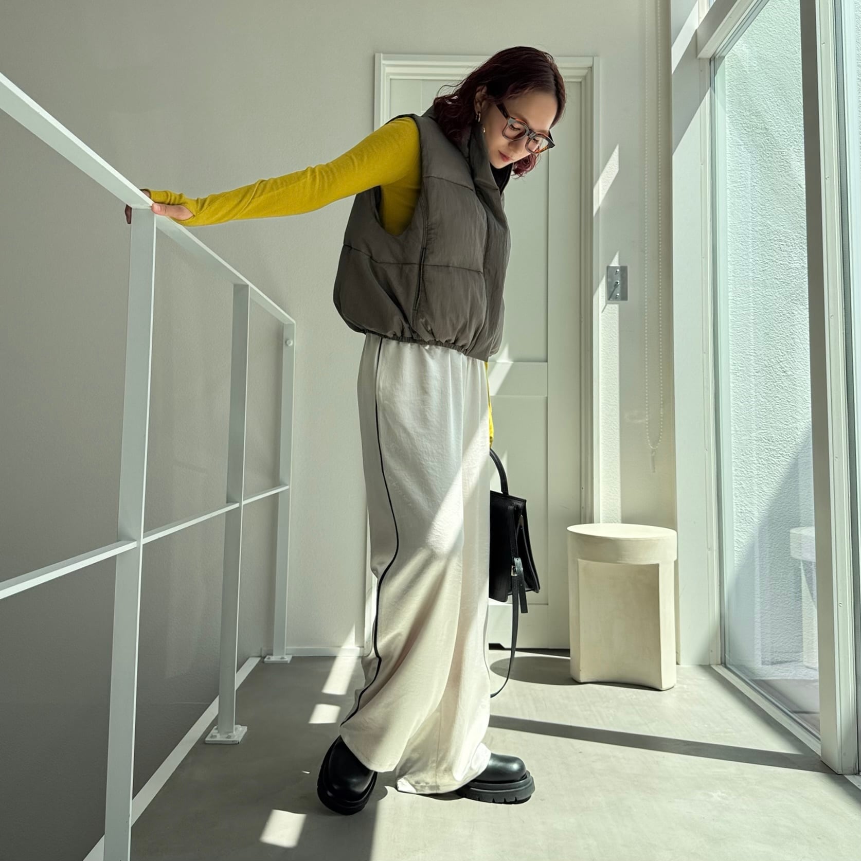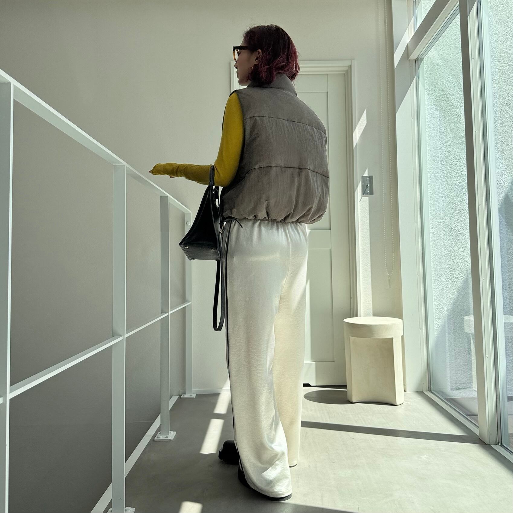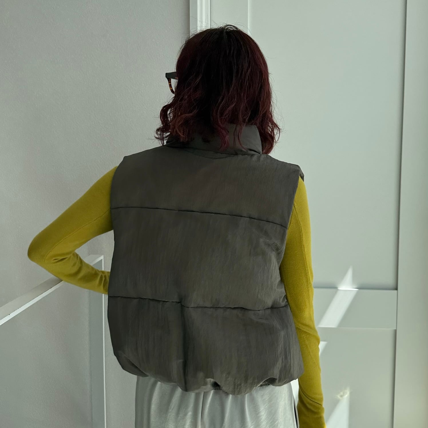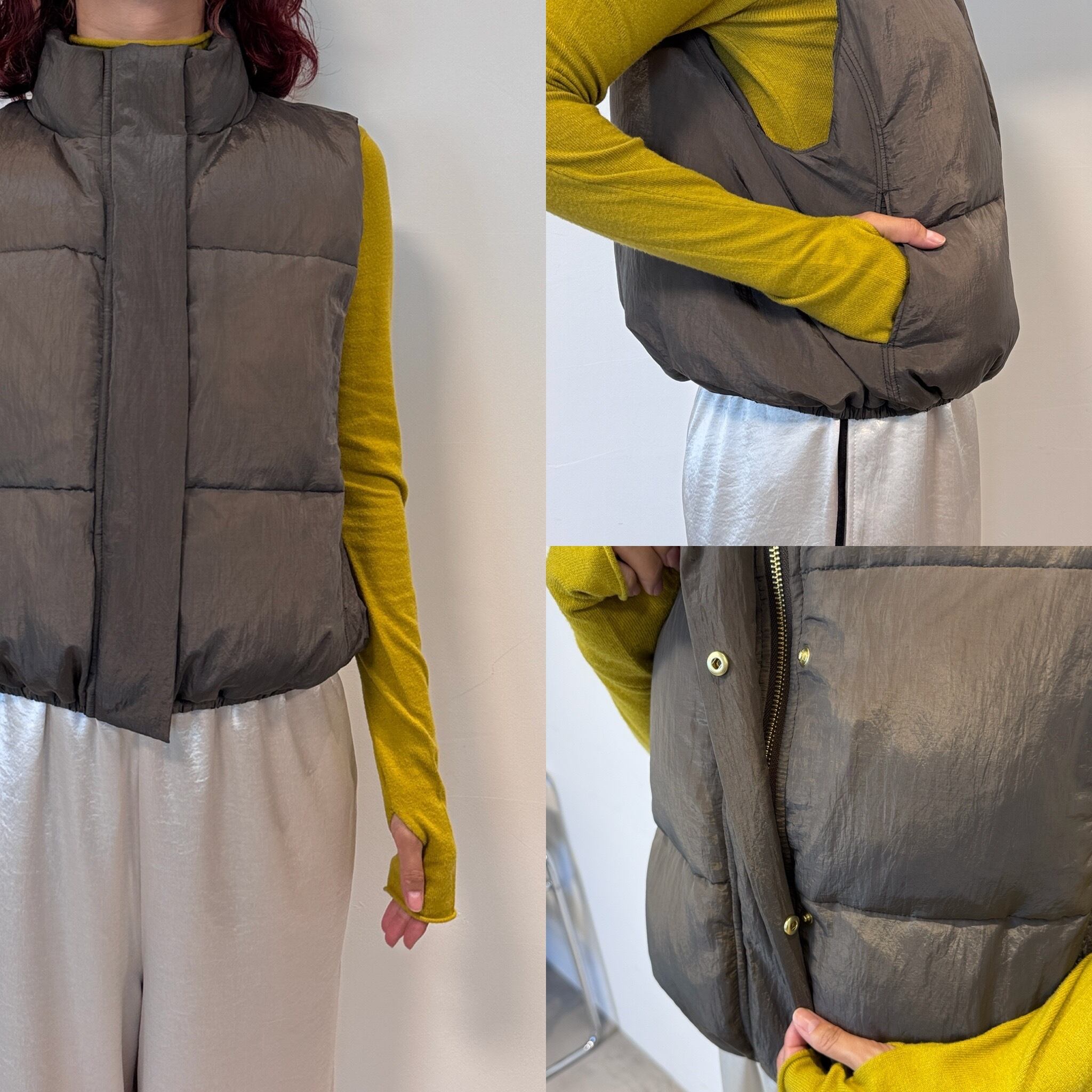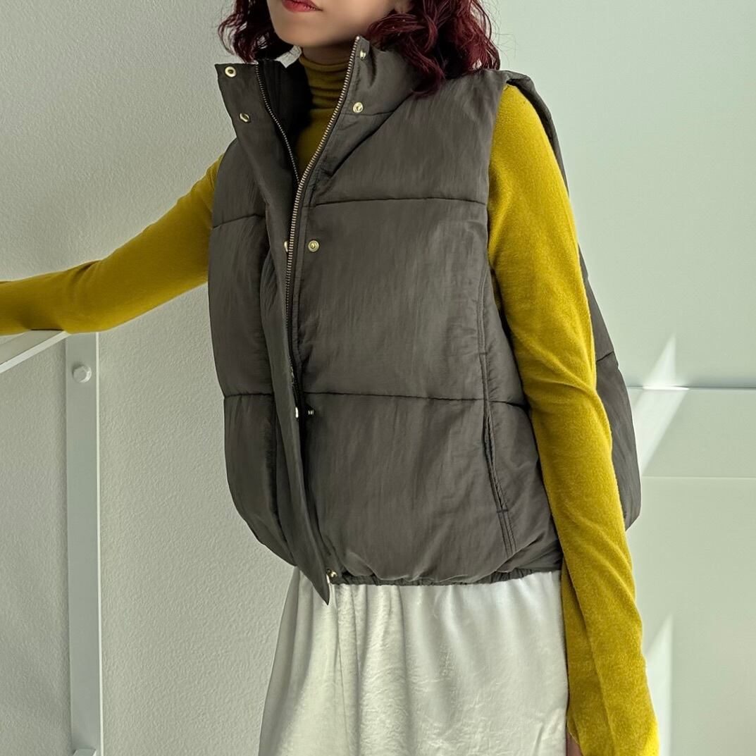 光沢のあるナイロンの中綿ベスト。着丈は程よいショート加減さ◎ 裾は少しバルーンシルエットに仕上っています。金具は全色ゴールドで大人っぽく。ネックも高すぎず、アームホール広めなので、どんなインナーにも合わせやすく重宝するアイテムです。ポケット袋布は、あたたかなフリース素材。ニットやスウェット、シャツ合わせなど幅広いコーデにプラスしていただけます。