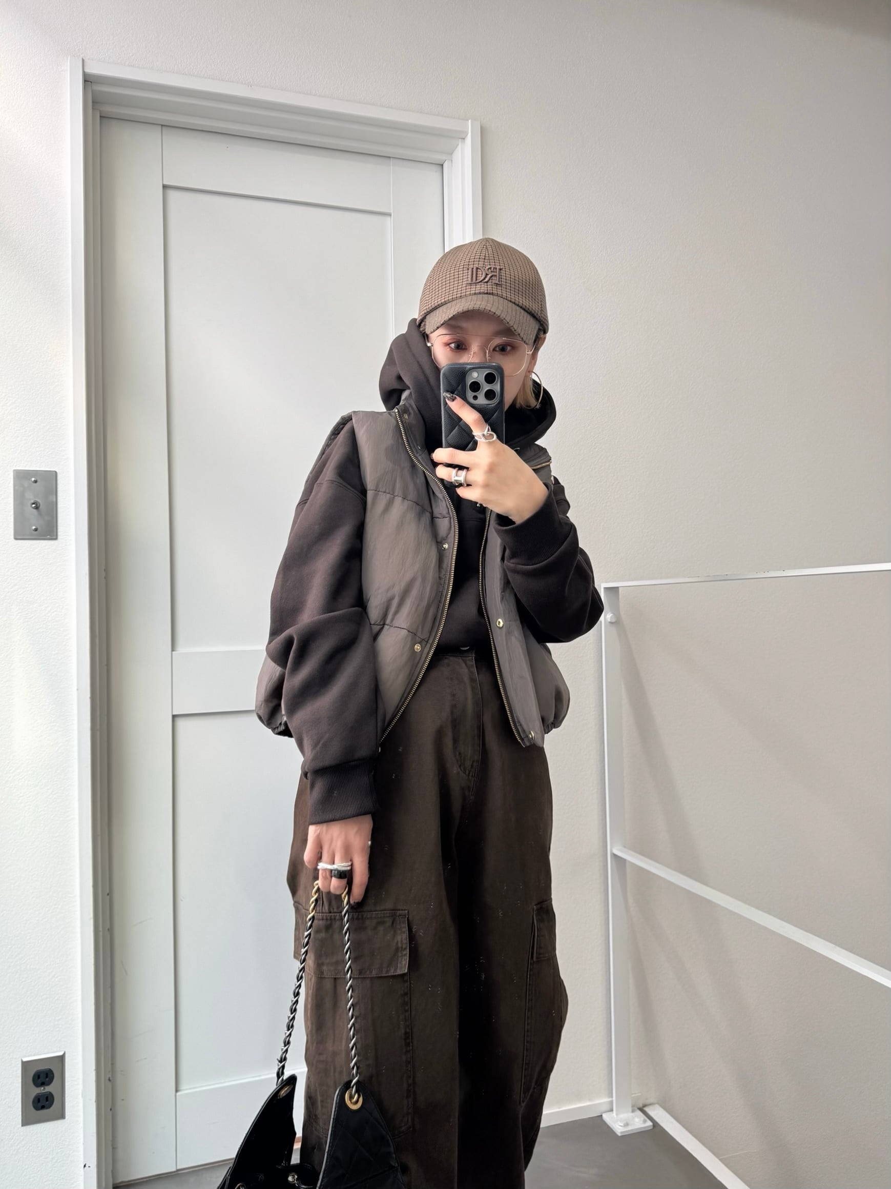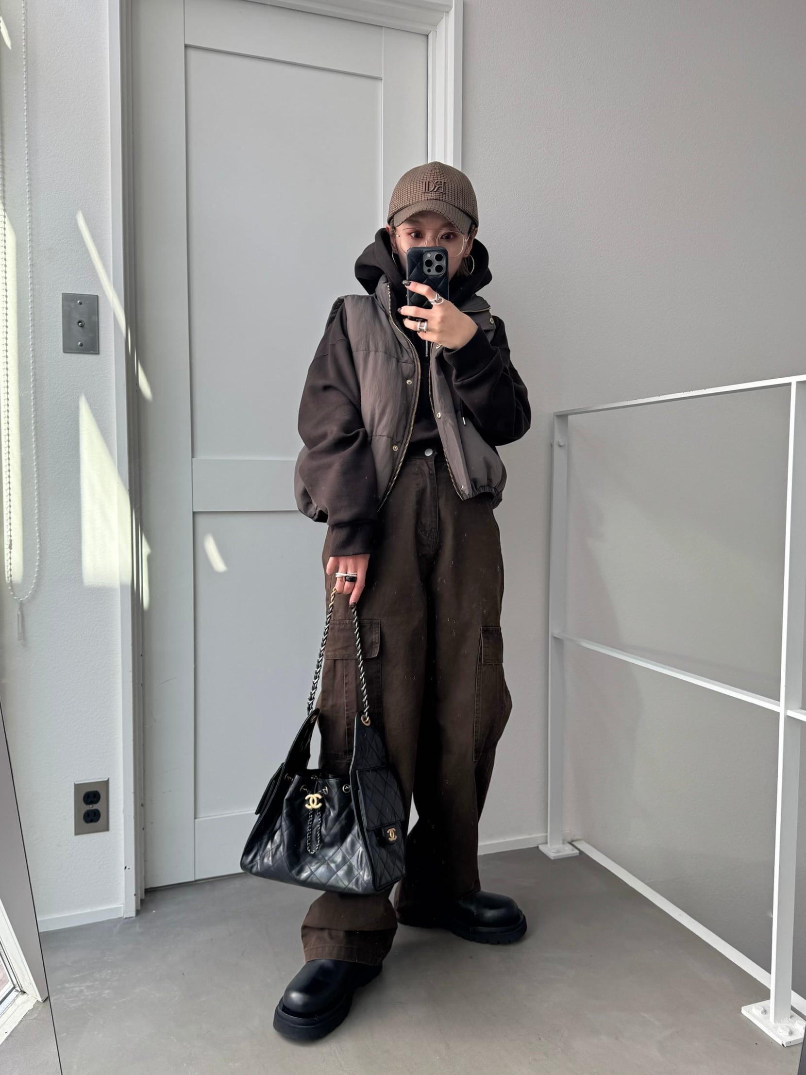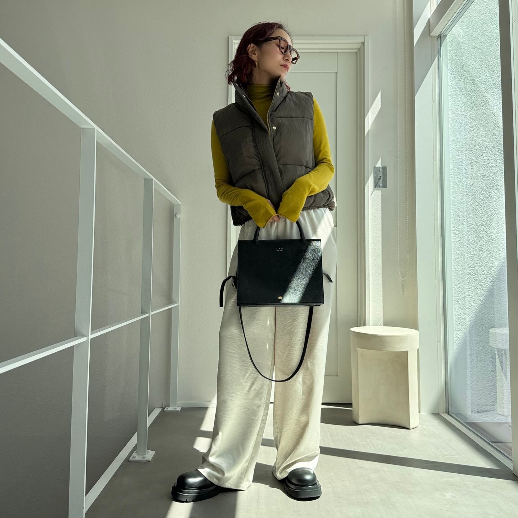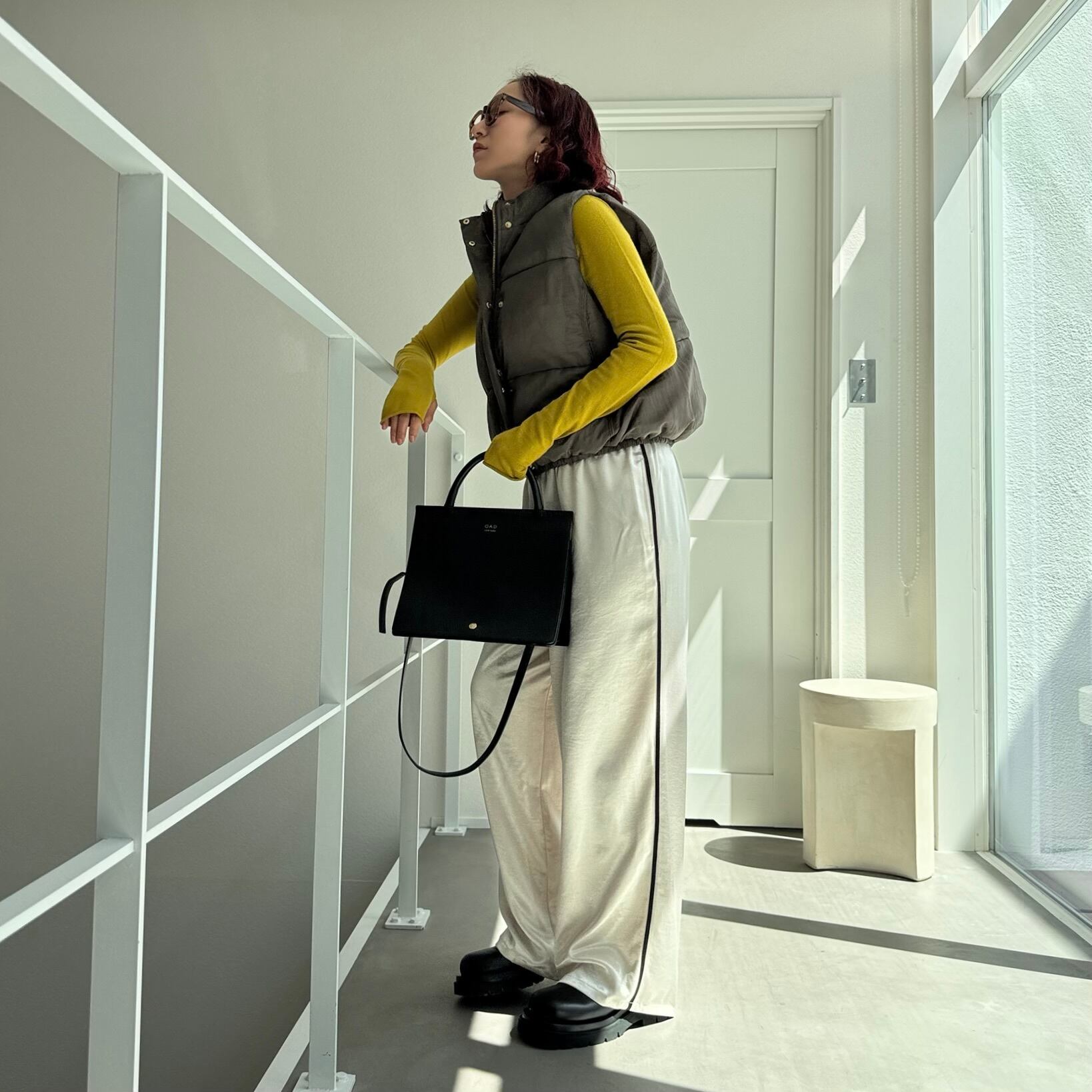 光沢のあるナイロンの中綿ベスト。着丈は程よいショート加減さ◎ 裾は少しバルーンシルエットに仕上っています。金具は全色ゴールドで大人っぽく。ネックも高すぎず、アームホール広めなので、どんなインナーにも合わせやすく重宝するアイテムです。ポケット袋布は、あたたかなフリース素材。ニットやスウェット、シャツ合わせなど幅広いコーデにプラスしていただけます。