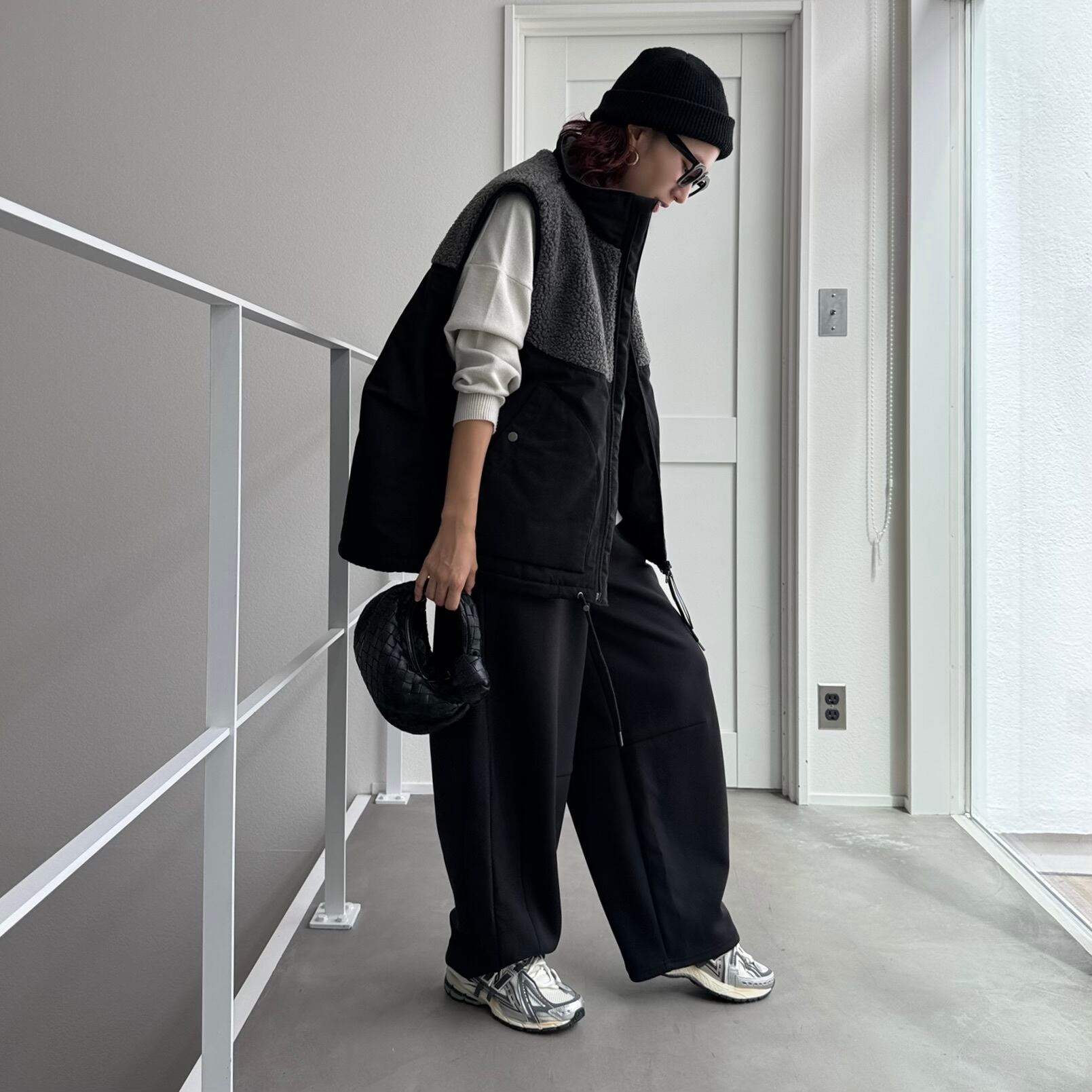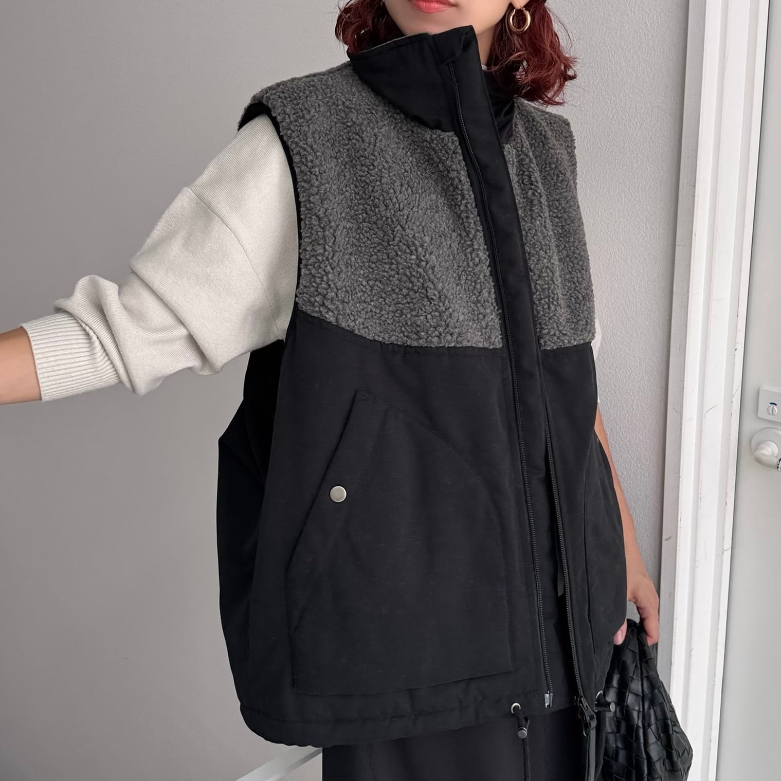 ボア×ピーチ素材切替ベスト。中綿仕様で暖かく快適に。いつものコーデに一点投入するだけで、旬のレイヤードスタイルが叶います。厚みのあるスウェットやニットの上にも羽織れるように、アームホールは広めに。ボア素材ならではのもこもことしたボリューム感がシーズンムードを高めてくれる一着です。