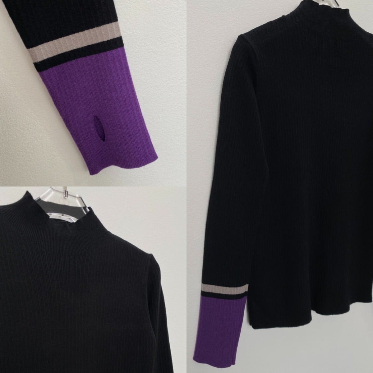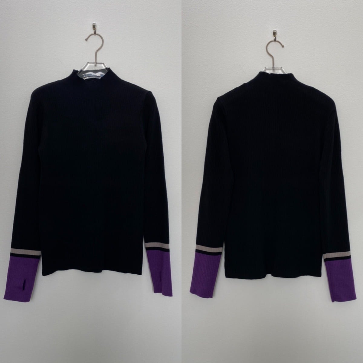 袖口の配色が可愛いハイネックニット。ボトルネックなので首元も暖かく小顔効果も◎袖口は指穴になっており細かいディテールにもこだわっています。身体のラインを拾いすぎず、やわらかく、もっちりとした着心地も嬉しいポイント。また、こちらの製品には静電気が発生しにくい加工をしており、着脱時の不快な静電気を軽減します。(感じ方には個人差があります。)