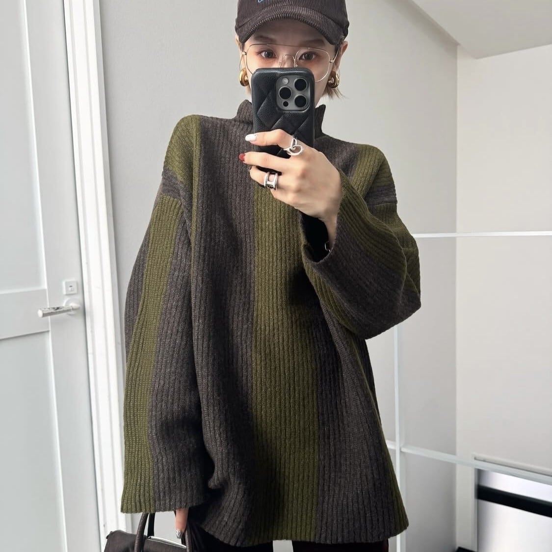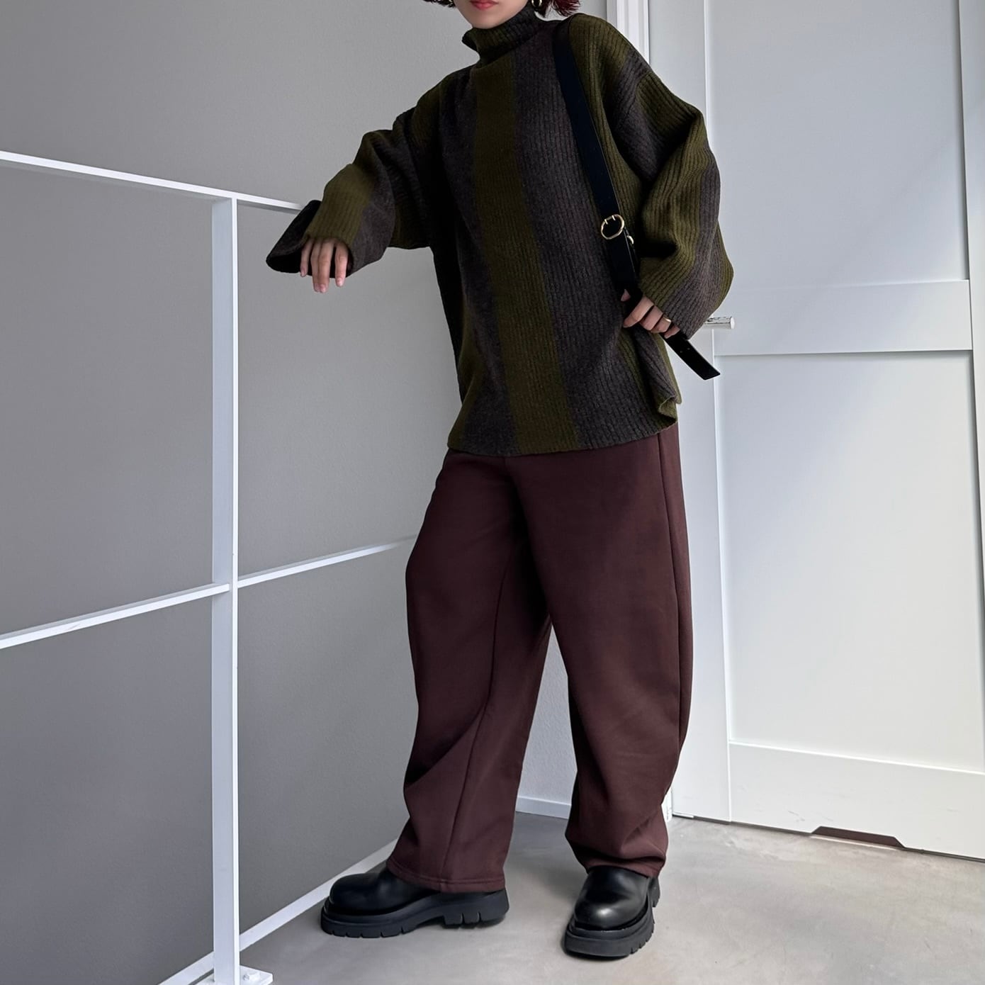 太めのストライプ柄が目を惹くボトルネックプルオーバー。スッキリとしたボトルネックは小顔効果もありつつ防寒にもピッタリです。袖丈も長めにデザインされており、ゆとりのあるシルエットなので体型カバーにも。ストライプ柄ニットを主役にしたスタイリングがおすすめです。