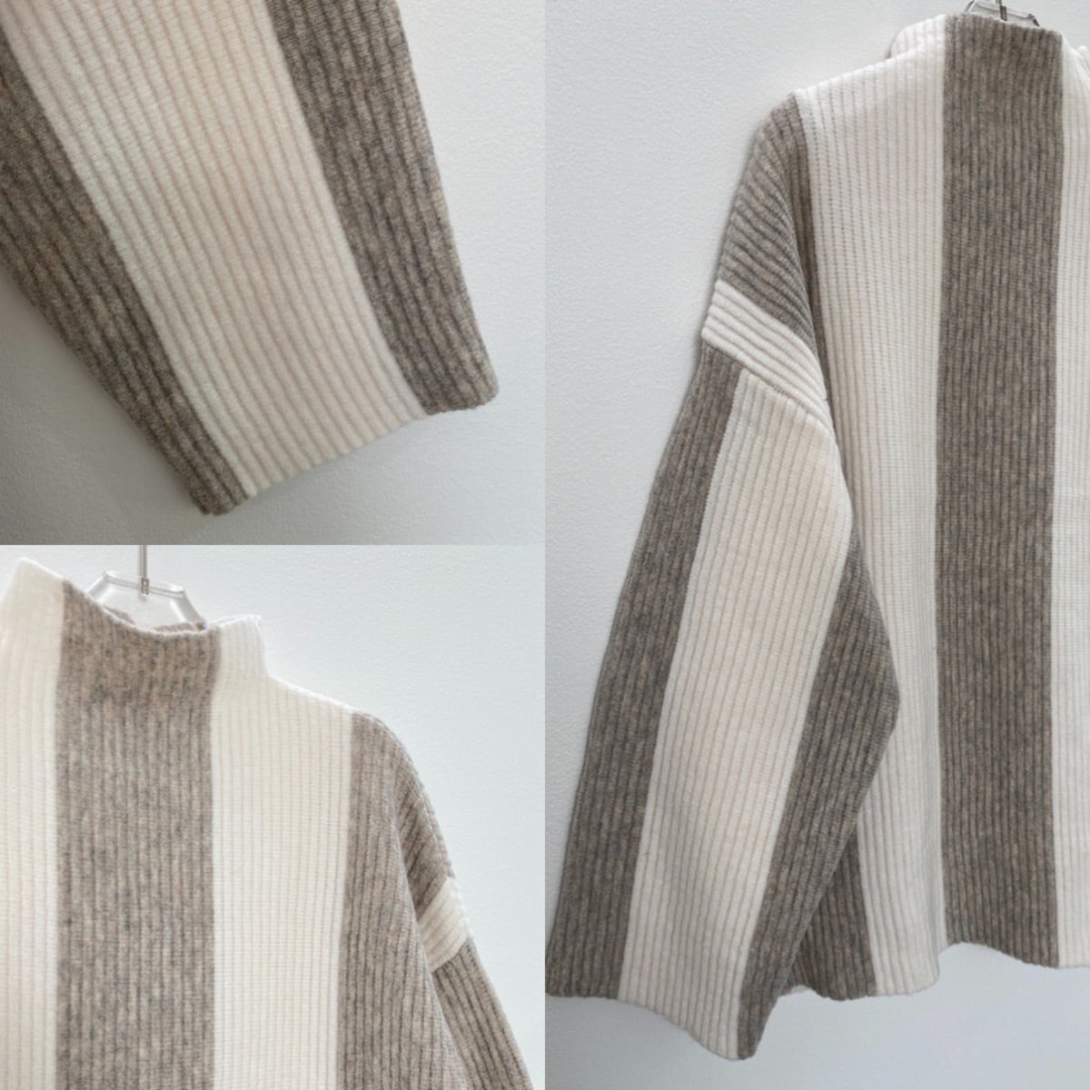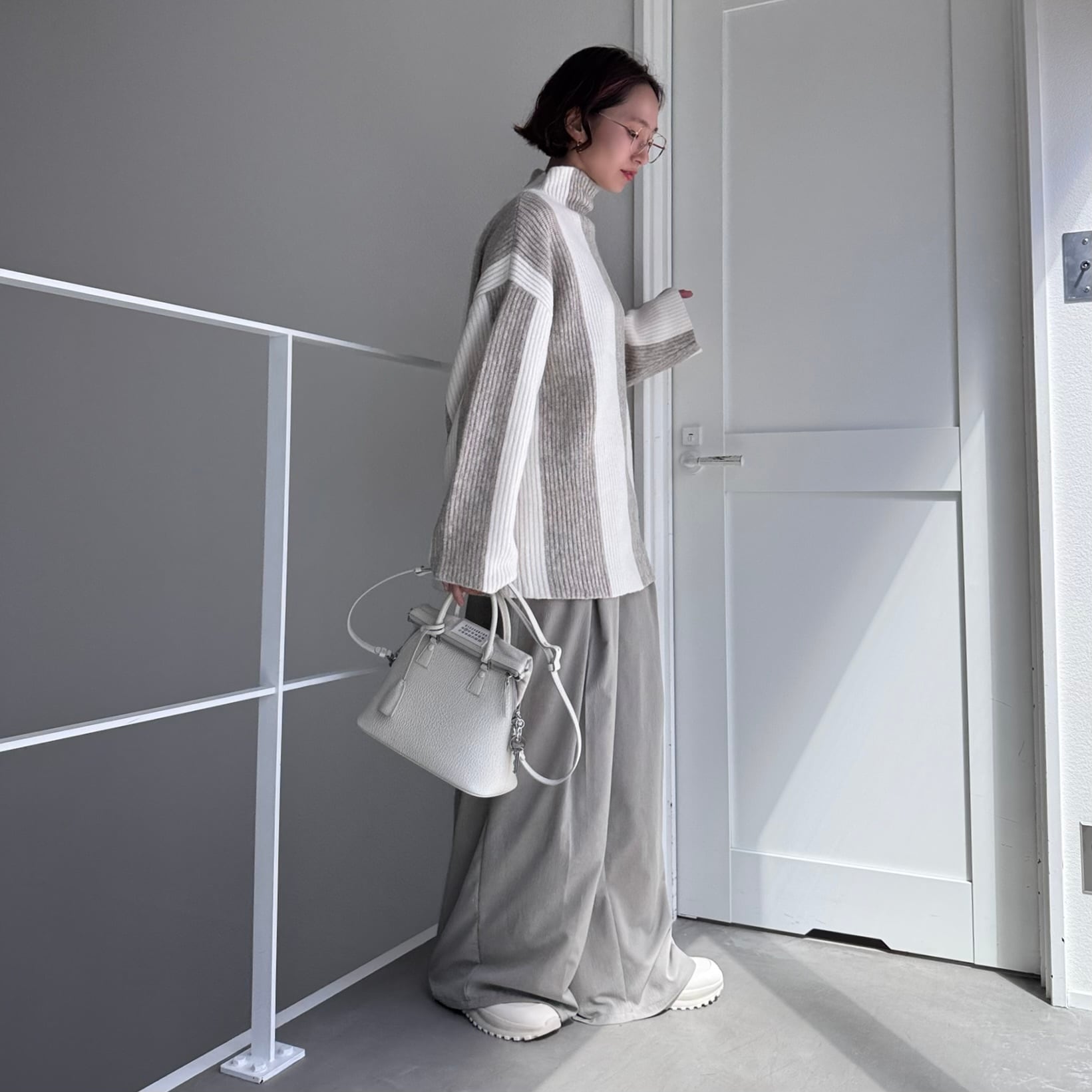 太めのストライプ柄が目を惹くボトルネックプルオーバー。スッキリとしたボトルネックは小顔効果もありつつ防寒にもピッタリです。袖丈も長めにデザインされており、ゆとりのあるシルエットなので体型カバーにも。ストライプ柄ニットを主役にしたスタイリングがおすすめです。