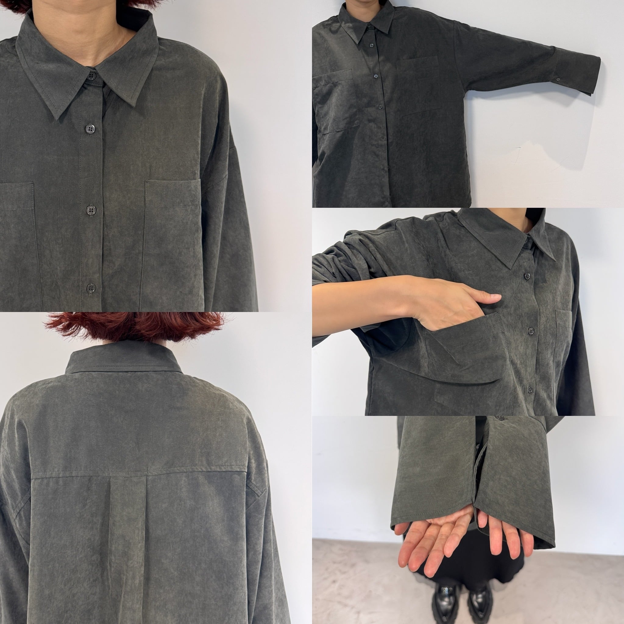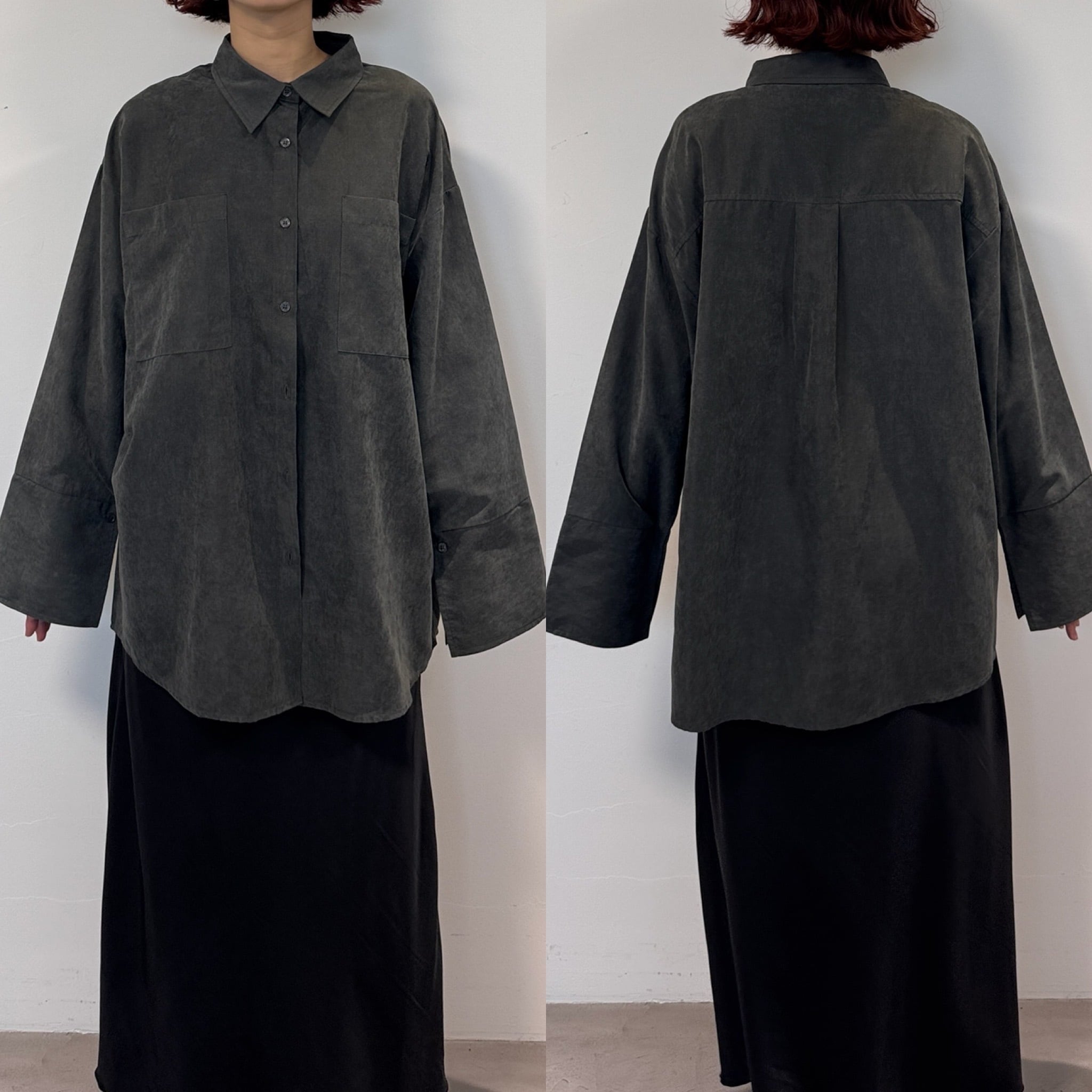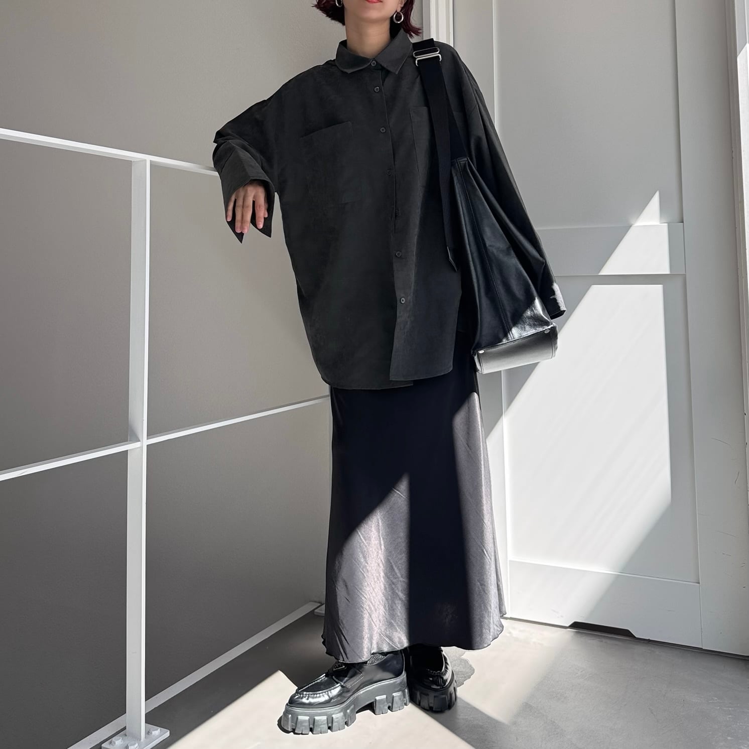 滑らかなスウェード素材のオーバーシャツ。ポケットとカフスをあえて大きめデザインにすることでコーデのアクセントに。袖丈も長めなので萌袖になるところもポイントです。肌寒くなるとインナーにタイトなニットも着用できるので長い期間コーデを楽しめます。
