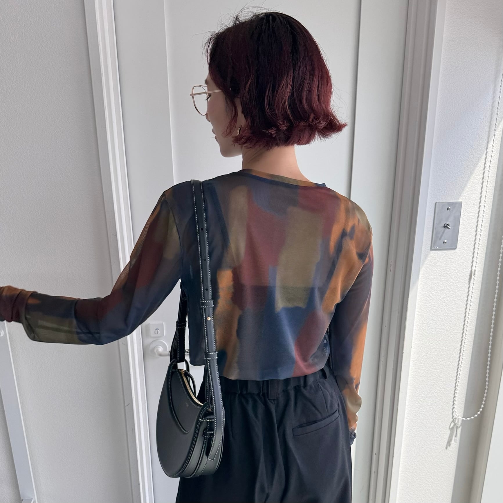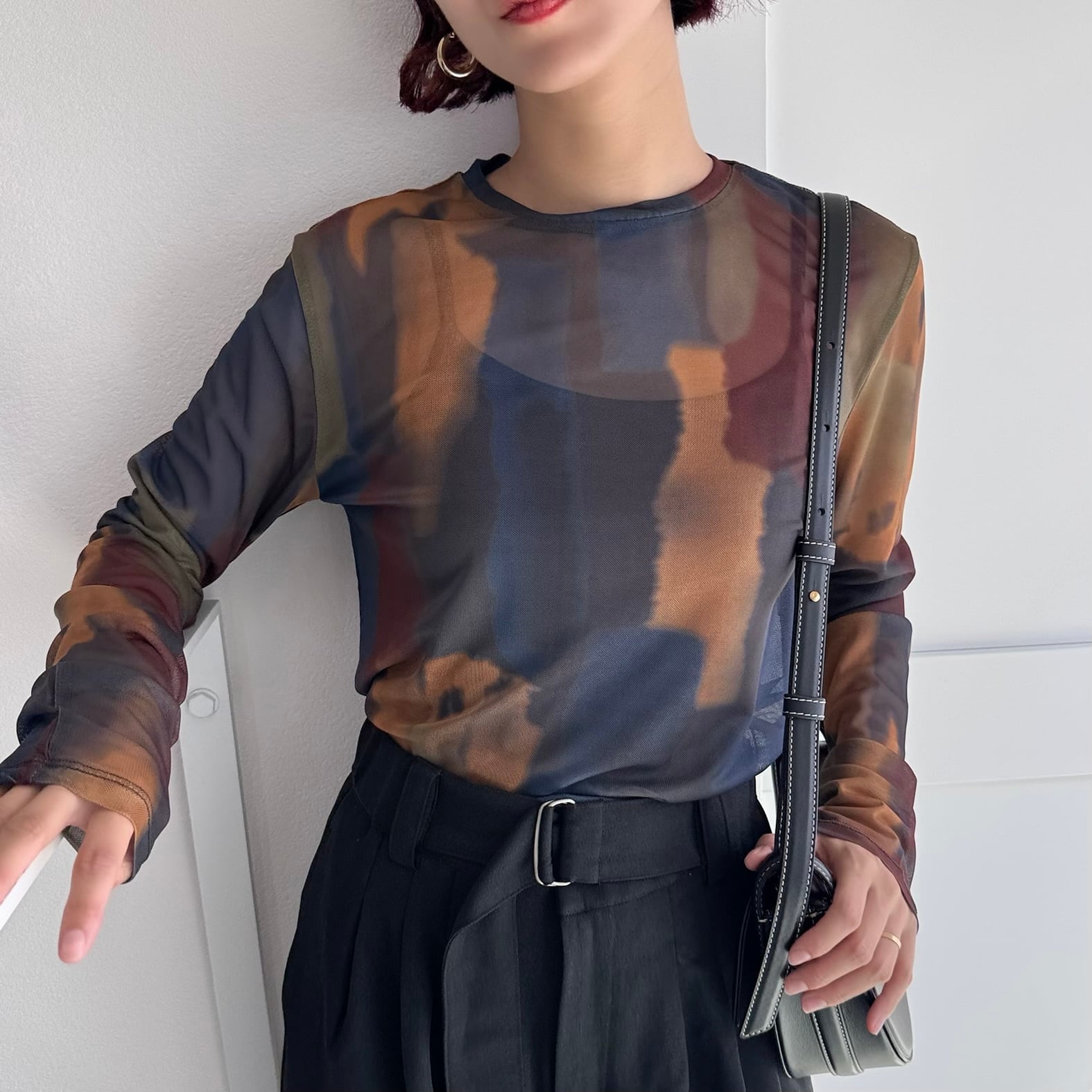水彩柄のニュアンスデザインが目をひくシアートップス。柔らかいチュール生地を使用している為ストレスフリーに着用できるのも魅力です。袖丈はあえて長めのデザインなので手元でクシュっとなり可愛さもプラス。一枚はもちろんレイヤードアイテムとしても重宝します。