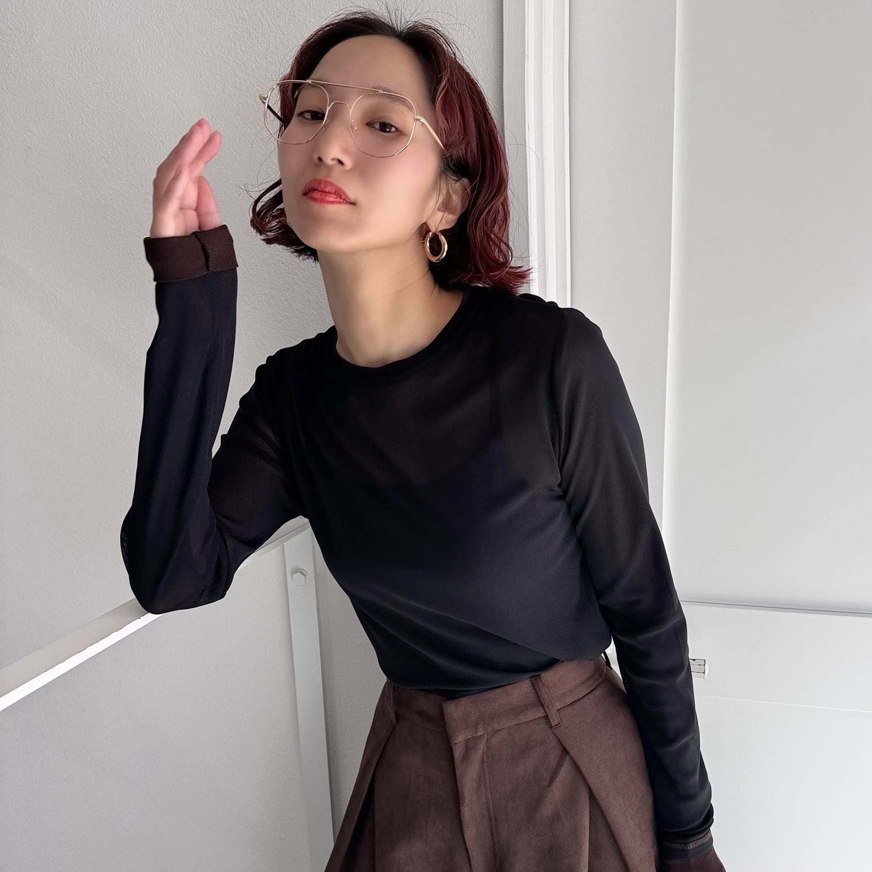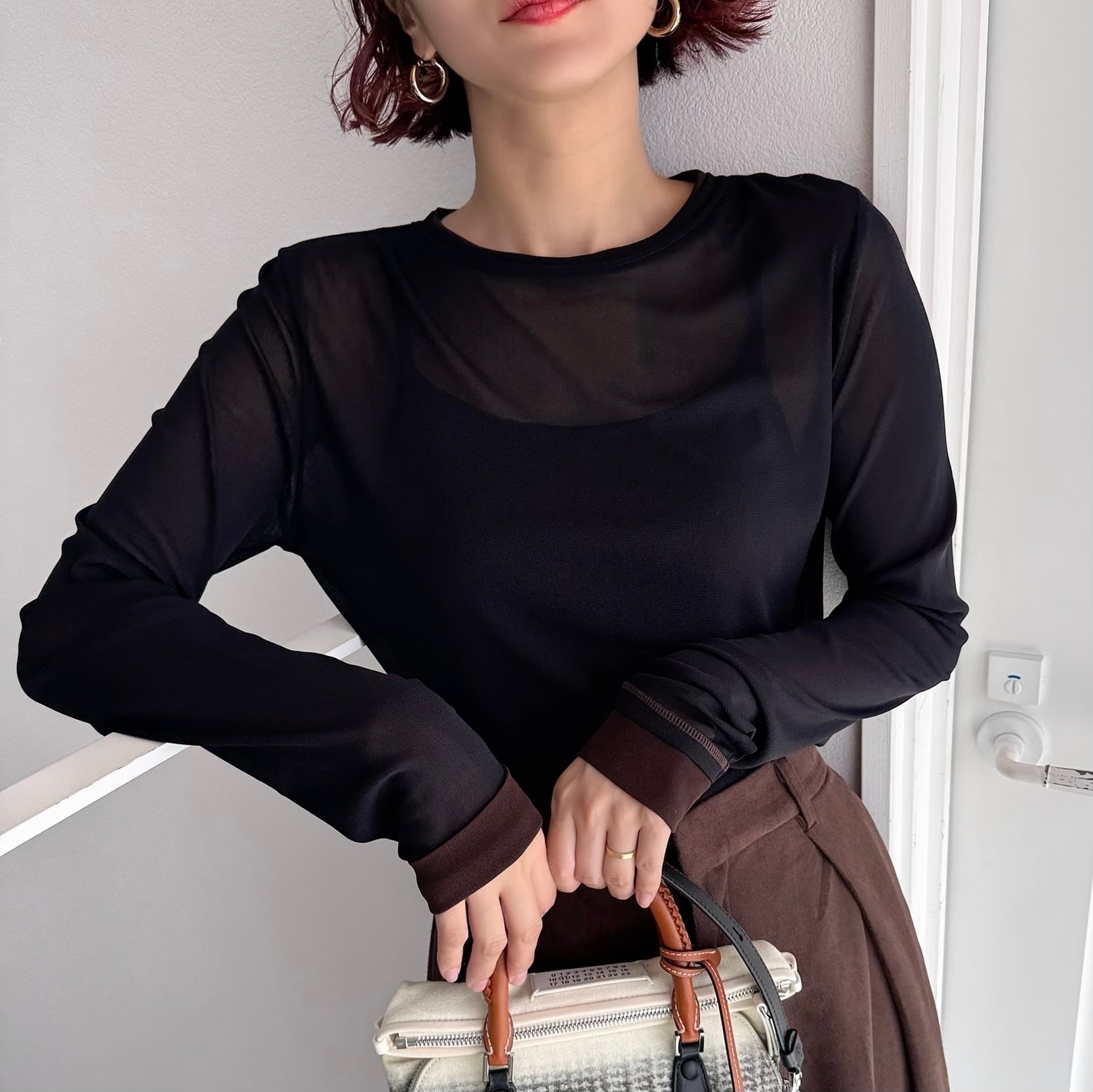 袖口とネックをバイカラーで重ね、1枚でも2枚レイヤードデザインのメッシュシアートップス。ほんのり透け感のあるシアーに。バイカラーの生地色とあわせています。パワーネット素材で伸縮性もあり、コンパクトながらピタッとしすぎない絶妙なサイジング。やわらかく、肌ざわりのよい素材感です。1枚ではもちろん、サロペットのインや、ビスチェ、ベストとの相性も◎