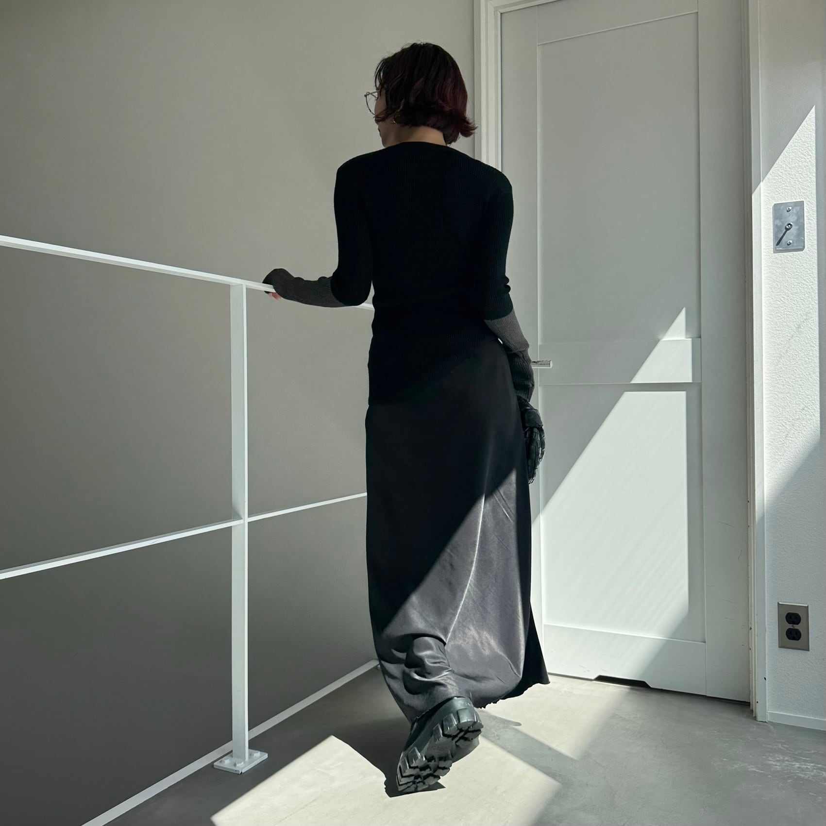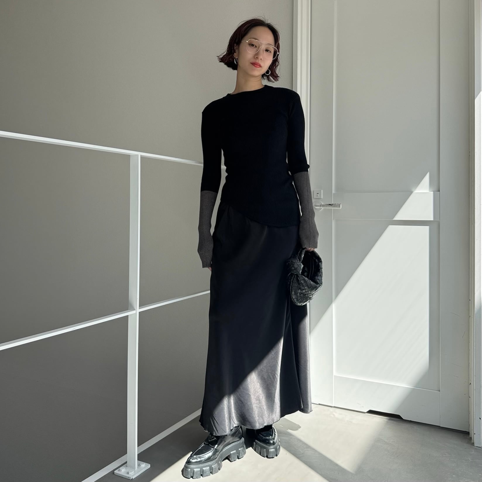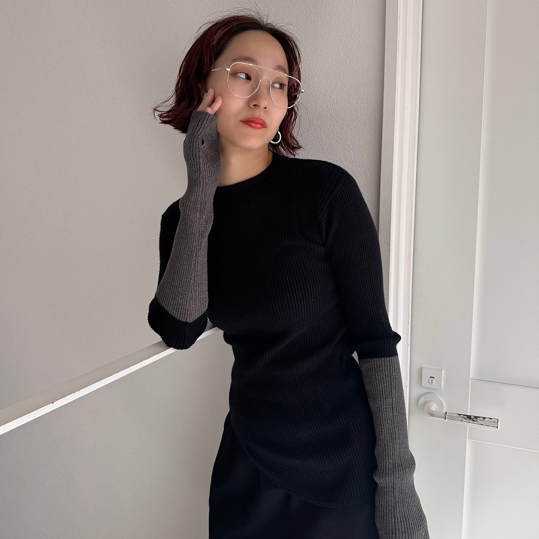 袖口のバイカラーデザインでアクセントを効かせたリブニット。裾はアシメデザインとなっていてデザイン性の高いアイテムです。幅広く着まわせるコンパクトなサイズ感なので、1枚着でもインナー使いでも活躍してくれます。