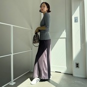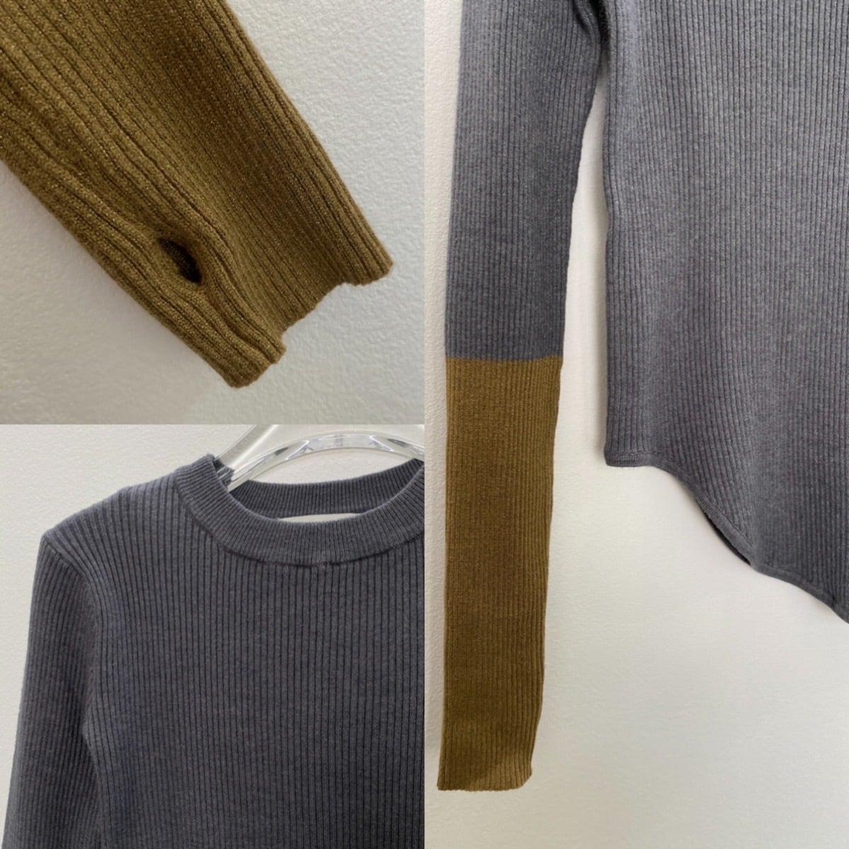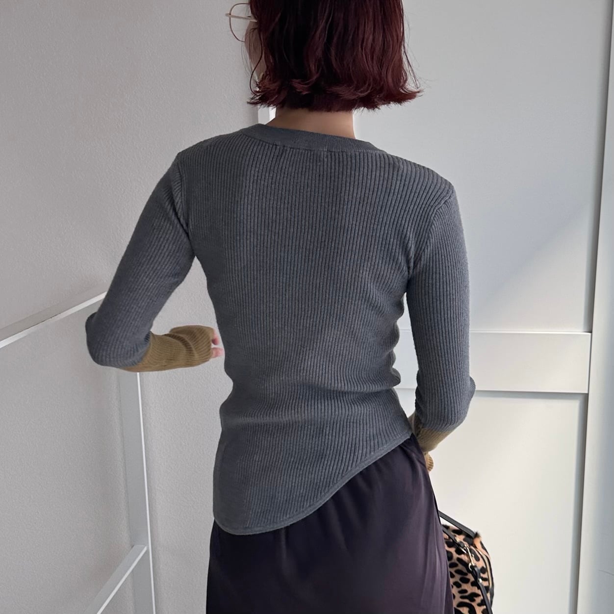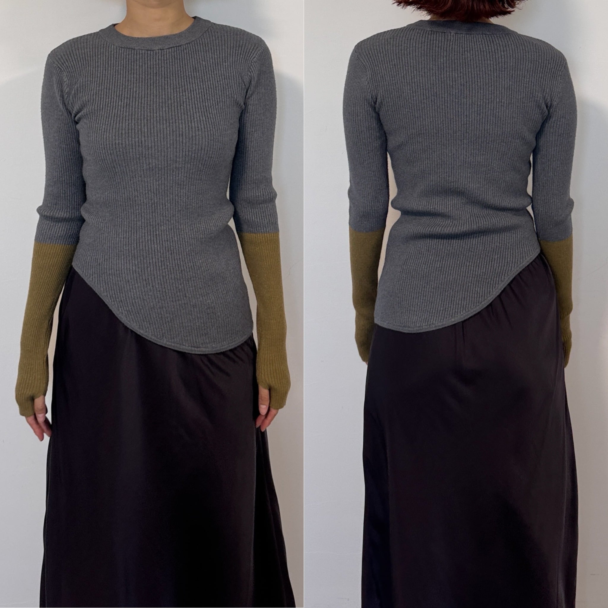 袖口のバイカラーデザインでアクセントを効かせたリブニット。裾はアシメデザインとなっていてデザイン性の高いアイテムです。幅広く着まわせるコンパクトなサイズ感なので、1枚着でもインナー使いでも活躍してくれます。