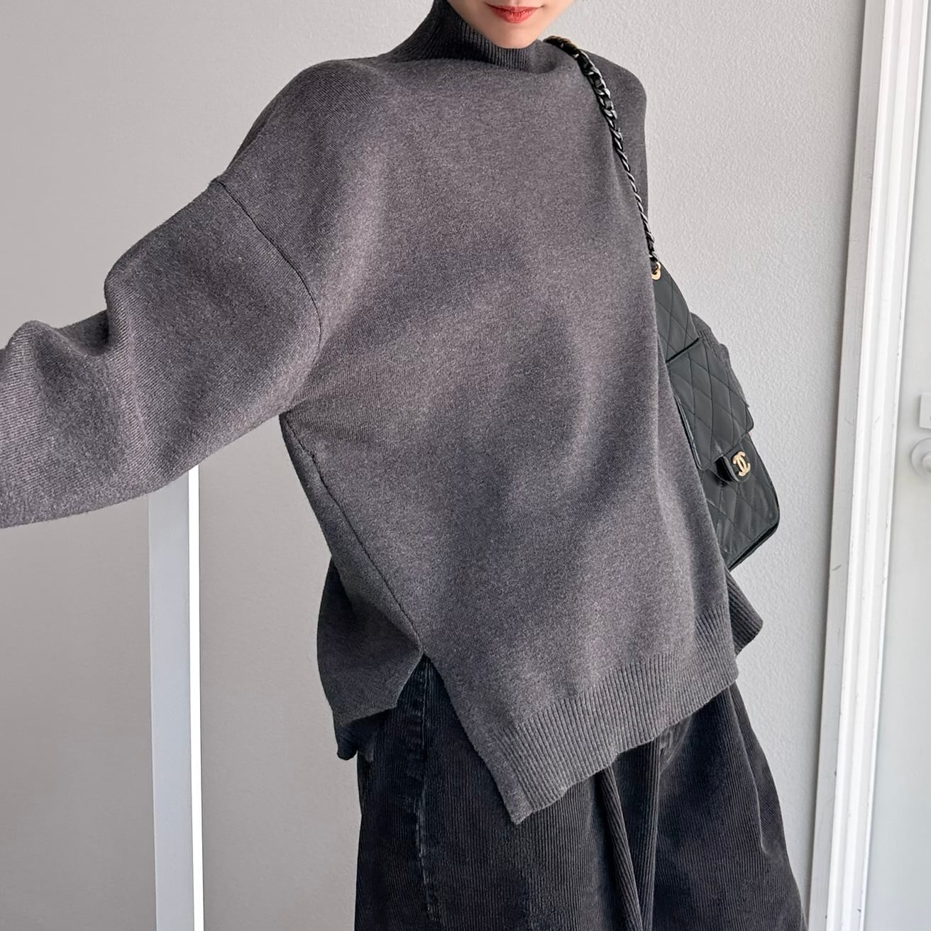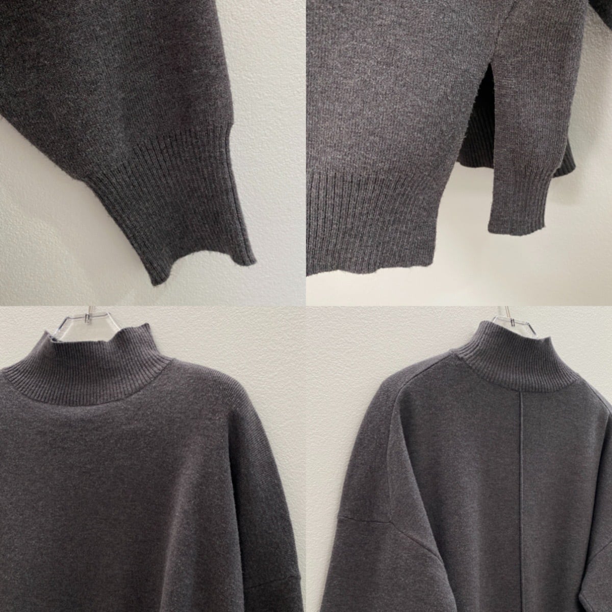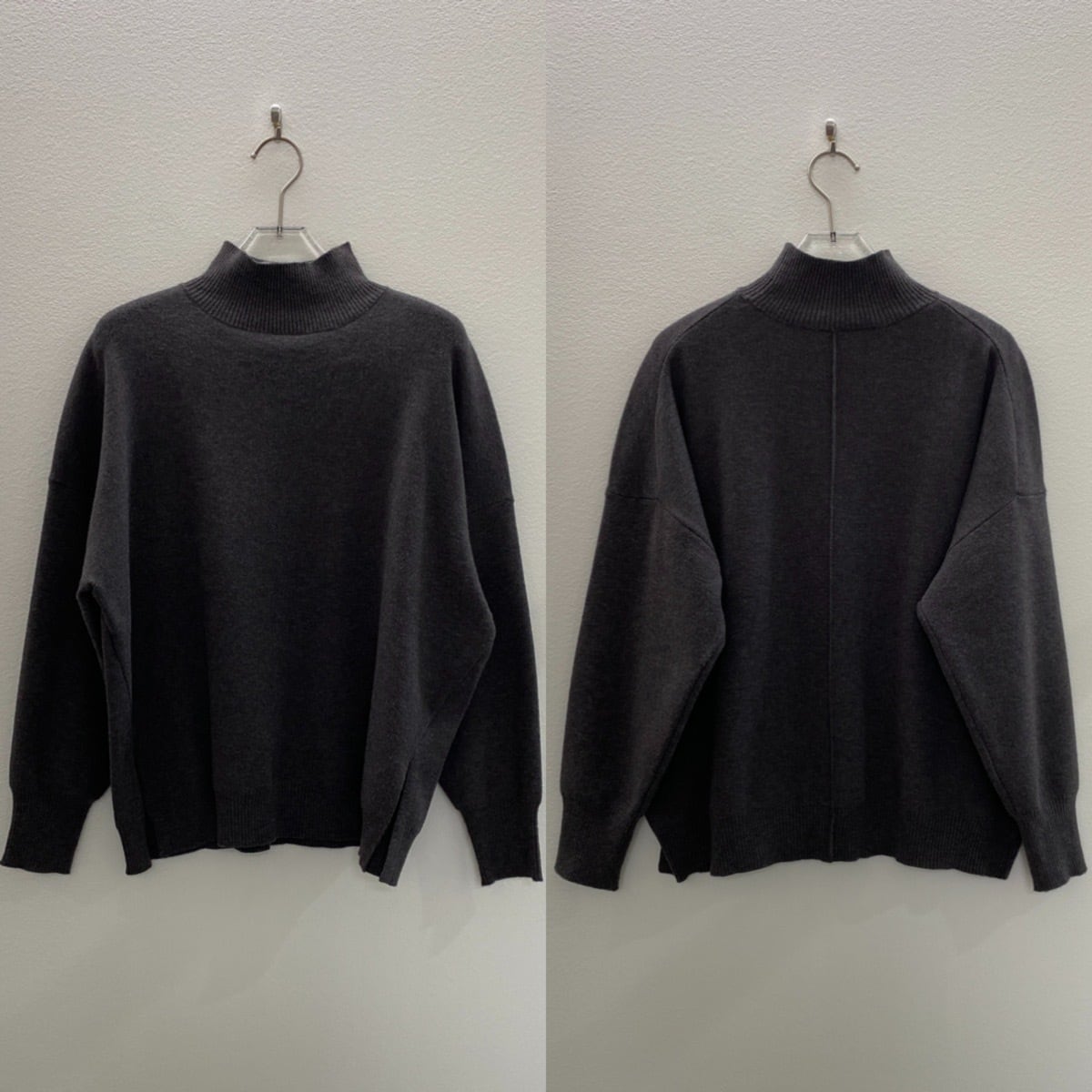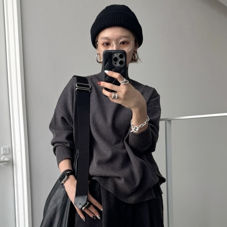 着心地良いタッチのハイゲージニット。サイズ感は程よくゆとりがあり、肌に馴染みやすく、すとんと落ちる縦長シルエット。”ちょうどいい”ハイネック丈感は、程よく首元に沿ってくれて締め付け感はなくストレスフリー。サイドスリットデザインや、バックにラインディテールを施したデザインが、より一層引き立てています。一枚着としてもサマになり、様々なアウターのインナーとしても活躍するアイテムです。