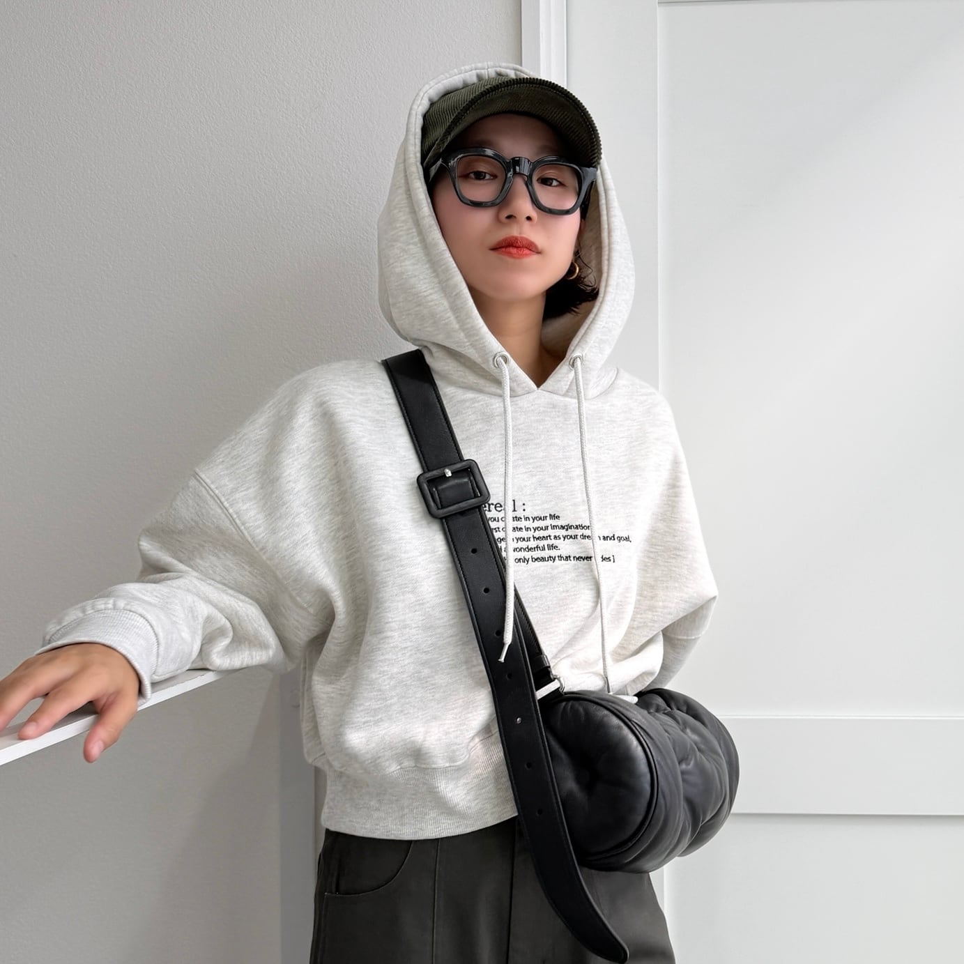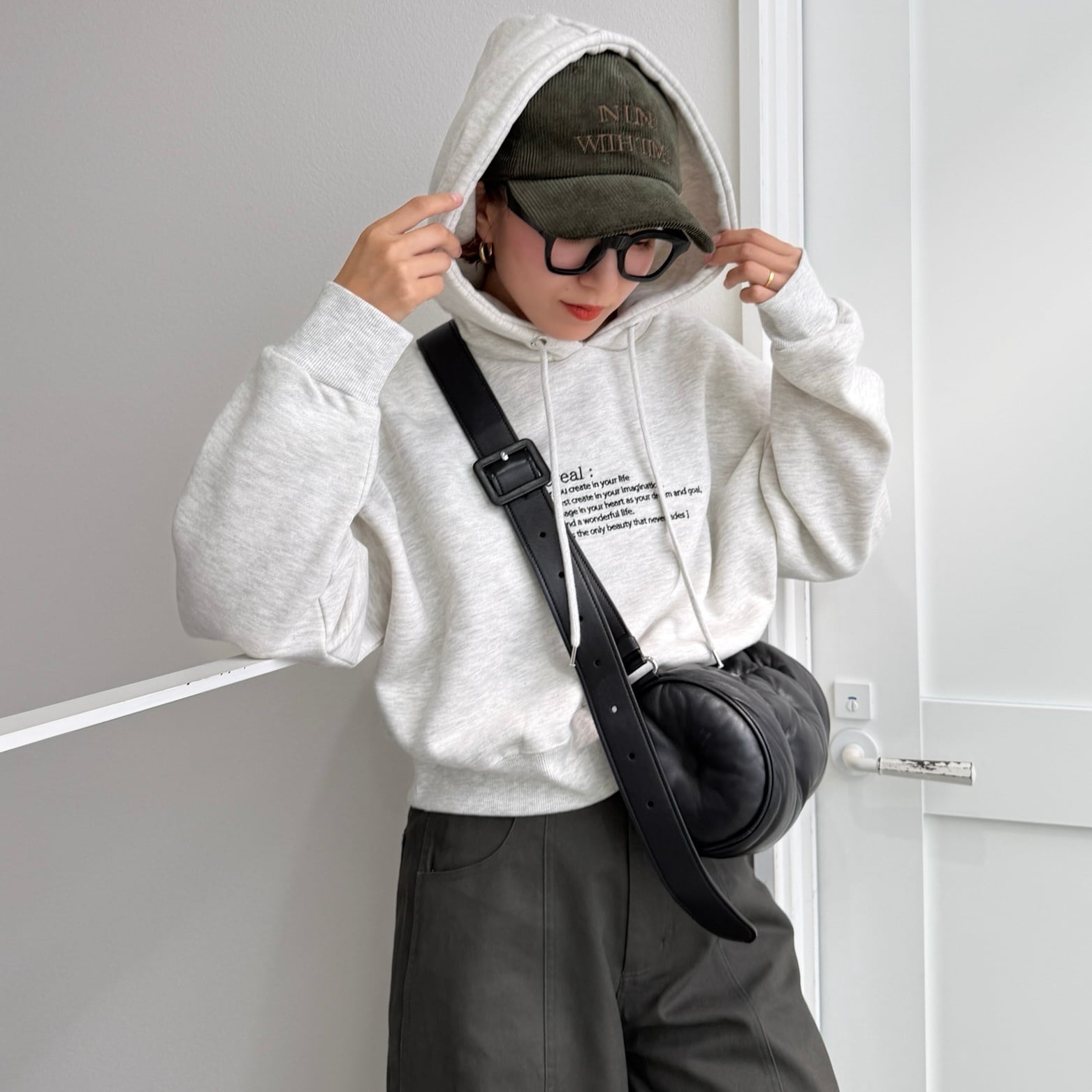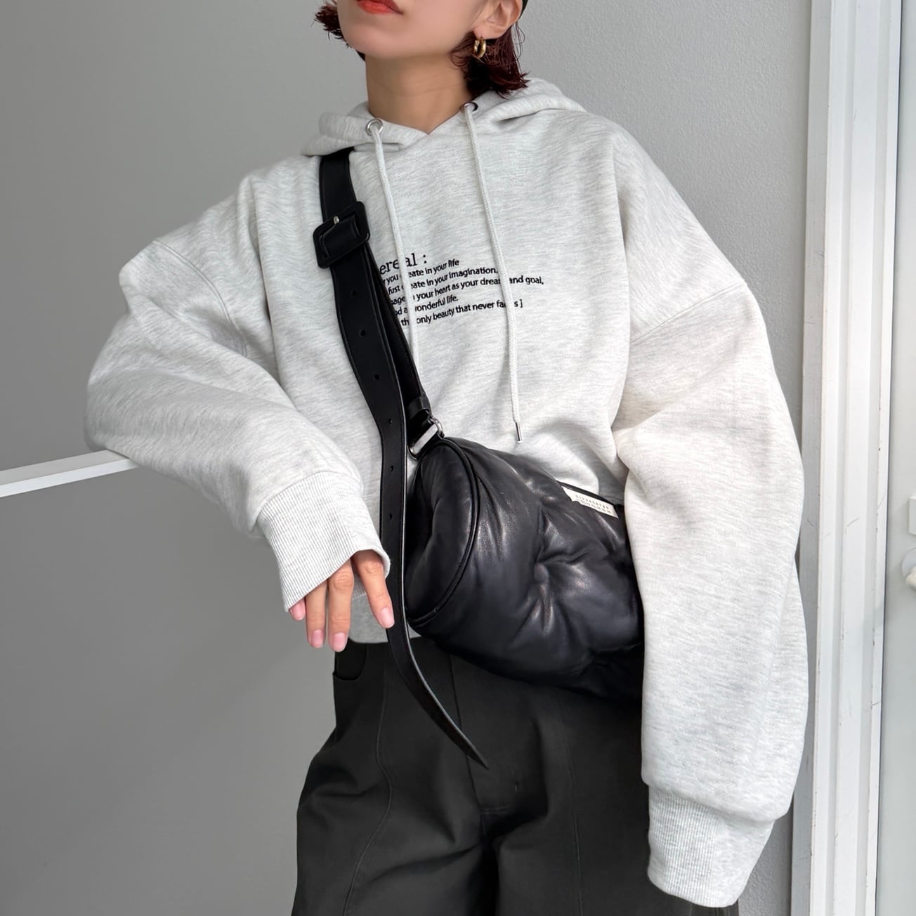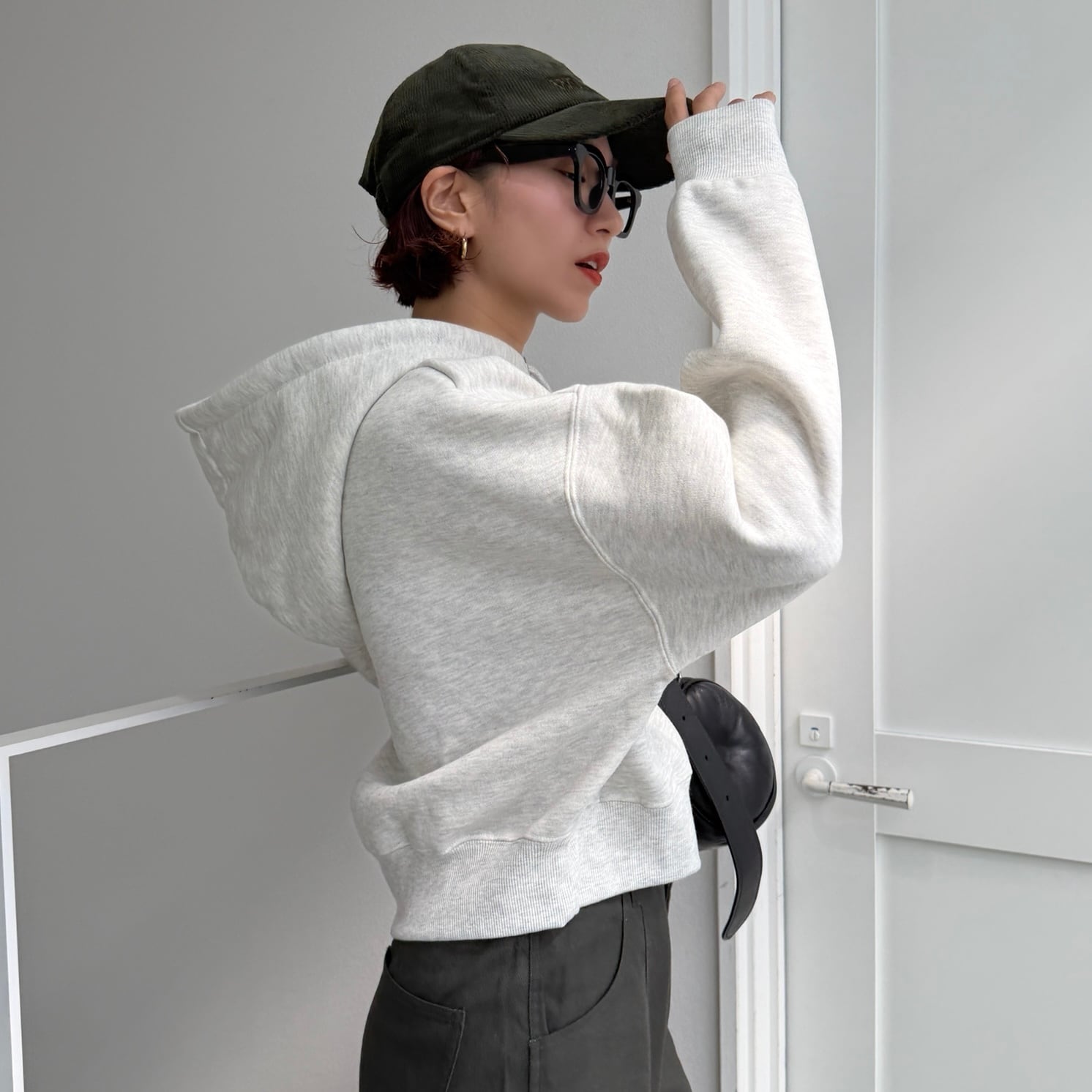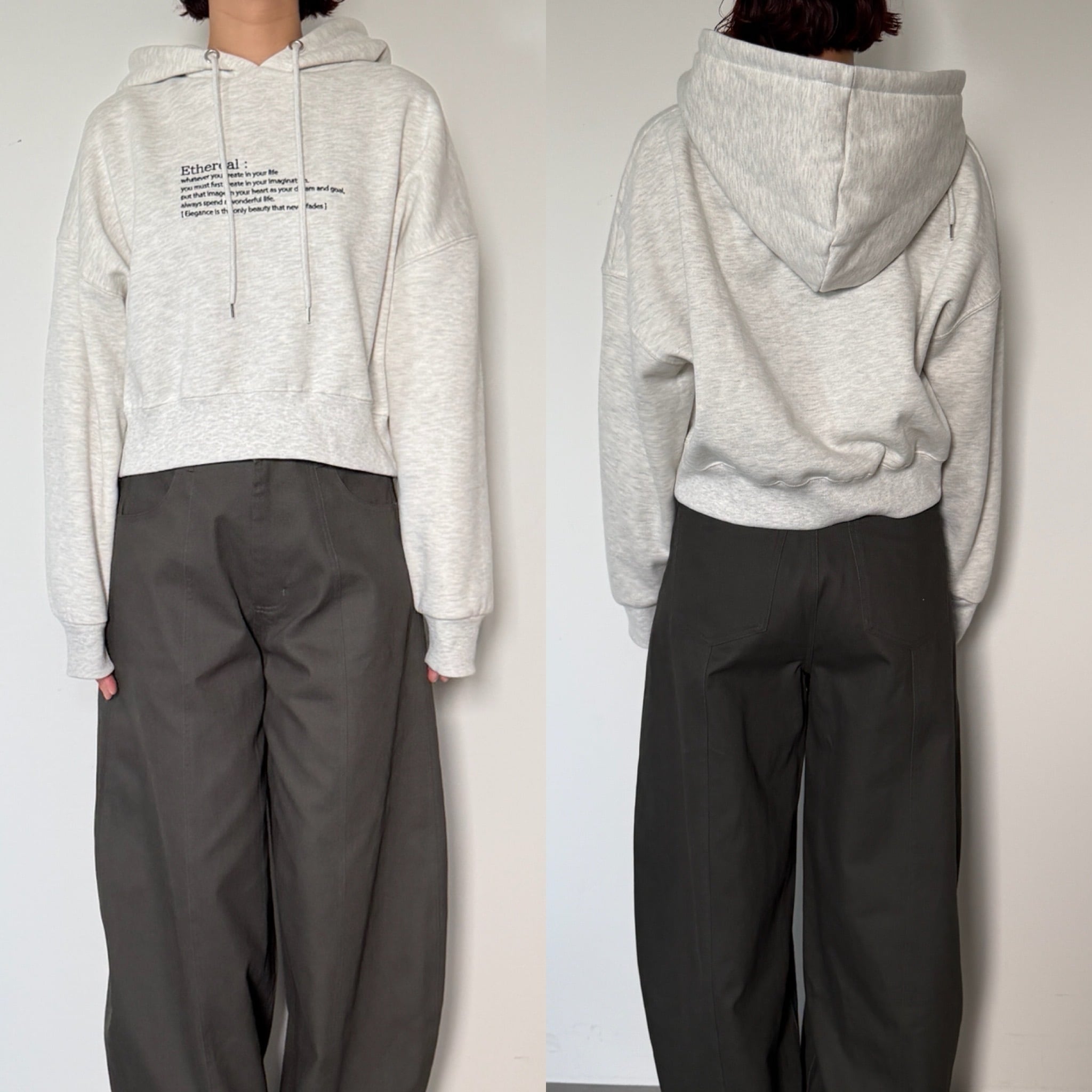 フードをかぶっても、さっと着るだけでも様になるショート丈スウェットフーディー。フロントに施した刺繍レタリングロゴがアクセントに。裏起毛でフワフワと暖かく、ゆったりとした身幅に短めの丈感がこなれた雰囲気を演出し、ショートトップスとしてトレンドライクに活躍すること間違いなしのアイテムです。