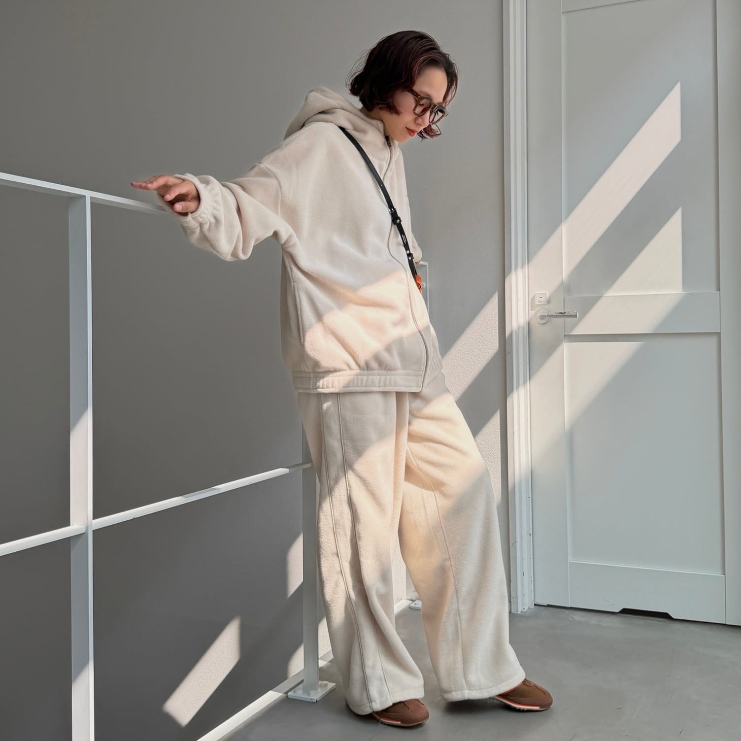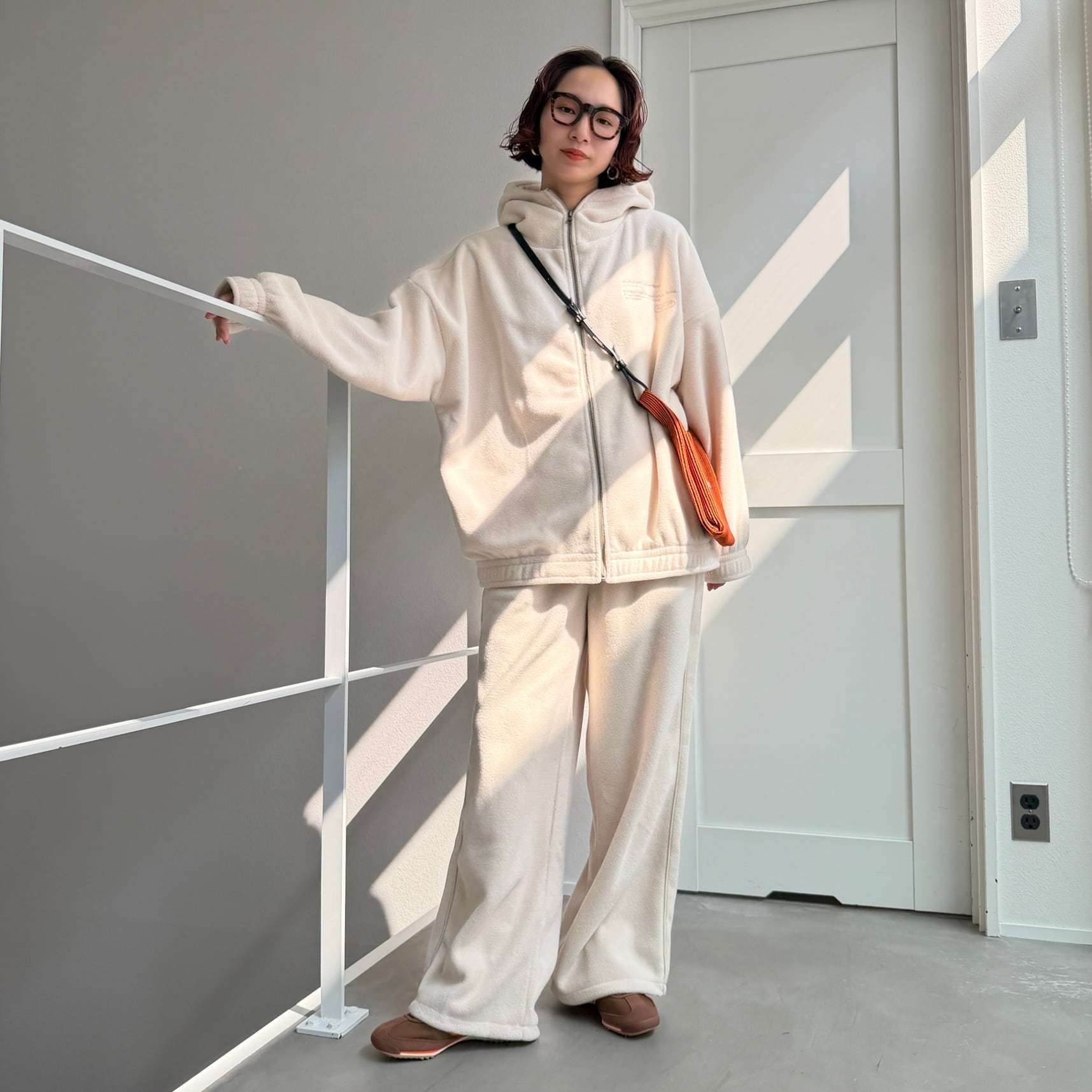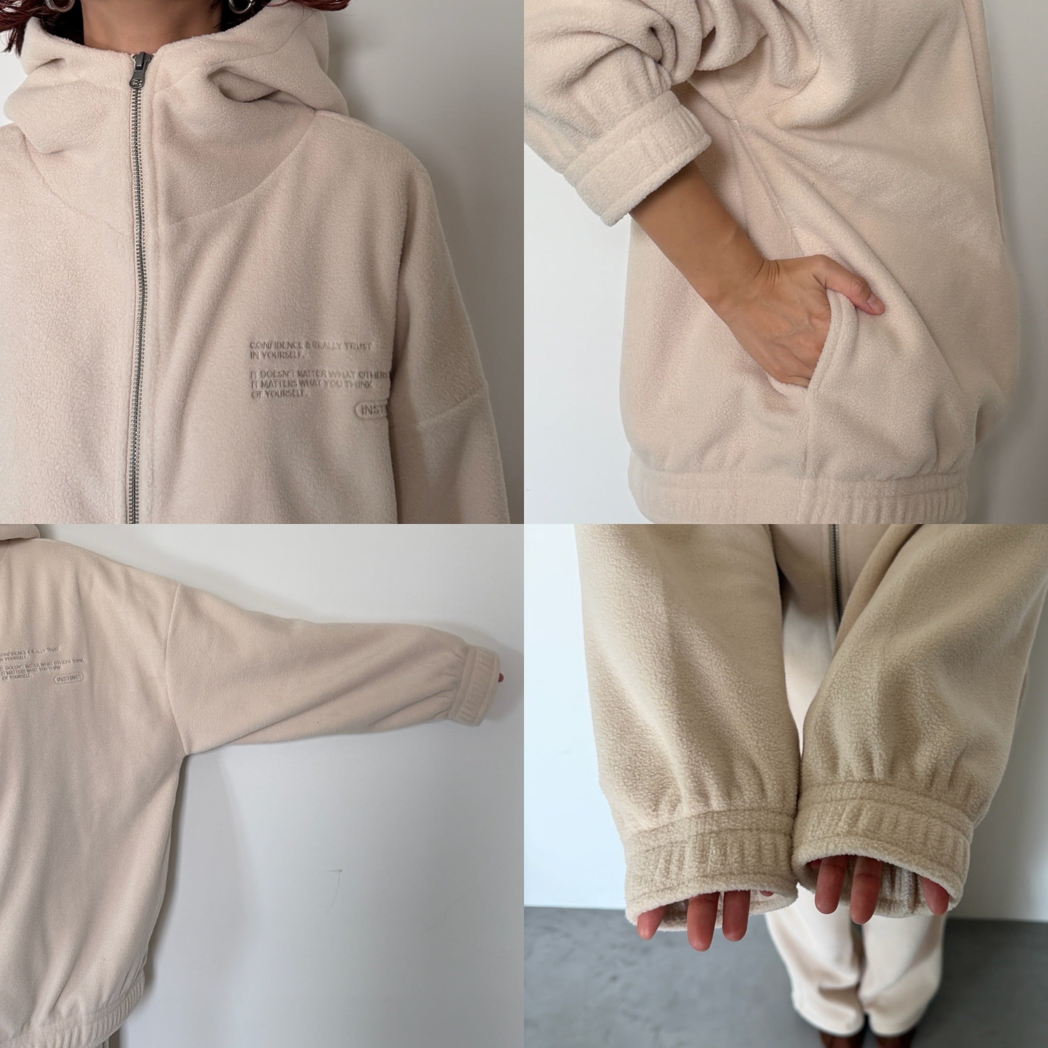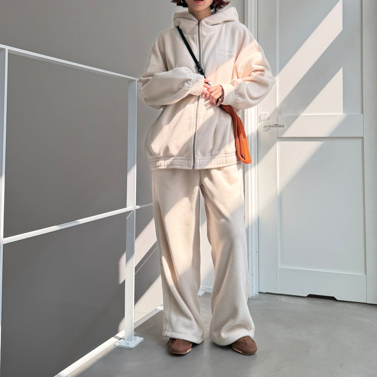 同生地の[サイドライン裾ドロストフリースPT]とのSET UPコーデもおすすめ。