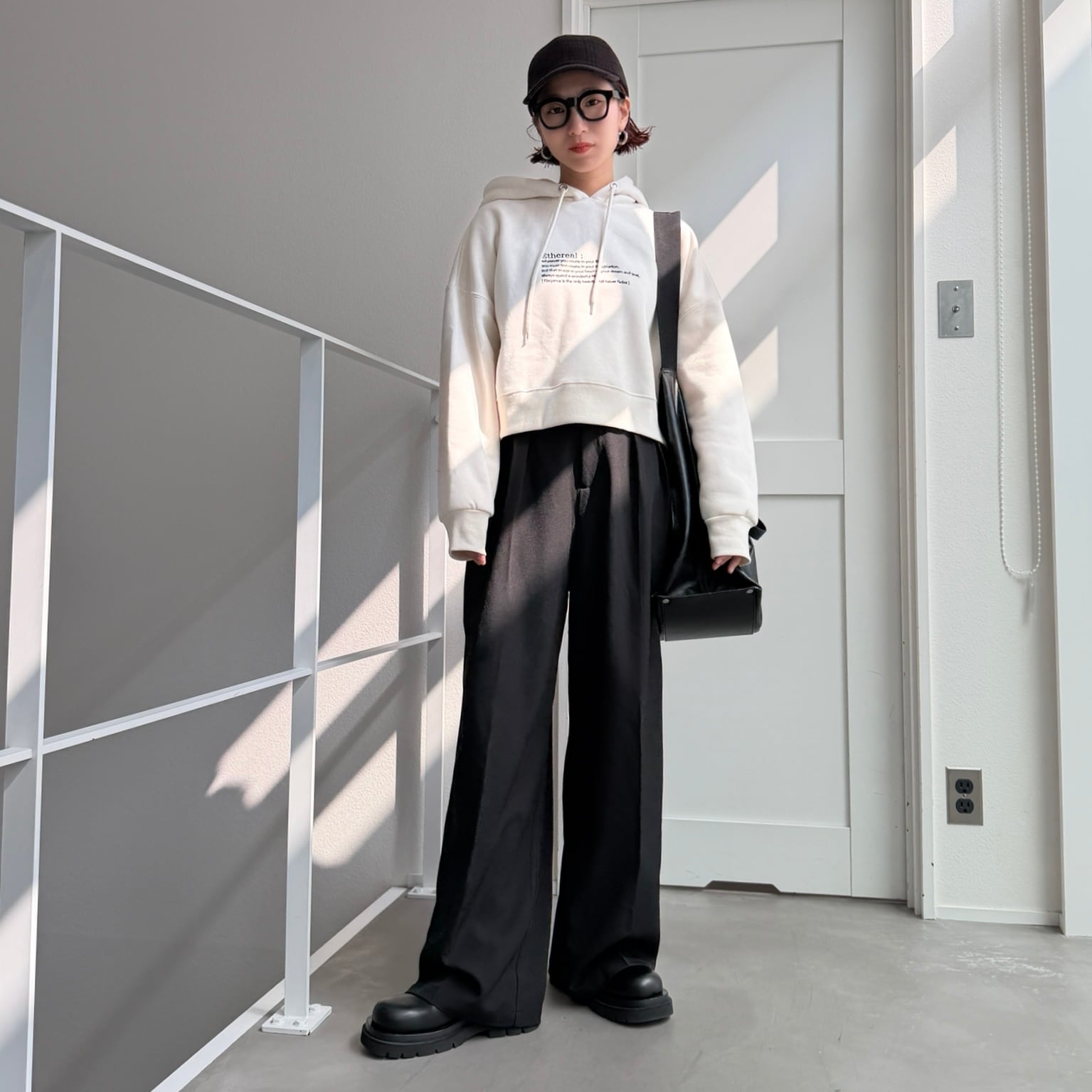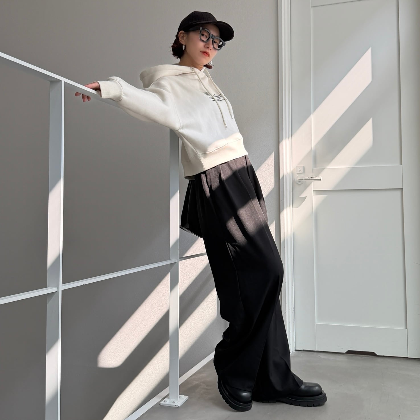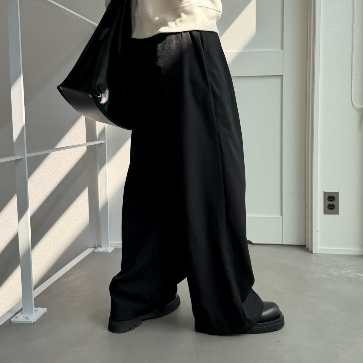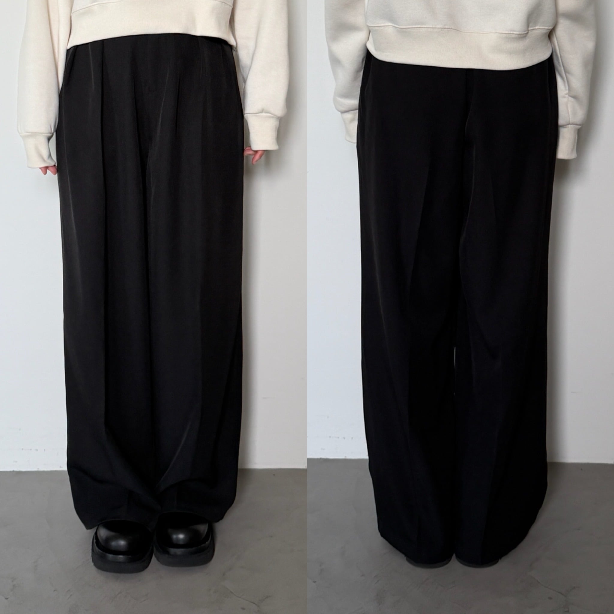 マニッシュに着こなせる大人のキレイめスラックスパンツ。ウエスト内側に別布ヘリンボーンを使い、パイピング始末でさらに高見え。ウエストは、バックゴム仕様なのでストレスフリー。2本タックで、すっきりとした着用感が魅力です。カチッとしすぎずカジュアルダウンが今っぽいアイテムです。