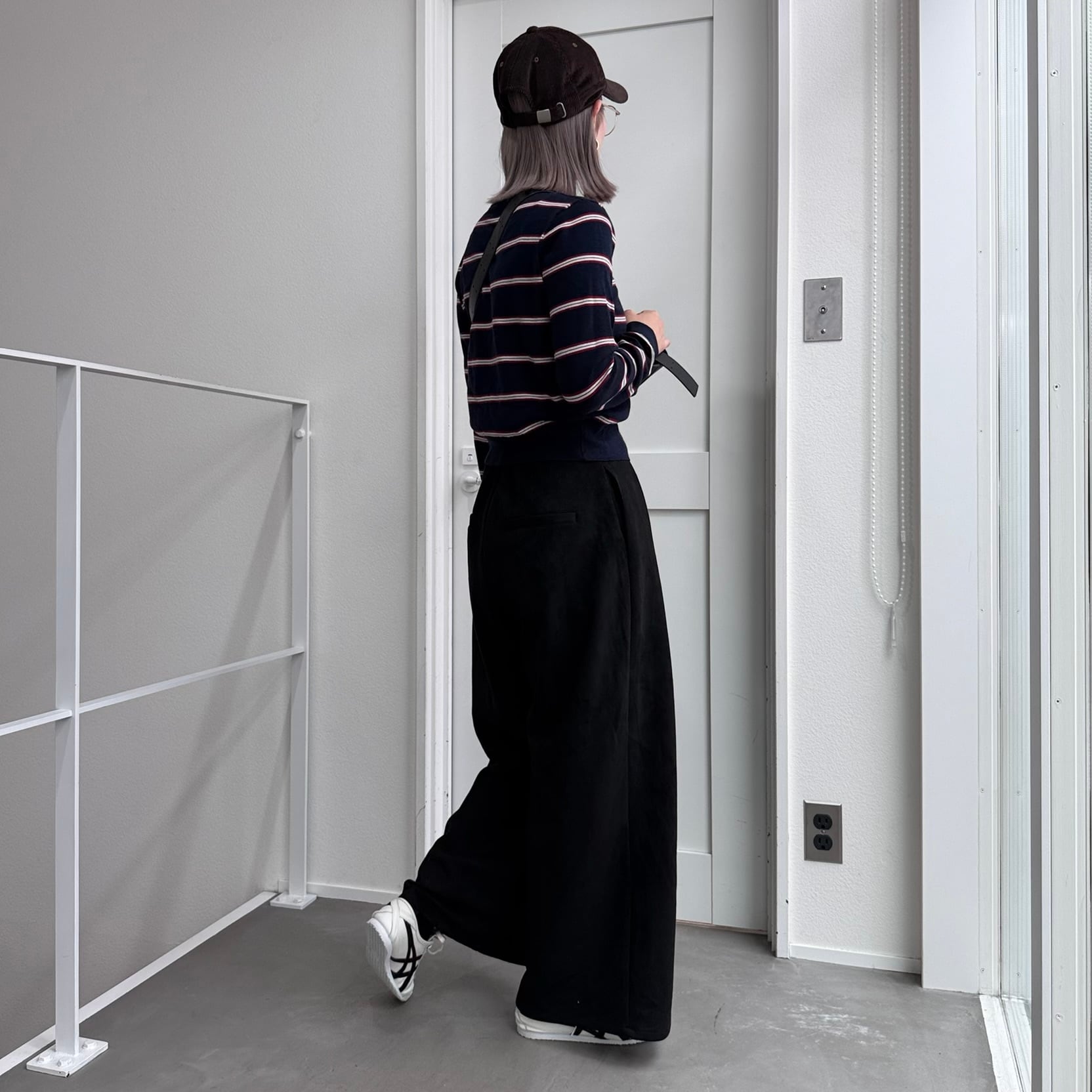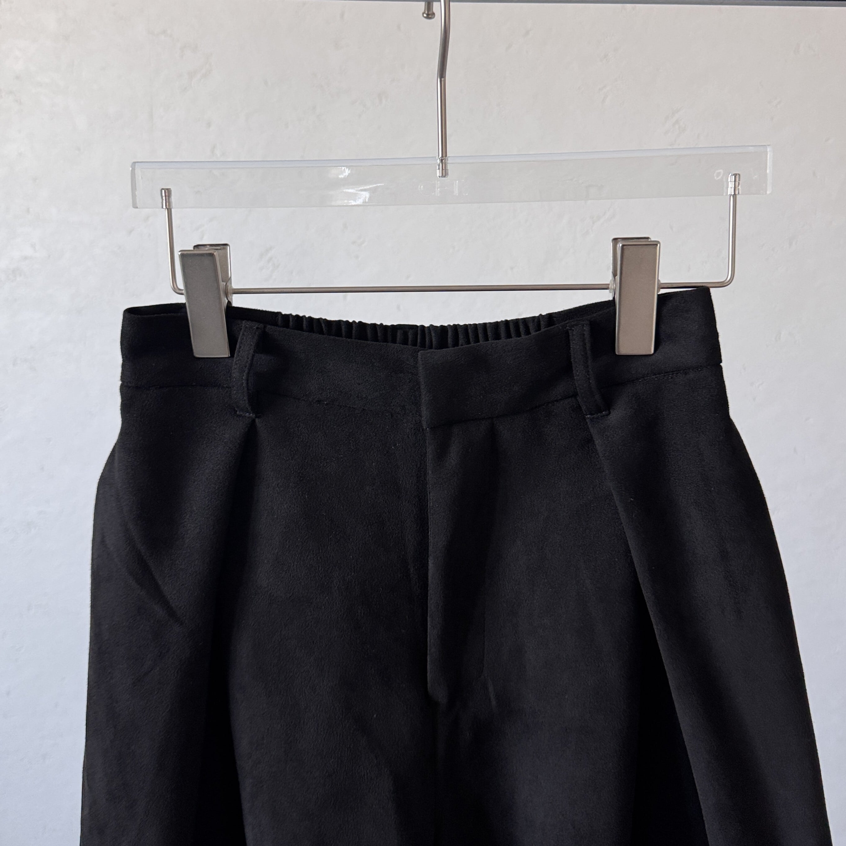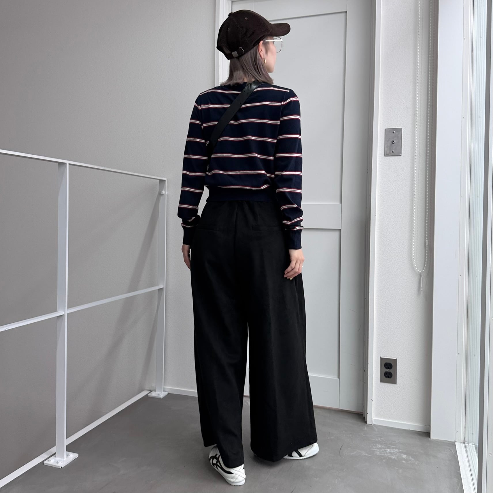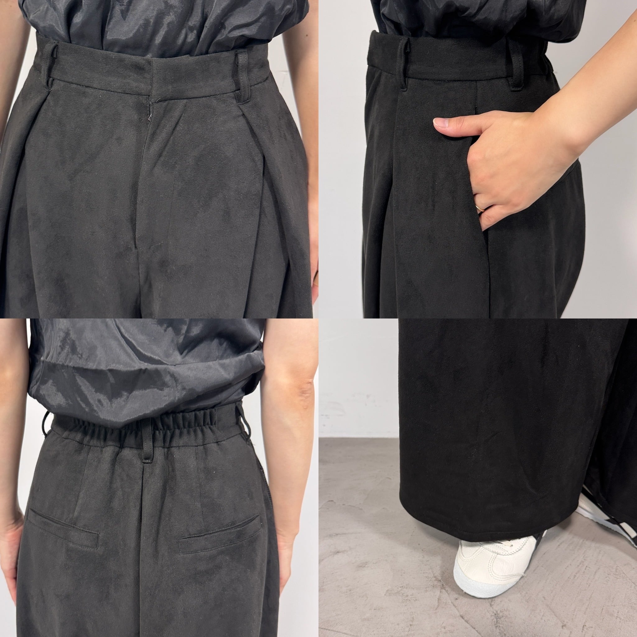 しっとり滑らかな肌触りのピーチスキン素材を使用したタックワイドパンツ。マットな風合いなので大人な上品さも兼ね備えています。フロントタック入りなので腰回りをカバーしつつワイドシルエットなので脚長効果も。後ウエストはゴム入りなのでサイズ調節も可能です。
