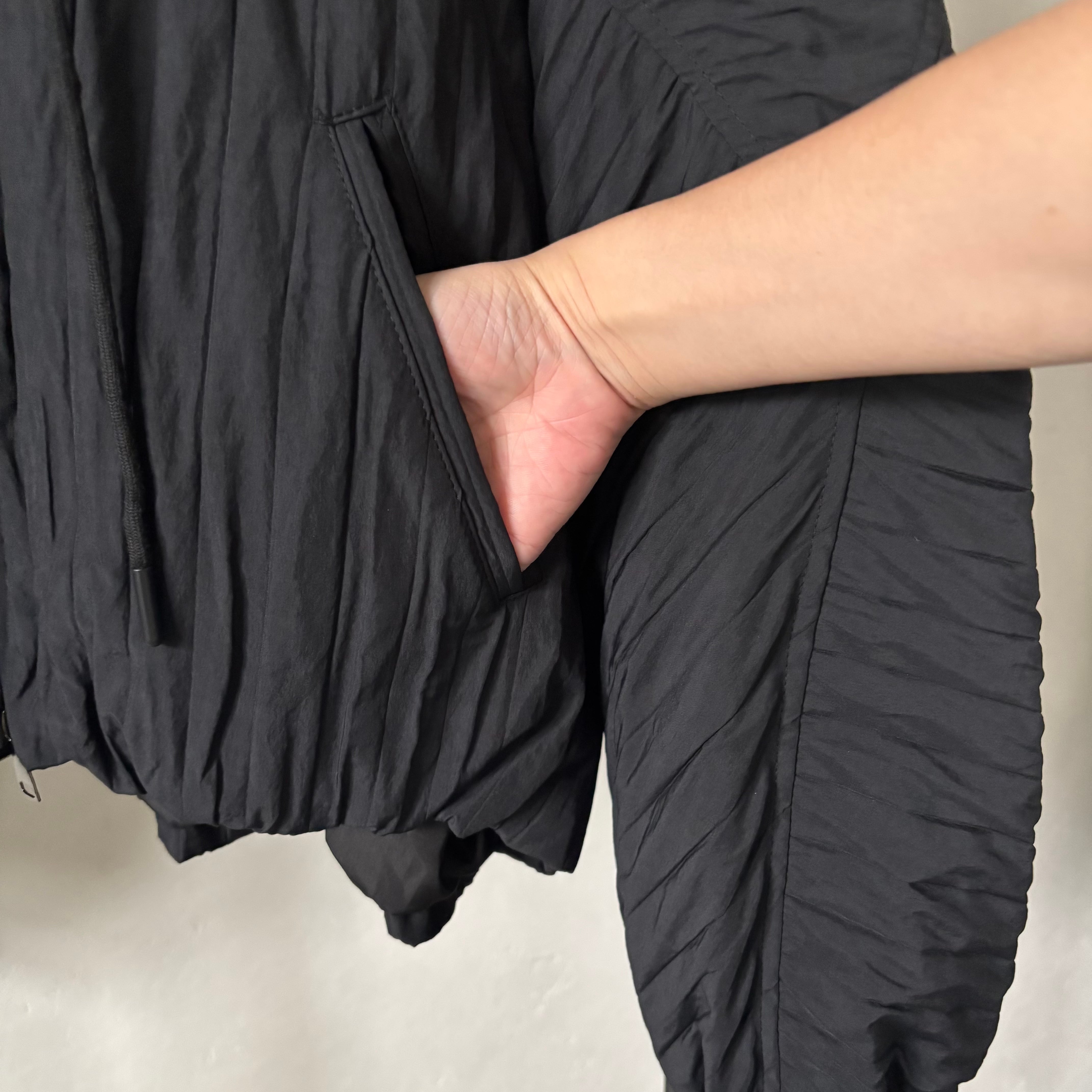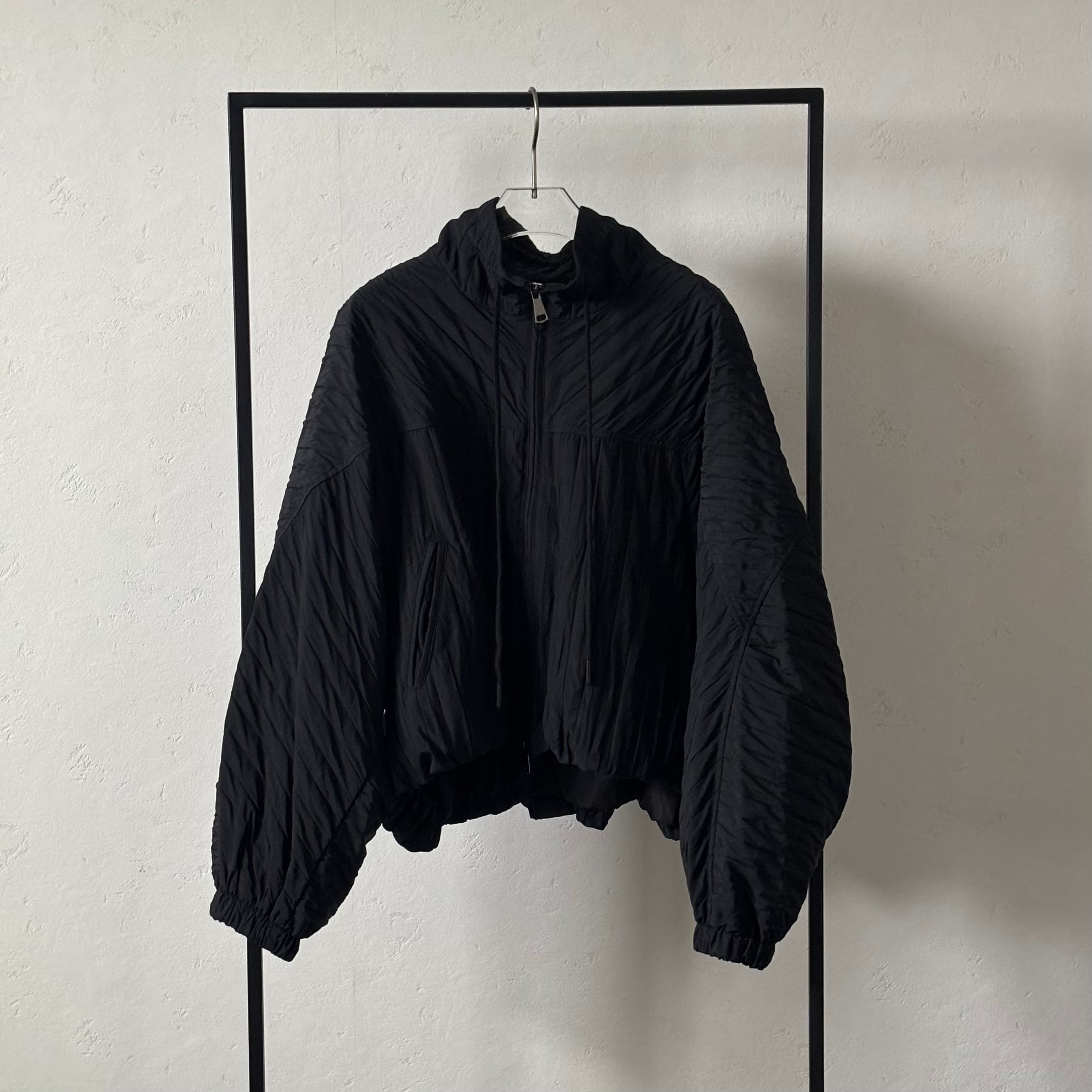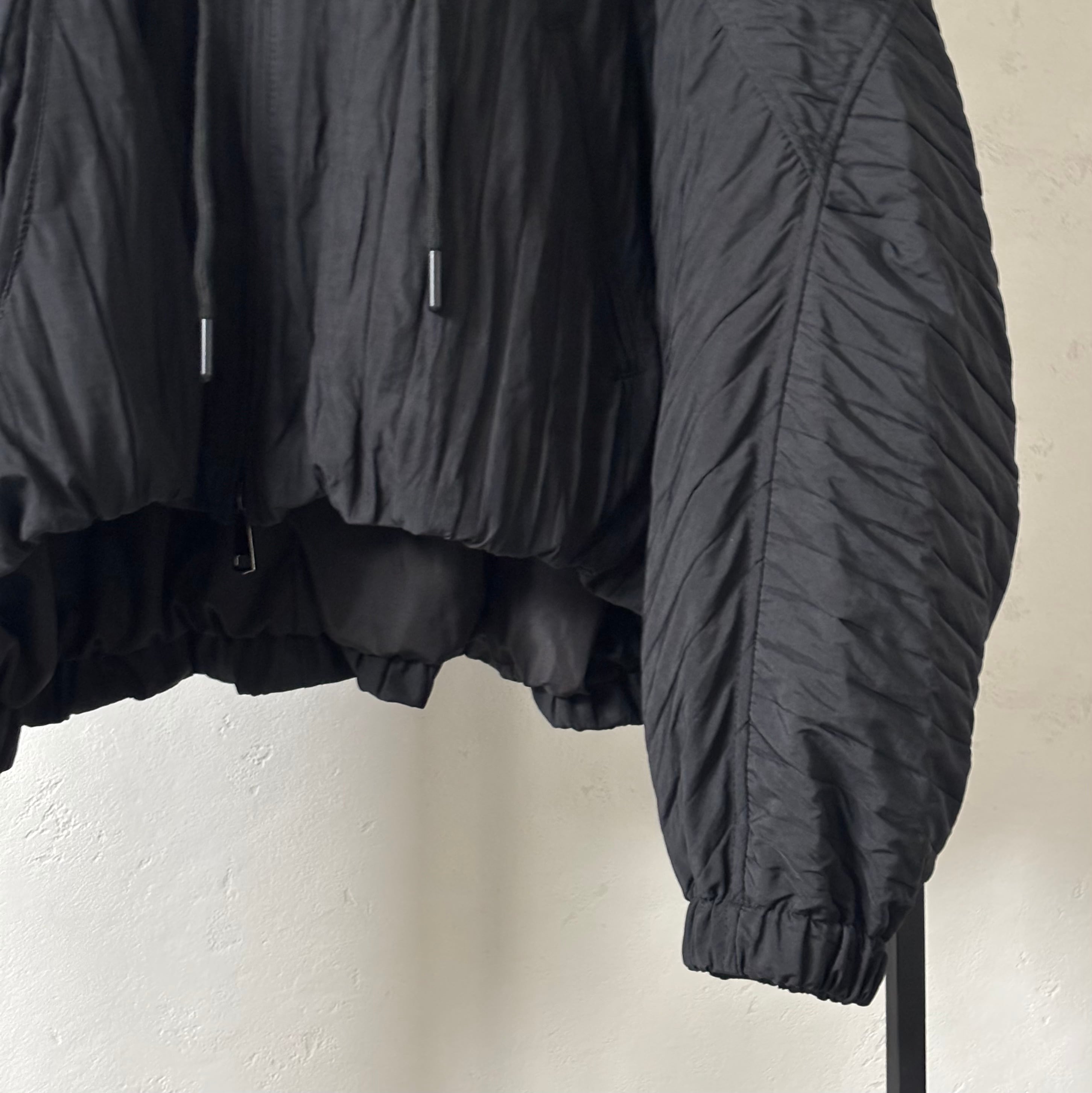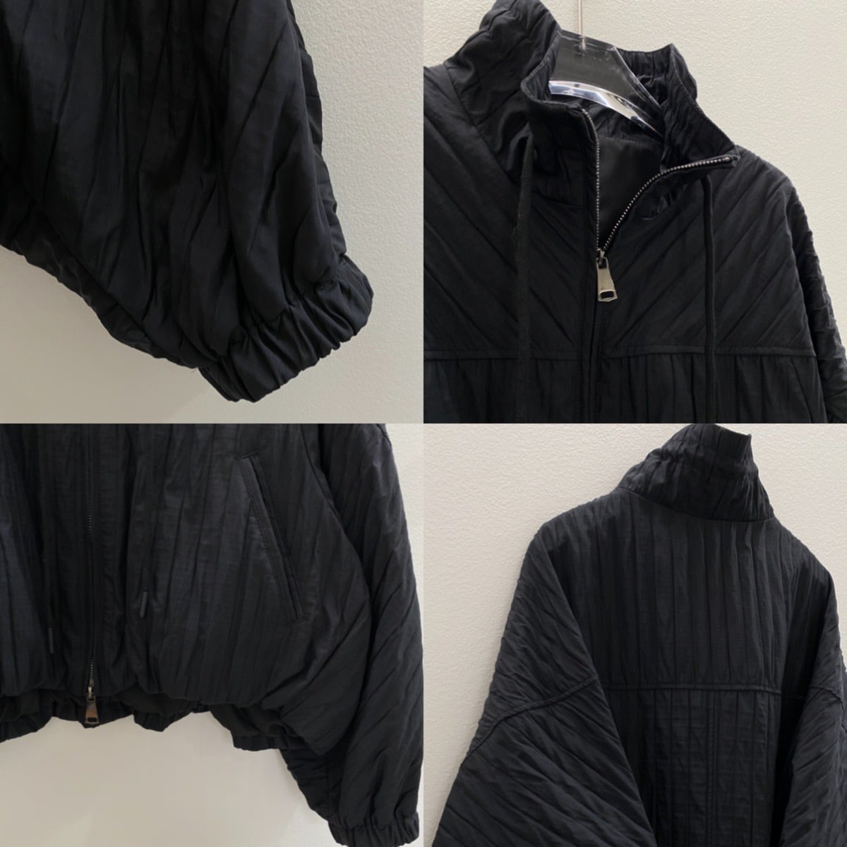 表面感のあるワッシャー加工を施し、シックな雰囲気に仕上げたブルゾン。フロントと袖に切り替えラインを施し、丸みのある構築的なコクーンシルエットを演出。袖口と裾はゴム仕様になっており、きゅっと捲ったり、こなれ感ある着こなしが叶います。ゆったりとしたオーバーなサイズ感なので、中にニットやスウェットを着込んでももたつかず着心地の良さも魅力です。