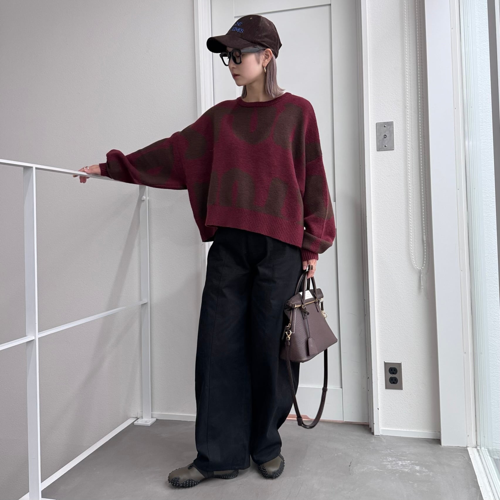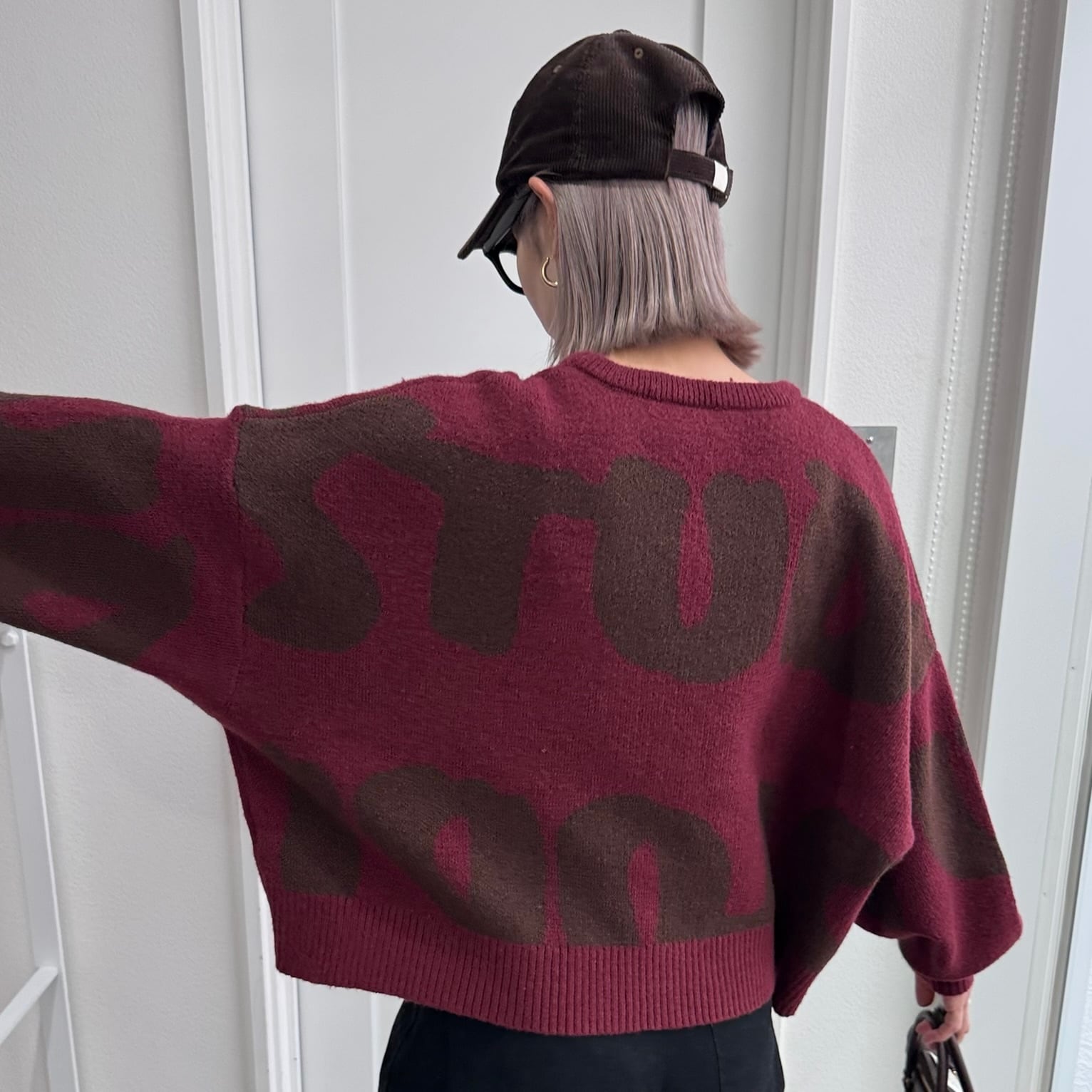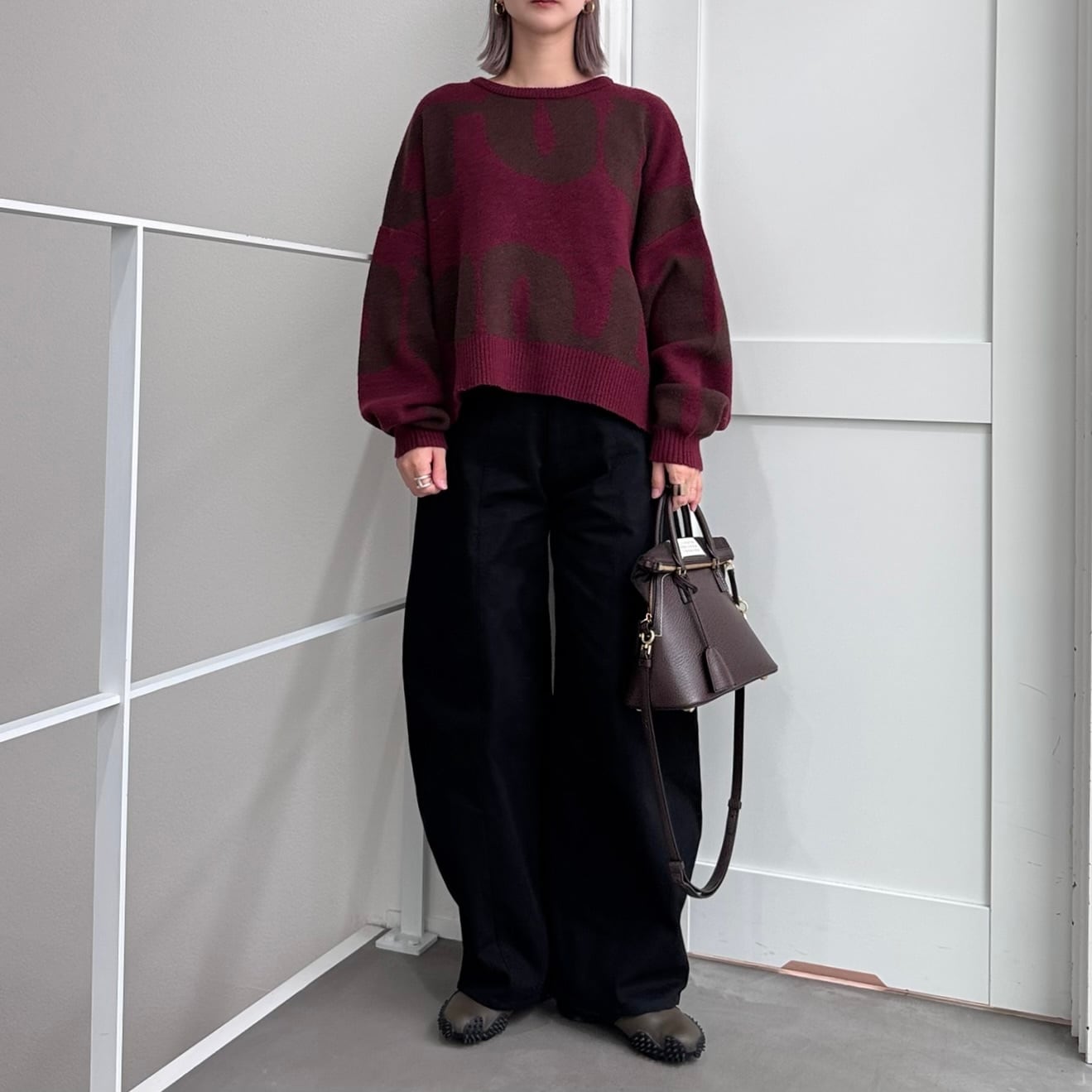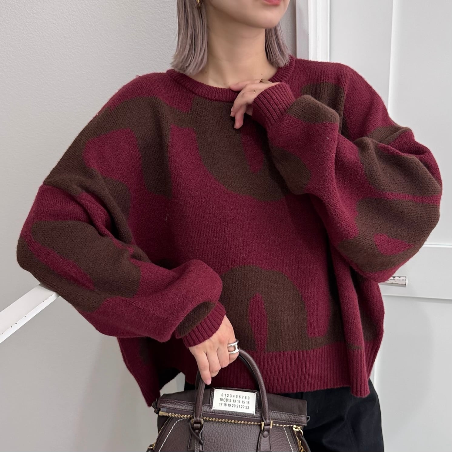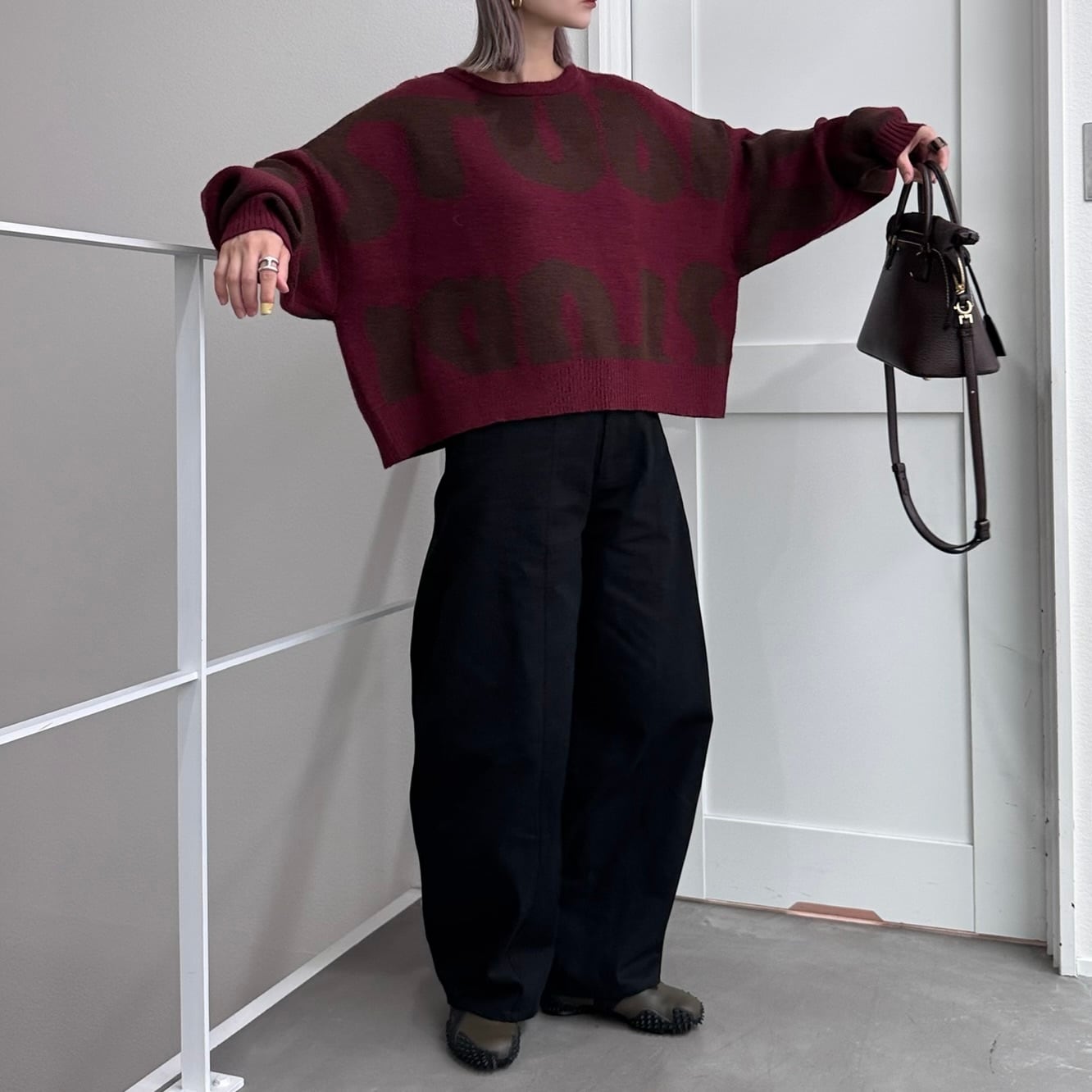 大胆なロゴ柄をジャカード編みで表現したプルオーバーニット。存在感のあるビッグモチーフが目を惹き、シンプルなコーディネートに投入するだけでスタイリングの主役になる一枚です。二重構造で編み立てられているため、ふっくらとした厚みと軽さを兼ね備えています。ボリュームのある袖と短めの着丈のバランスが絶妙で、ワイドパンツやスカートとも合わせやすいアイテムです。
